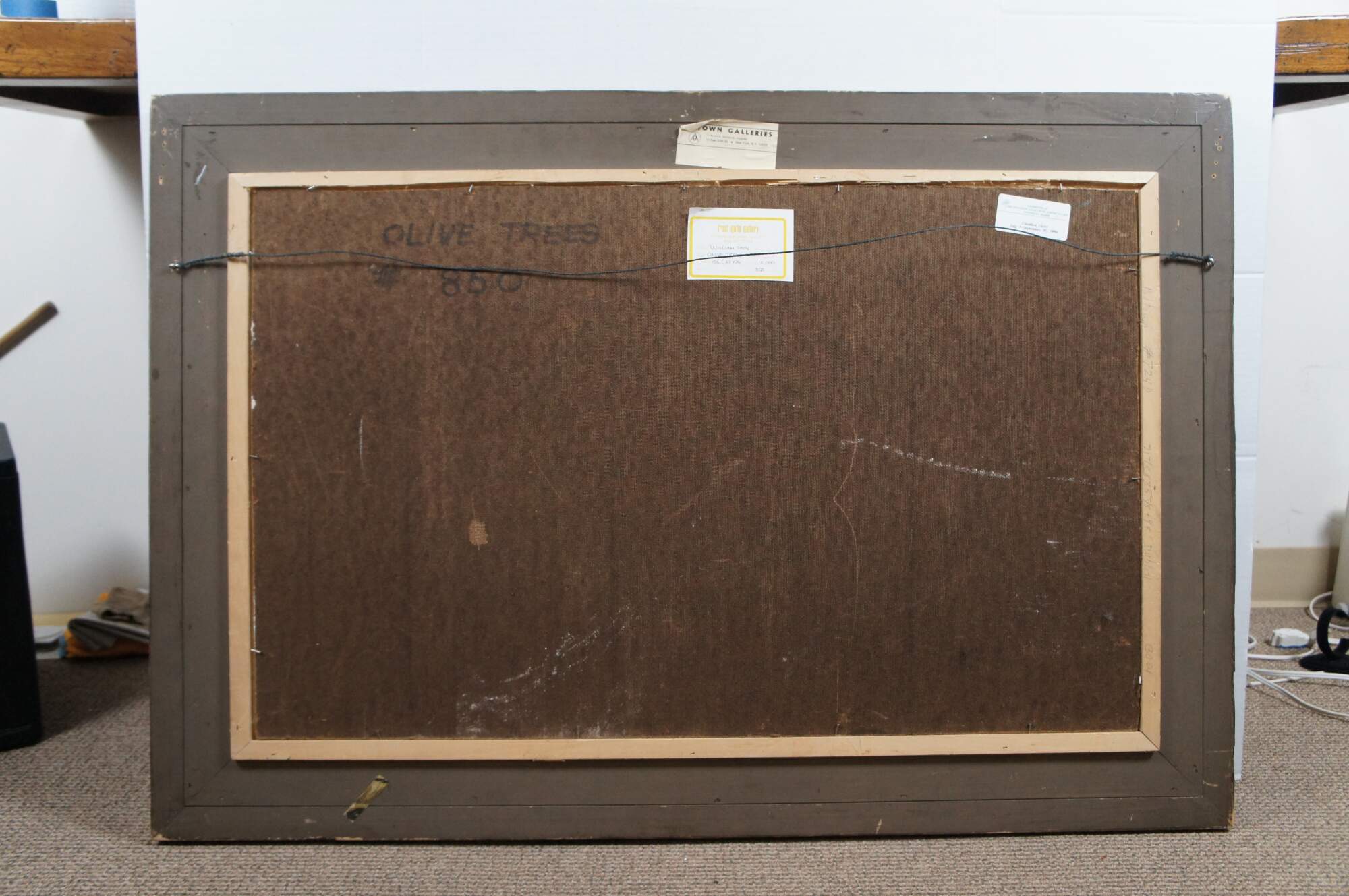 Mid 20th century oil on board landscape painting by William Thon, titled "Olive Trees," No. 850. Shows an abstract expressionist forestscape with black trunked trees whith green and white leaves over a golden forest floor. Signed lower right corner. Rustic wood frame with red stained recessed bevel and white linen mat. Labels on reverse from Midtown Galleries (New York, New York), Frost Gully Gallery (Portland, Maine). Exhibited at The Ogunquit Museum of American Art (Ogunquit, Maine) - "Creative Lives" July 1 - September 30, 1996.