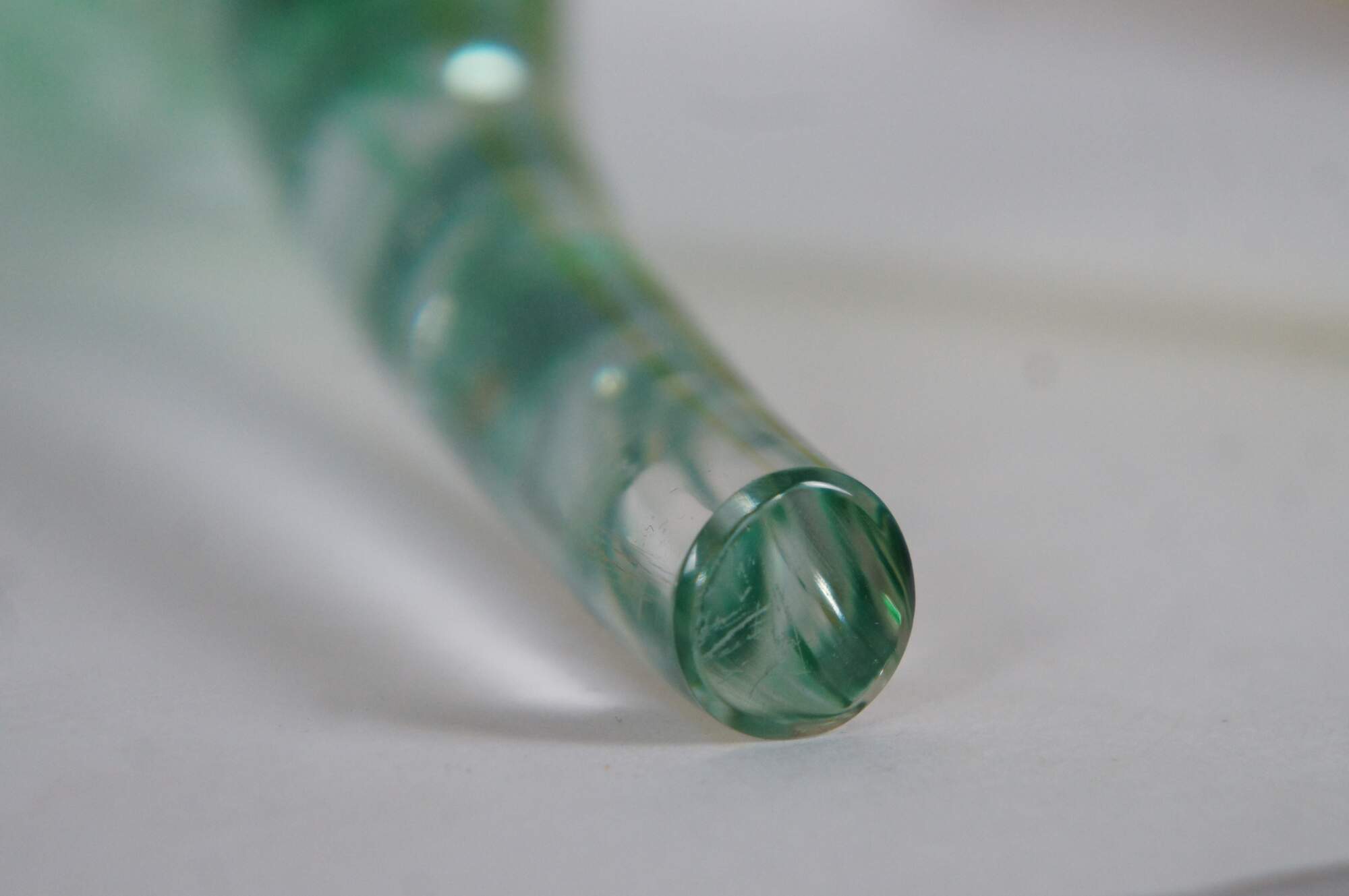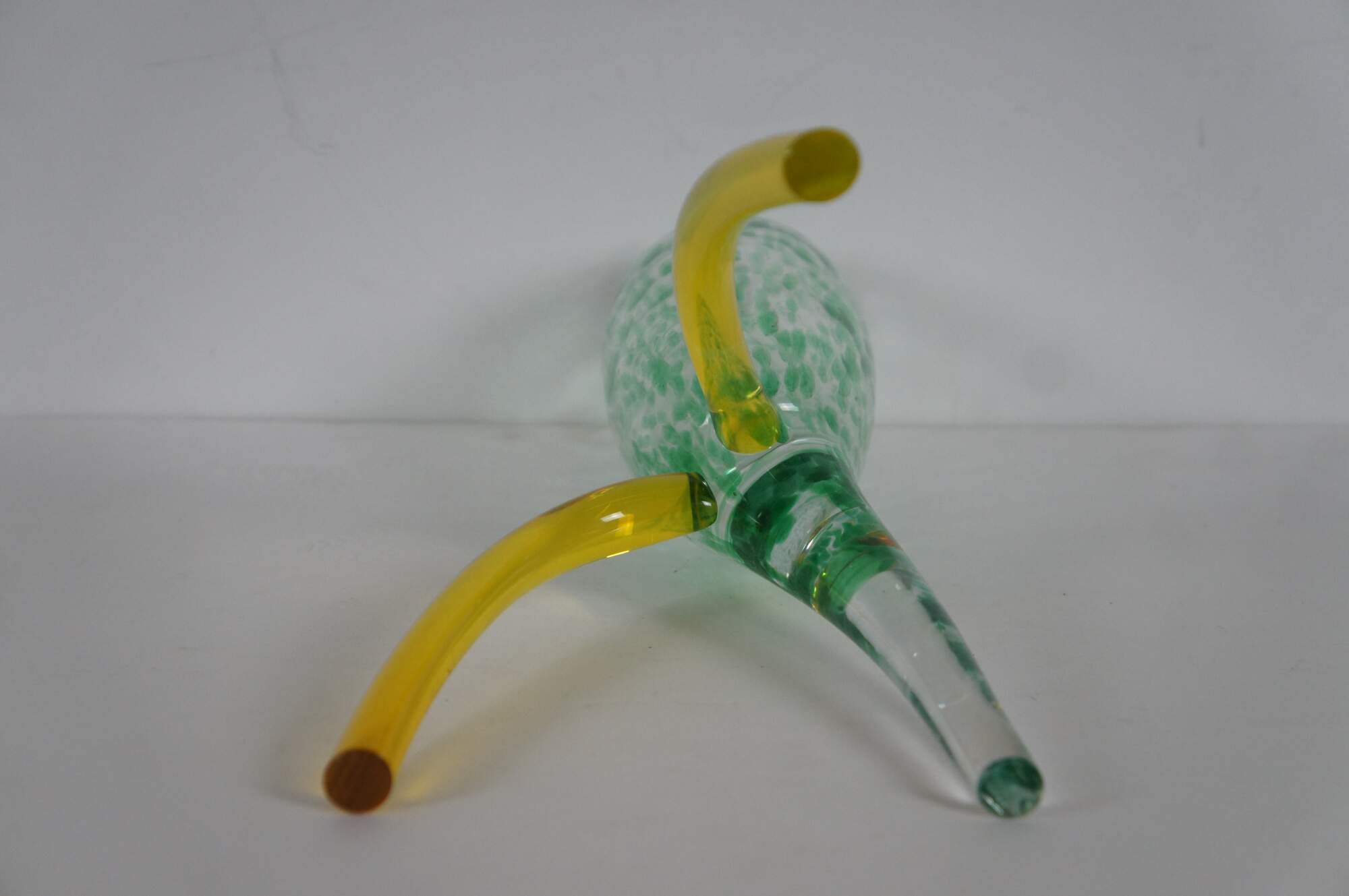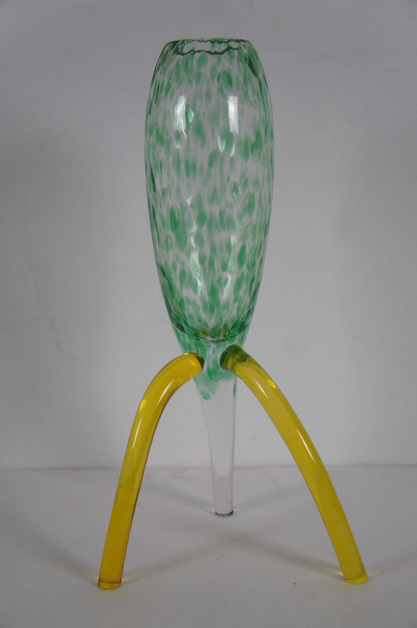 BRENNER-NÜNLIST Hand blown art glass vase with a uniquely styled shape reminiscent of a mid century rocket ship. Clear glass oblong body and "tail" speckled with translucent green flecks, additionally supported with a pair of bowed yellow legs.