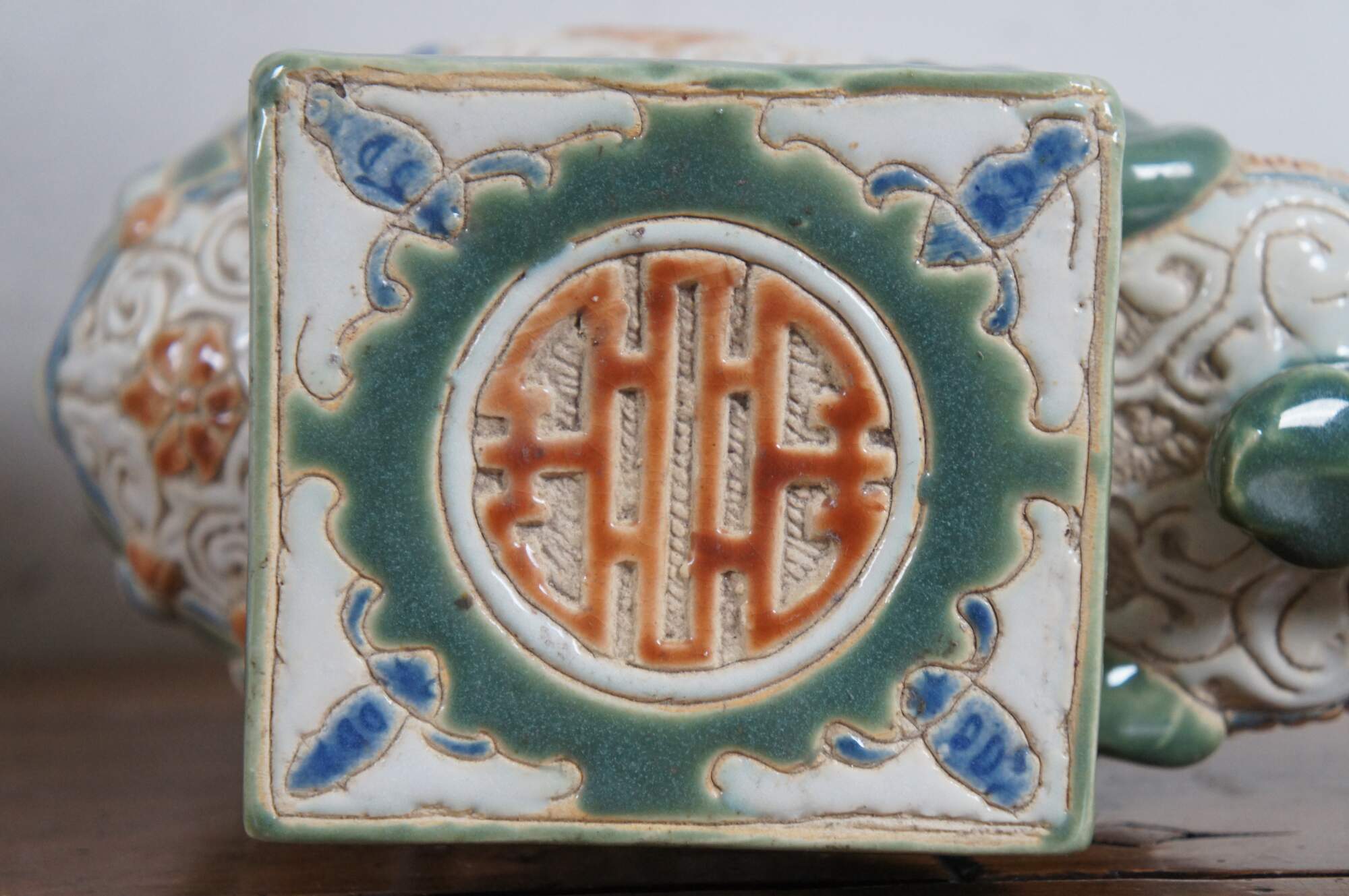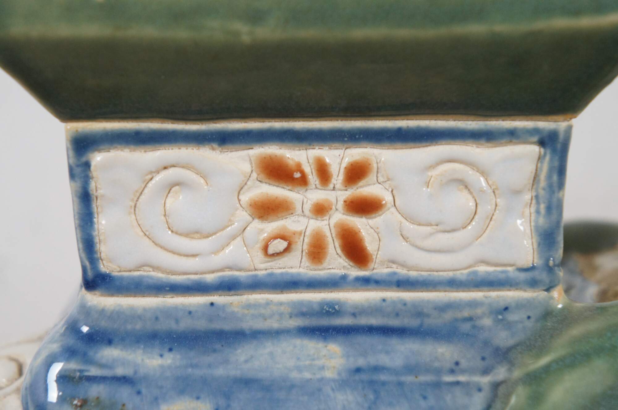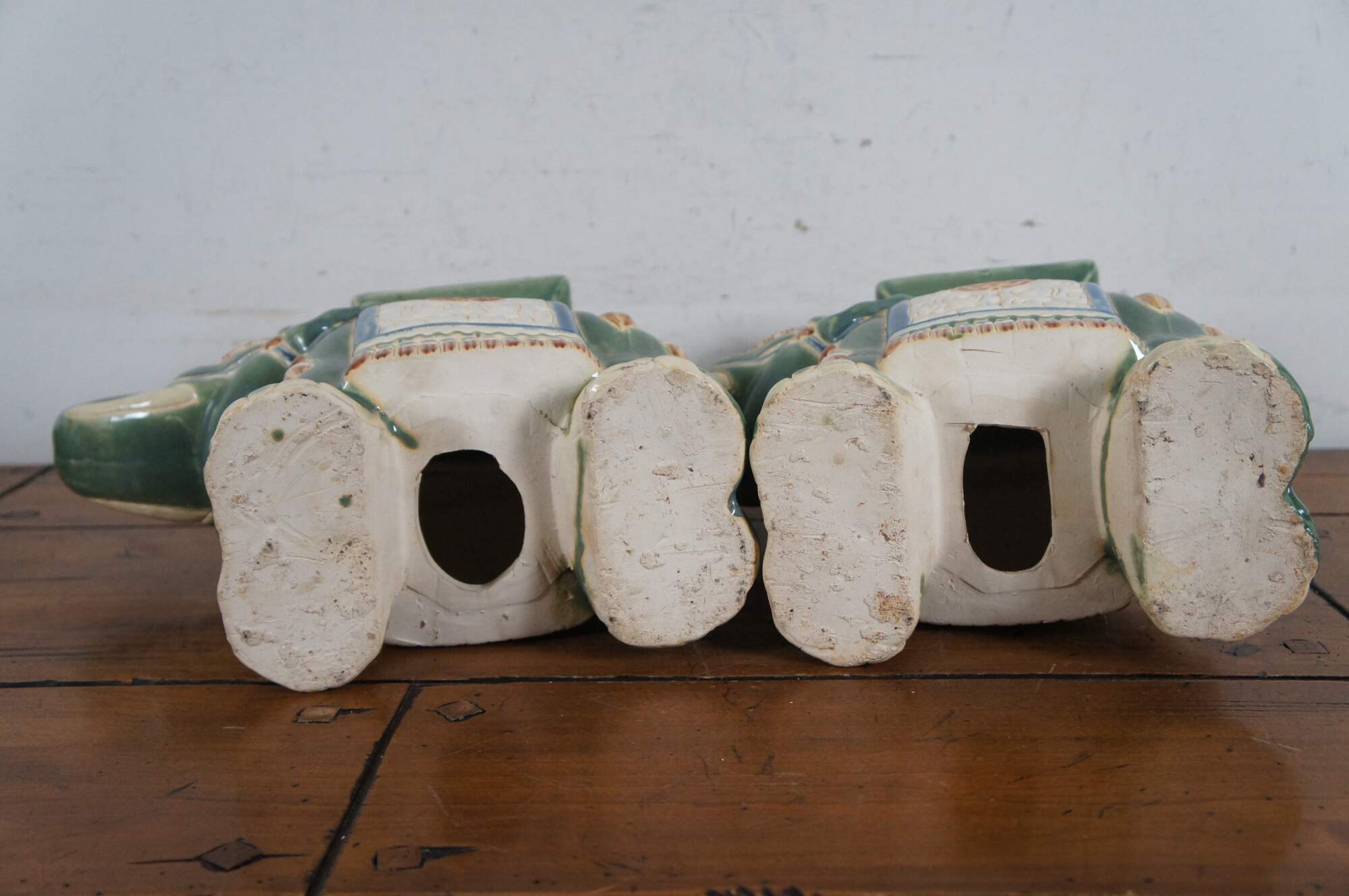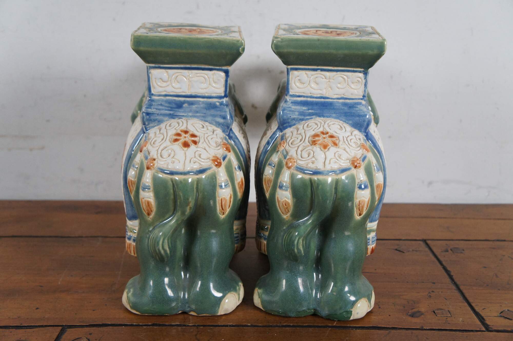 Pair of vintage majolica style ceramic plant / candle stands / garden stools / Bookends in the shape of green Asian elephants with raised trunks, decorated with coverings in white, blue, and orange.