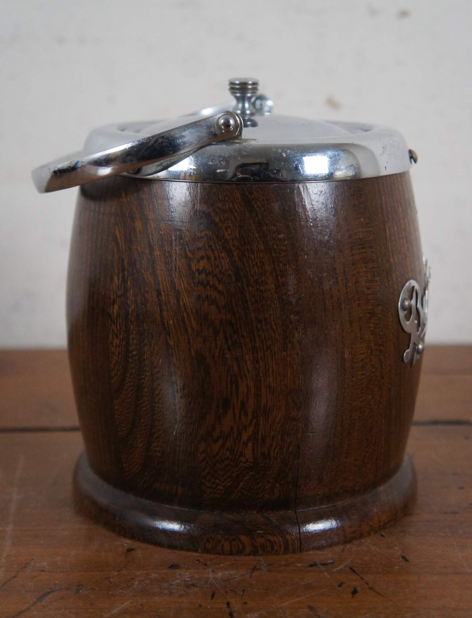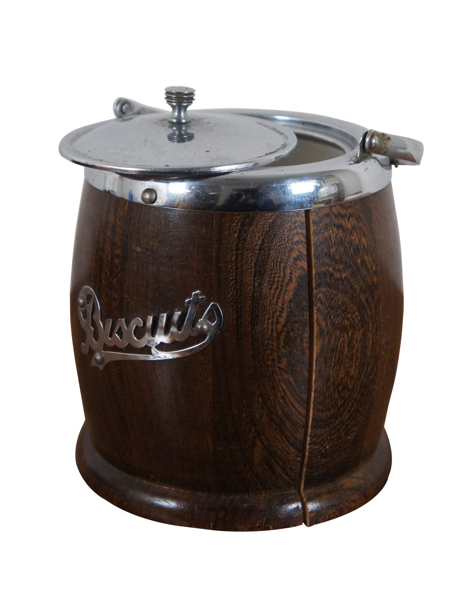 Mid 20th century biscuit / cookie barrel by Lancraft Woodware. Features a traditional barrel shape in dark wood with footed base. Chrome rim, bail handle, lid, and the word "Biscuits" applied to one side. Interior is line in white ceramic.