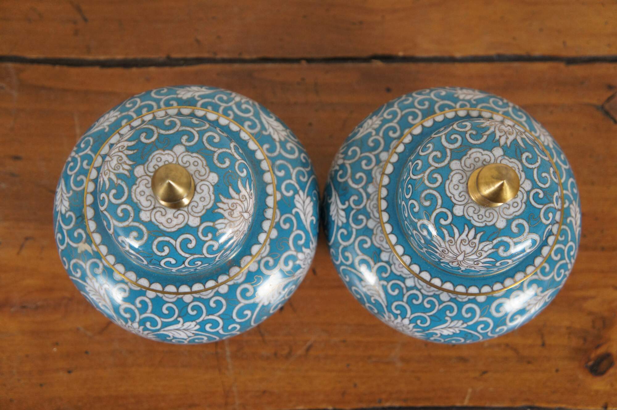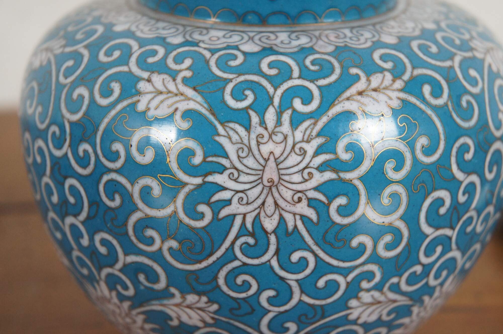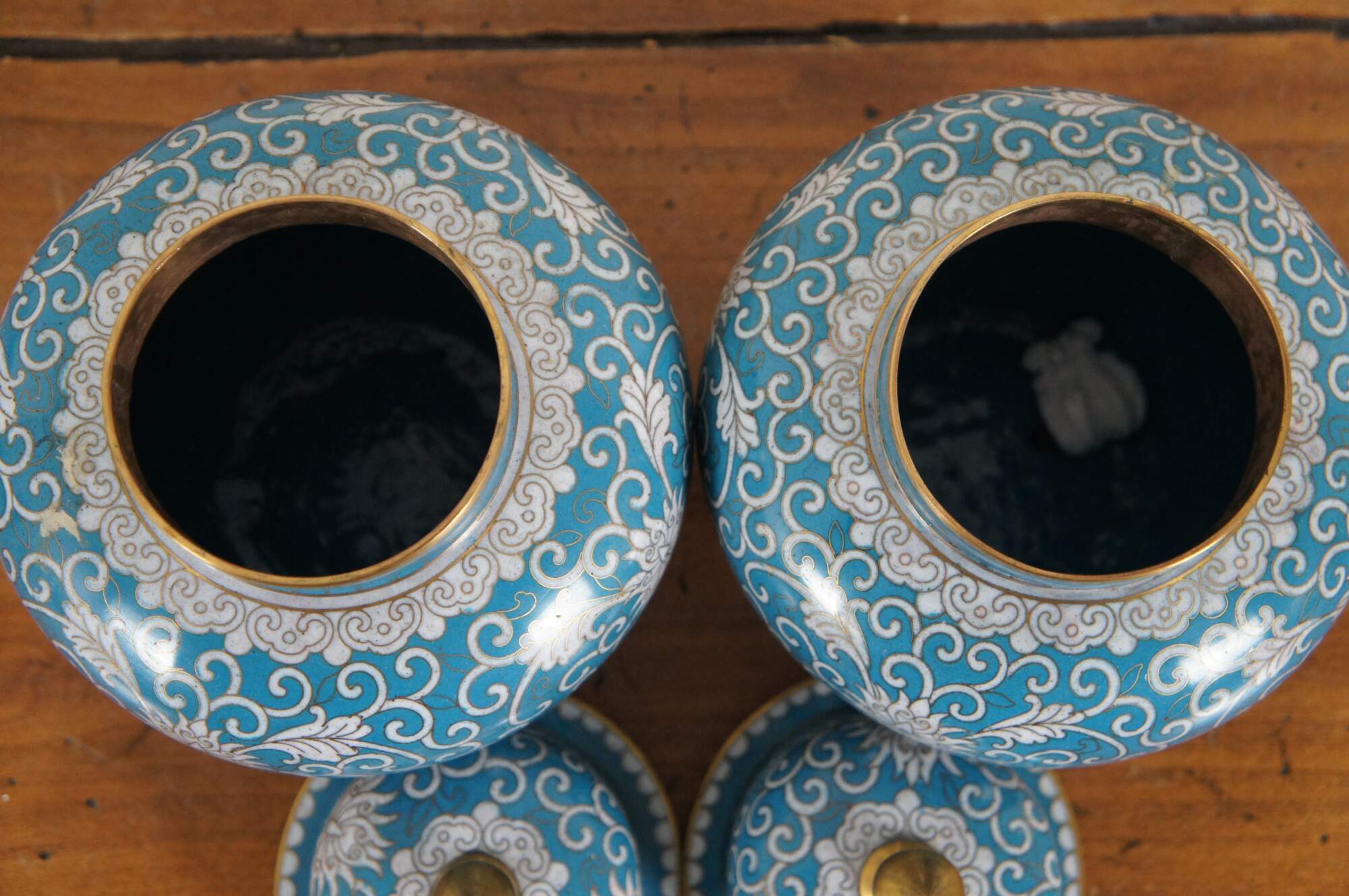 Pair of antique cloisonné ginger jars with lids featuring a design of chrysanthemums and swirling tendrils in white on a turquoise blue ground. Made in China, circa 1890-1910