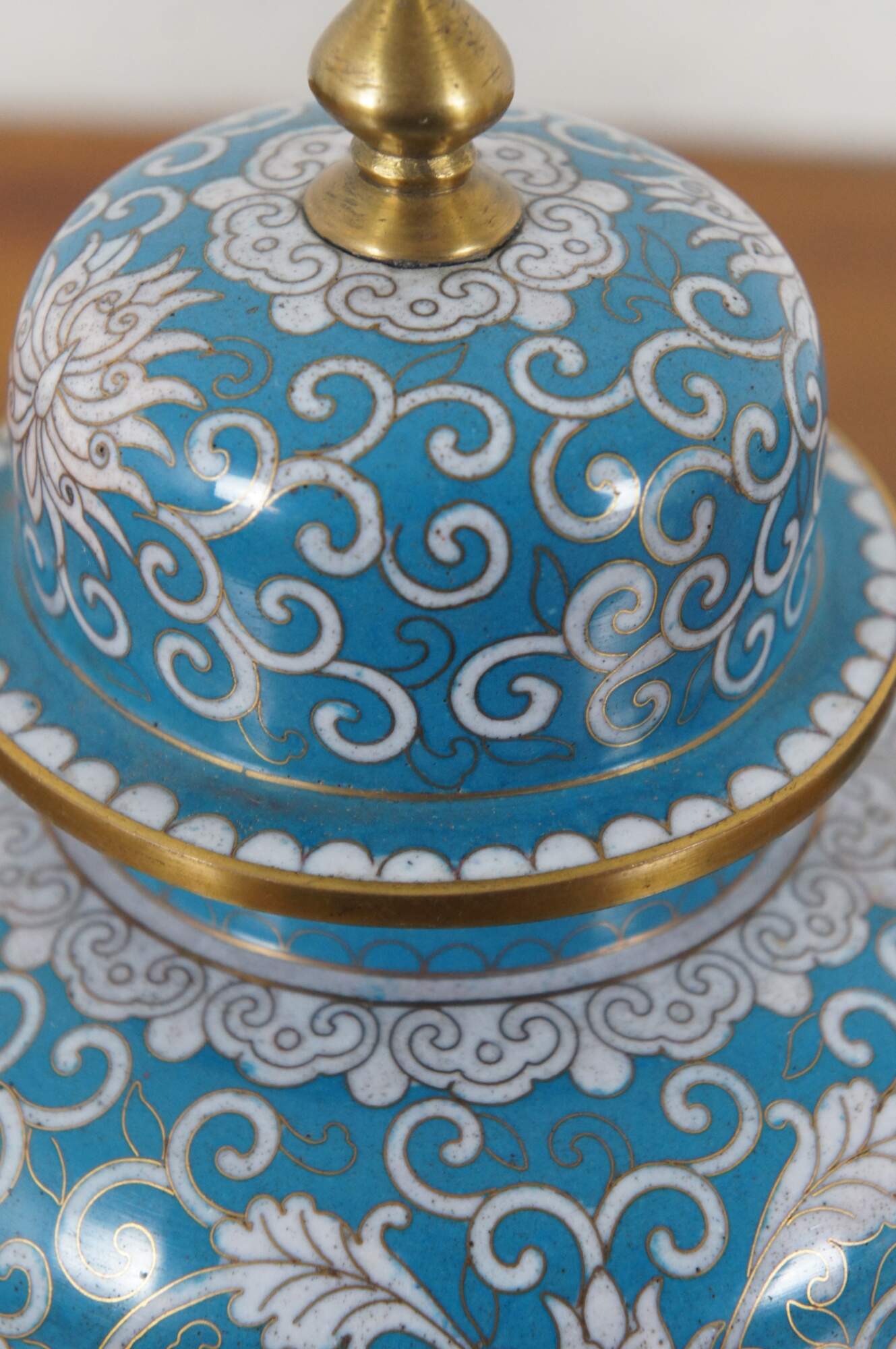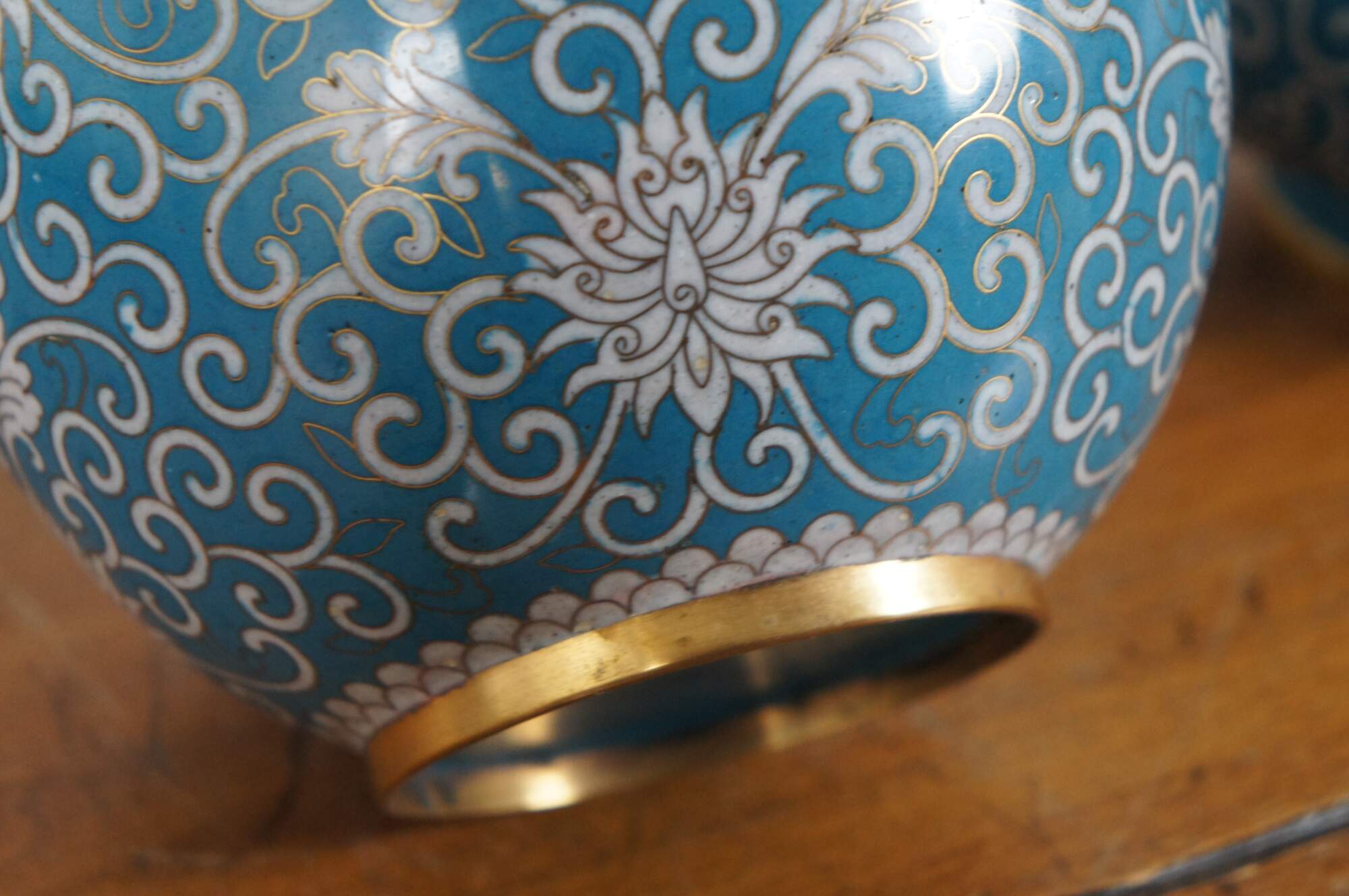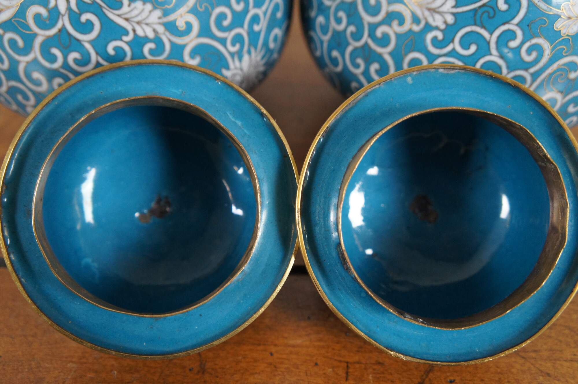 Pair of antique cloisonné ginger jars with lids featuring a design of chrysanthemums and swirling tendrils in white on a turquoise blue ground. Made in China, circa 1890-1910