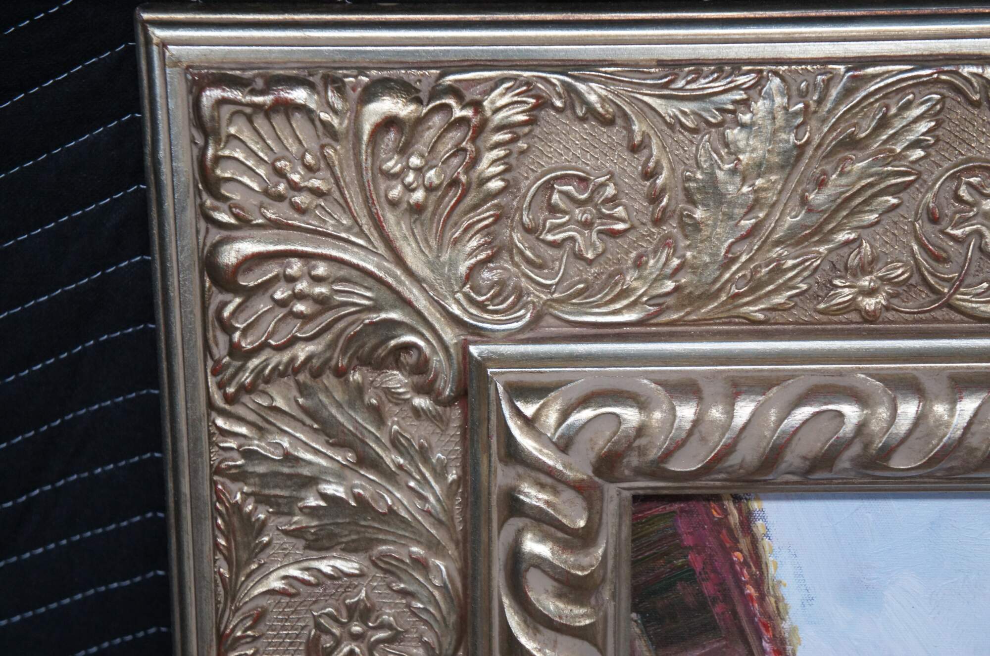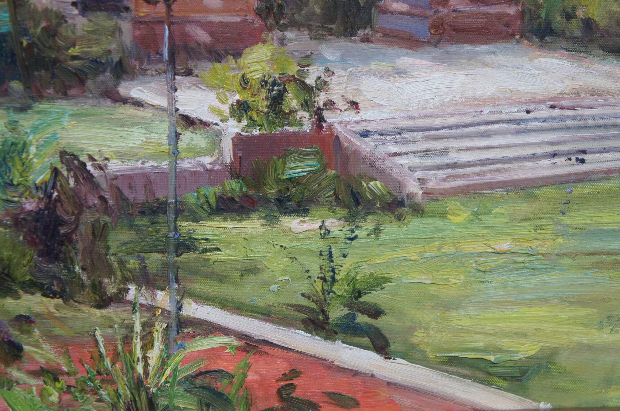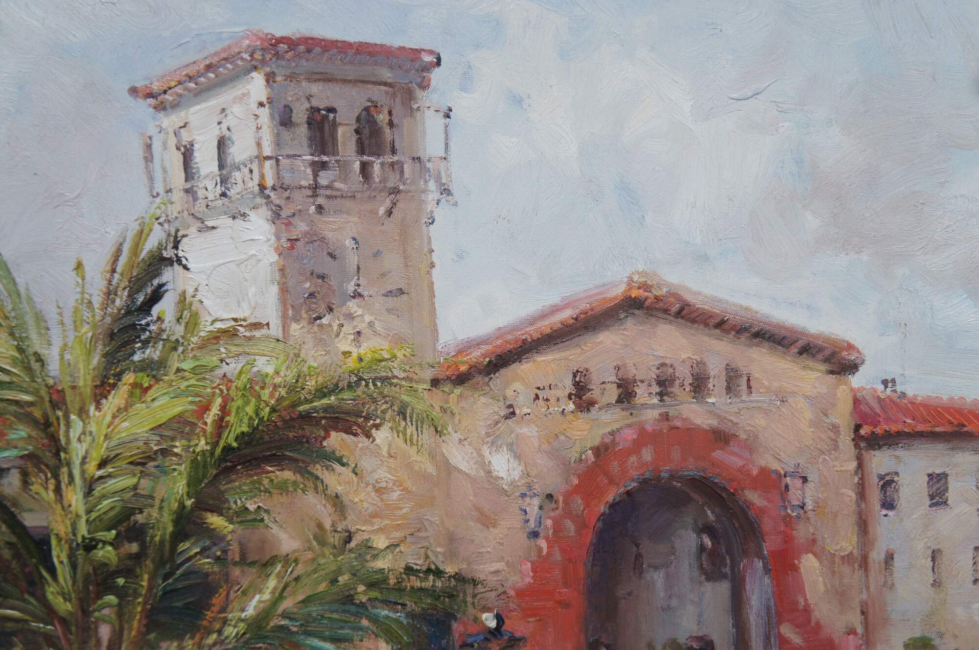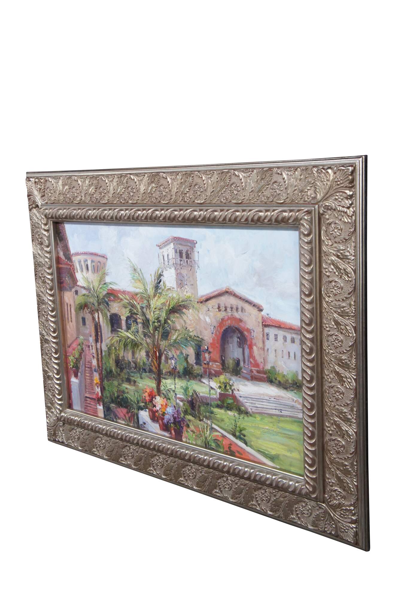 A Beautiful vintage Tuscan landscape oil painting on canvas featuring a Villa Estate view of the courtyard garden with palm trees, flowers and beautiful architecture. Framed in ornate silver floral acanthus frame.