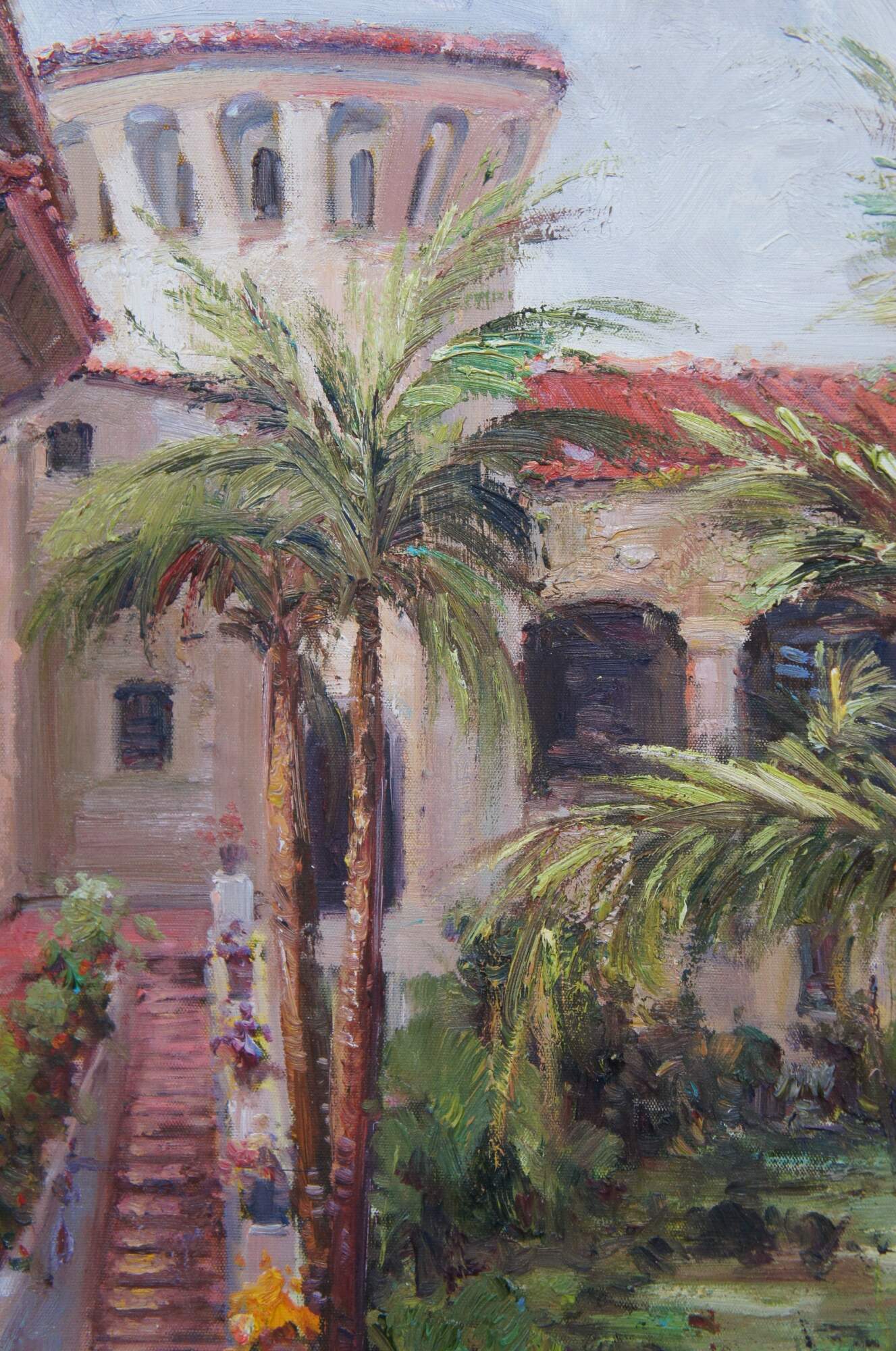 Vintage oil painting of the Sunken Gardens at the Santa Barbara Courthouse in CA . The gardens sit on Anapamu Street downtown at the Santa Barbara Courthouse, which is known as one of the country’s most beautiful buildings
