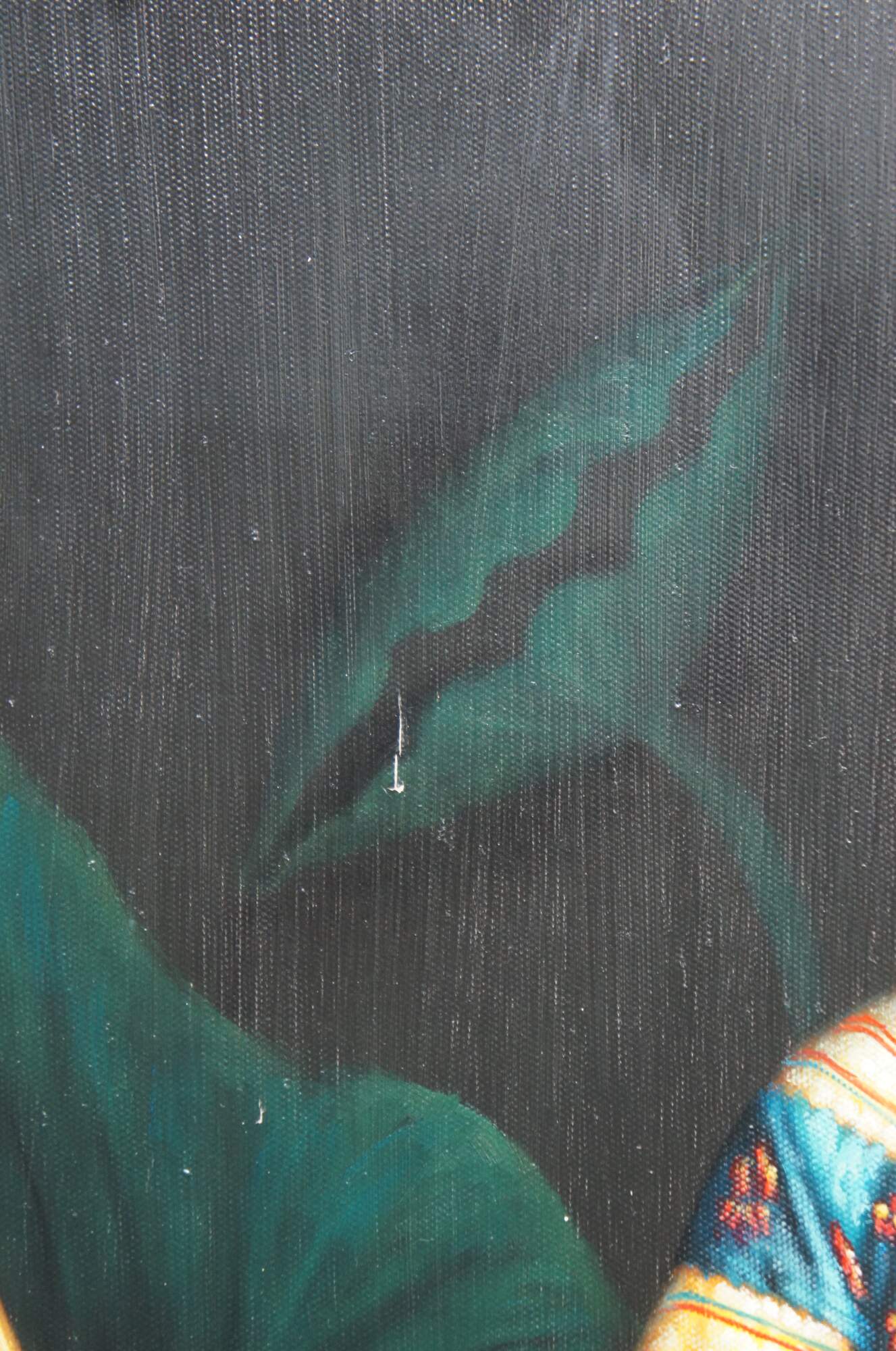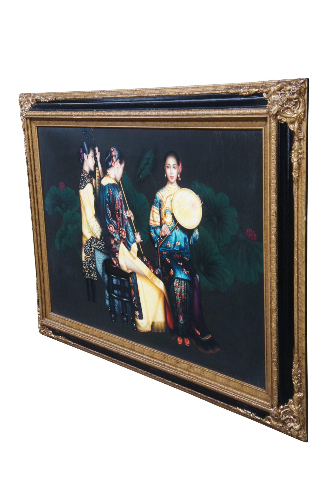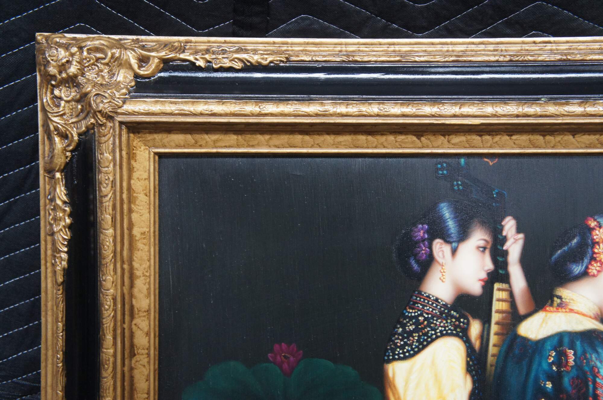 Vintage trio of Chinese woman playing instruments oil painting on canvas after Chen Yifei. Features three young musicians in traditional court attire playing various instruments.