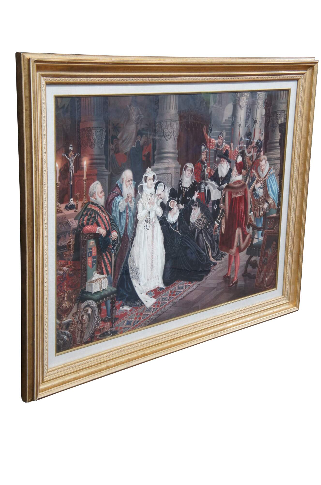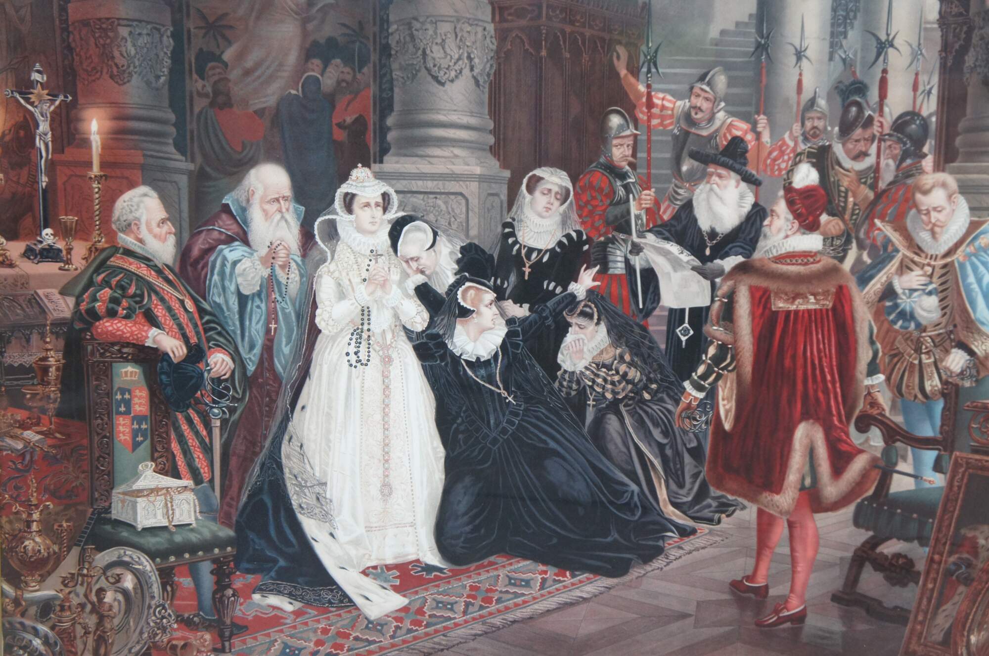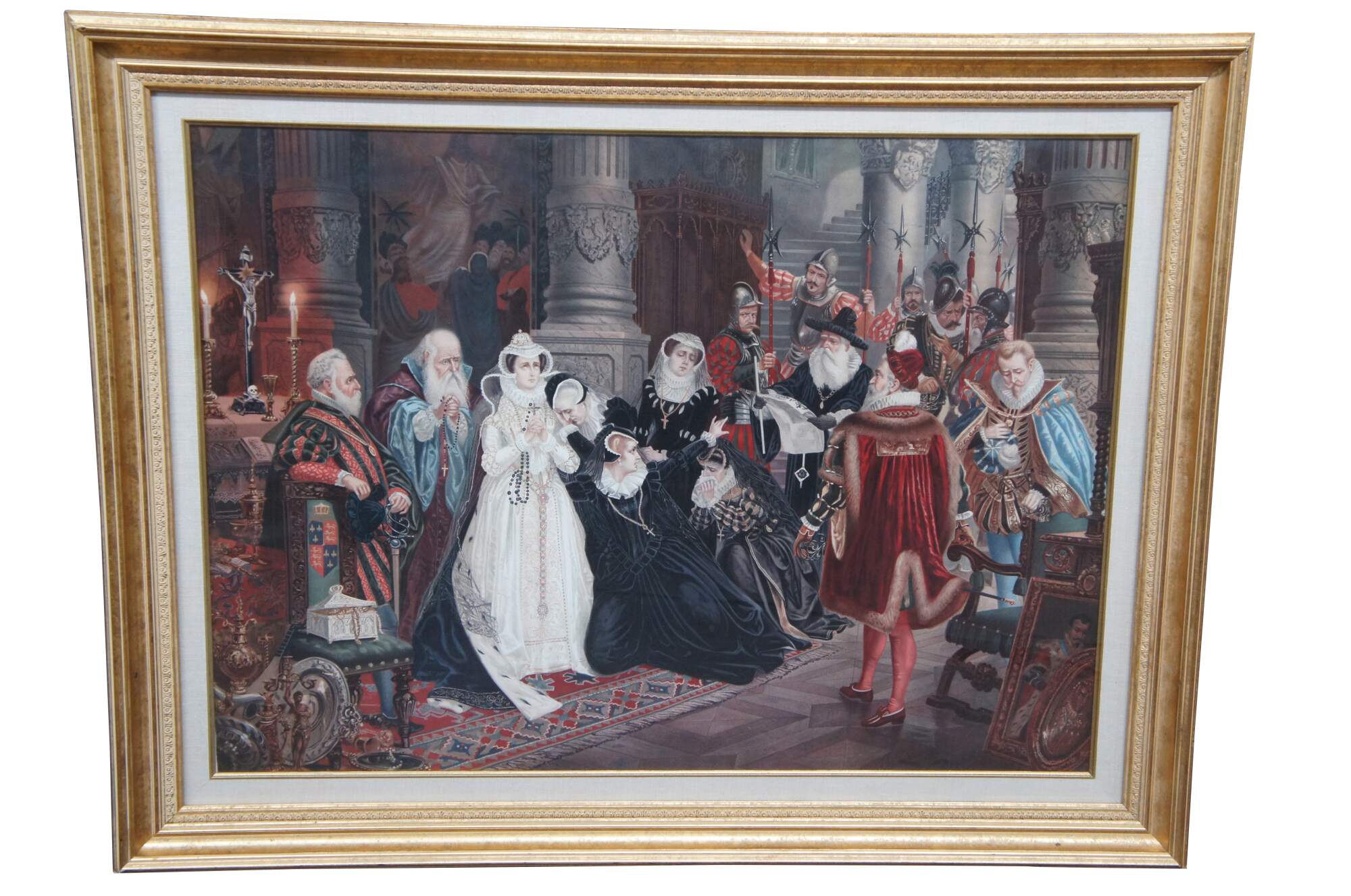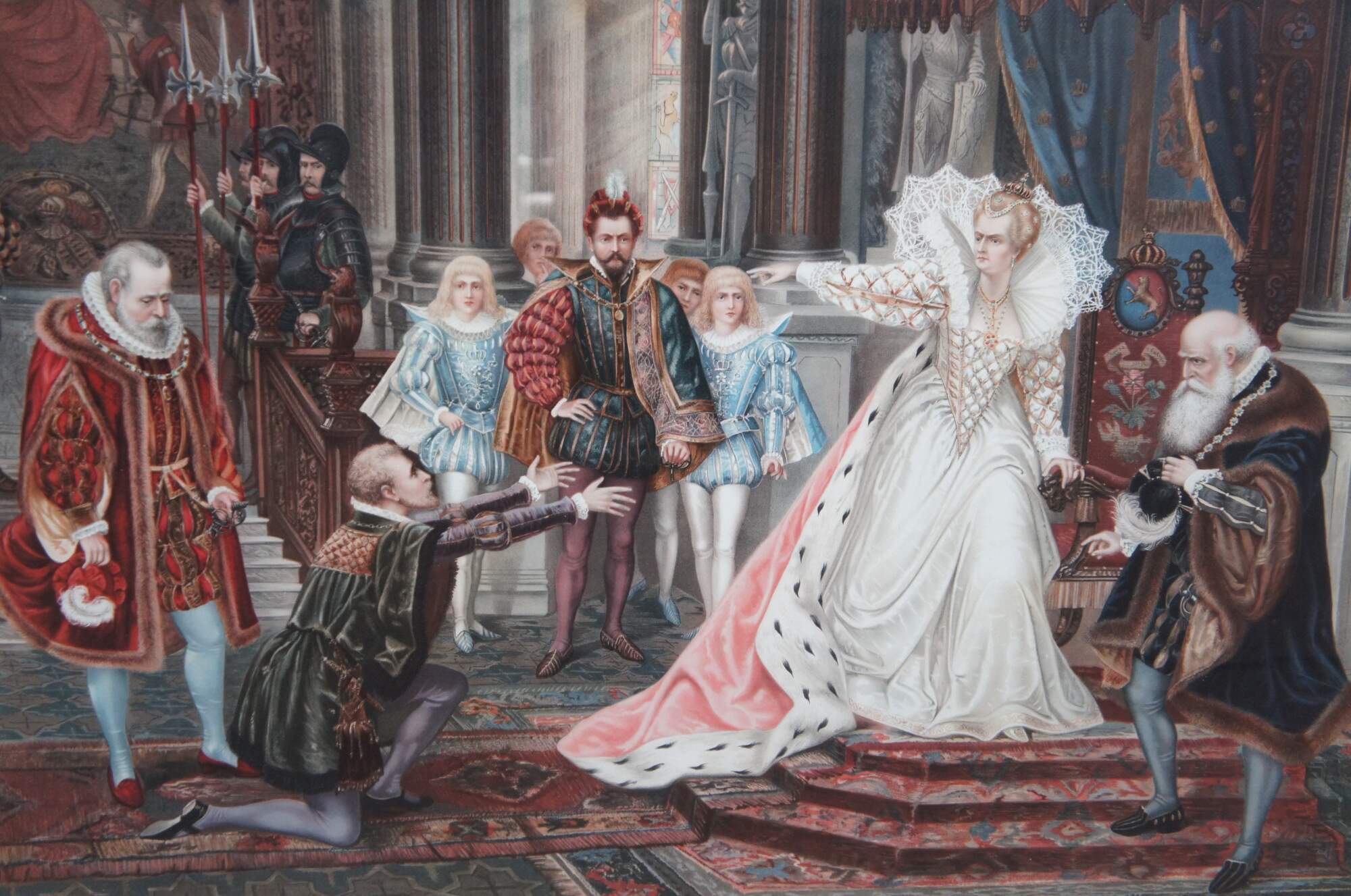 Two vintage Elizabethan court scene prints. One features Queen Elizabeth banishing a peasant, while the other features praying clergy and weeping women. The elaborate attire and decor of the 16th century is on full display with rugs, tapestries, art, sculpture and treasures adorning the walls and floors of the magnificent interior. Heraldic crests / coats of arms decorate the furniture, while the men and women of high status display elaborate jewels and soldiers hold spears and swords to enforce order.