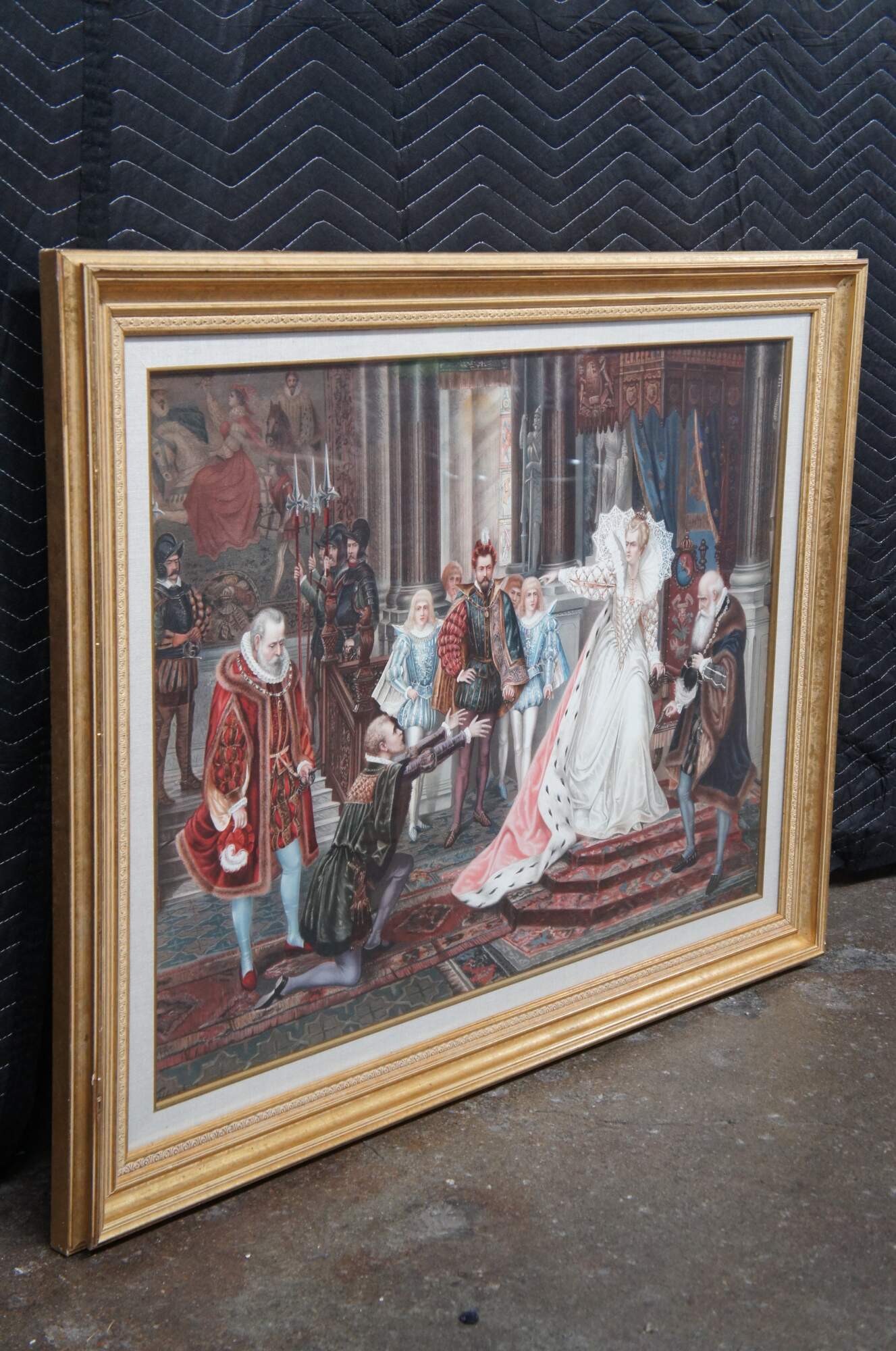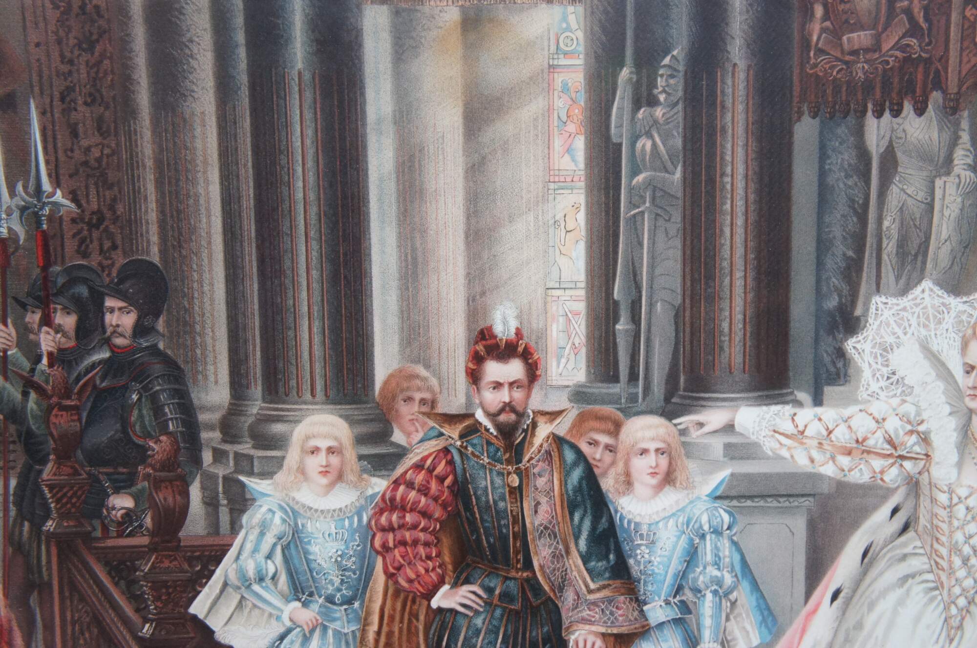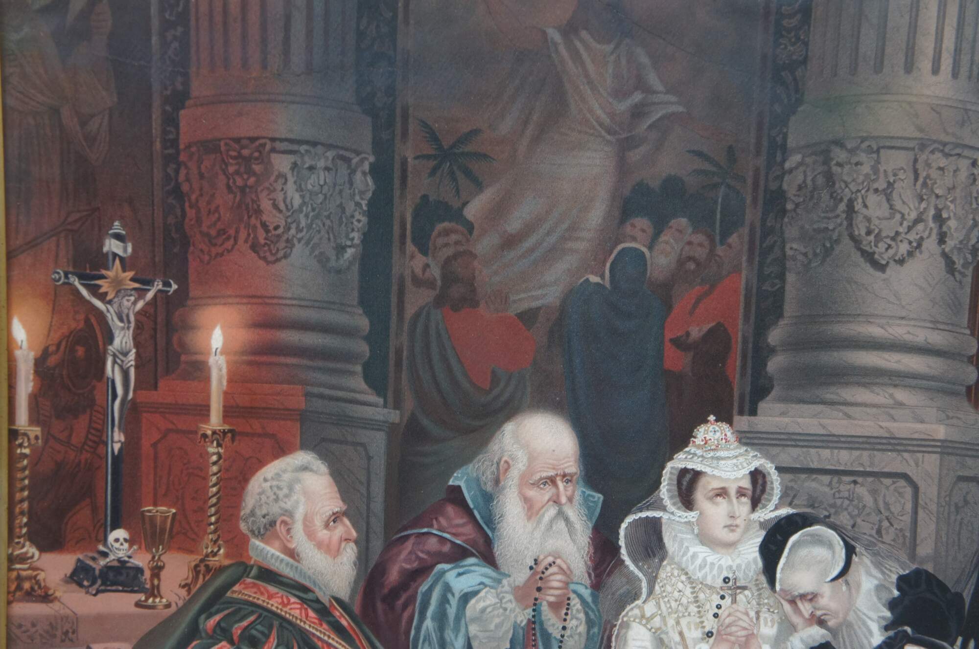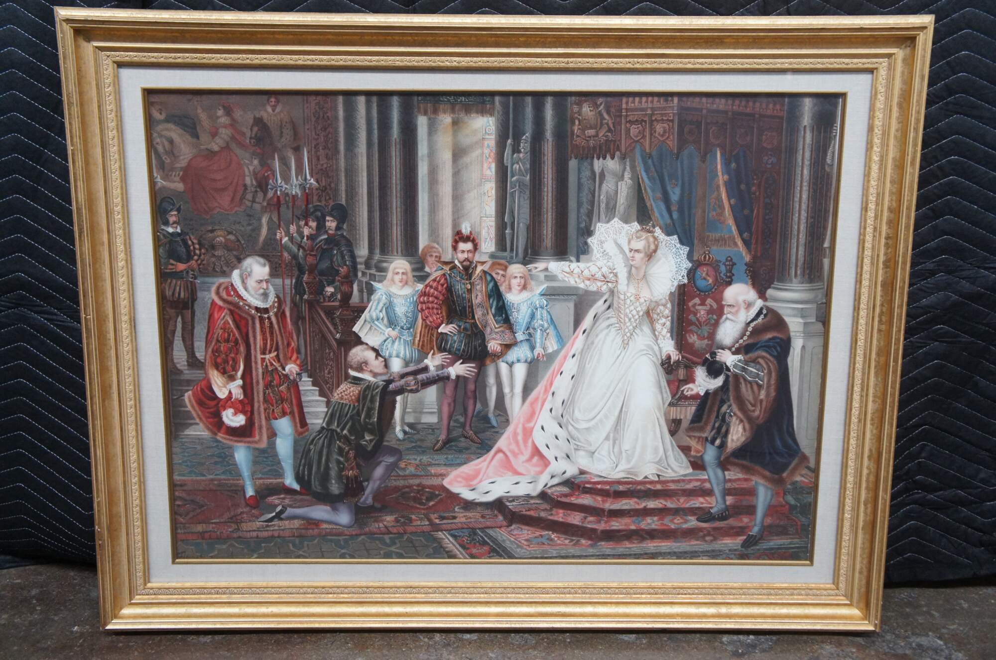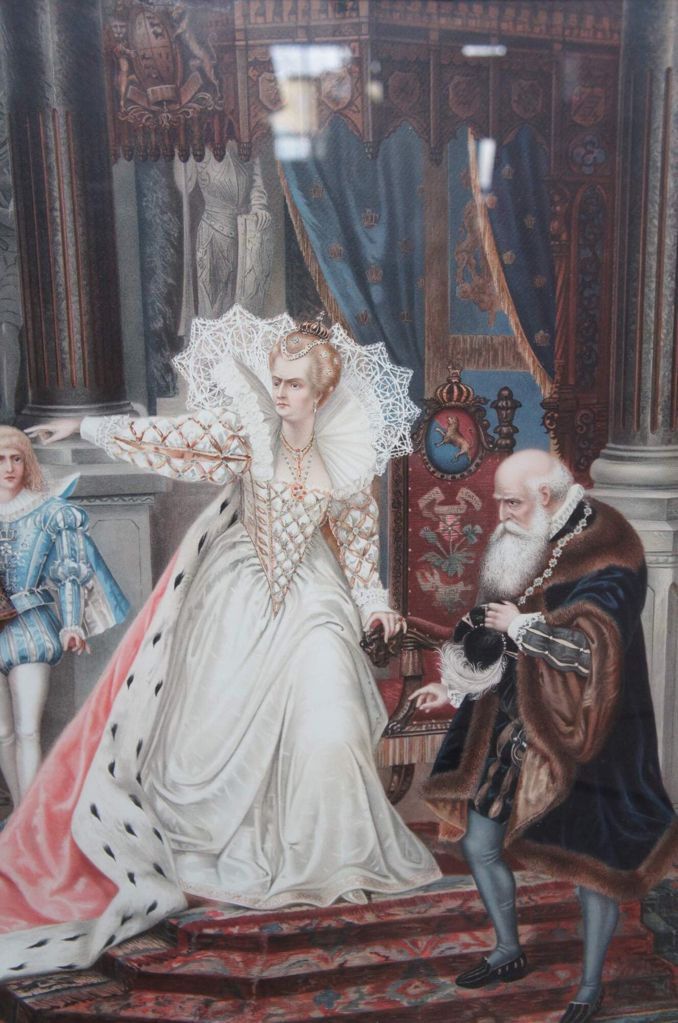 Two vintage Elizabethan court scene prints. One features Queen Elizabeth banishing a peasant, while the other features praying clergy and weeping women. The elaborate attire and decor of the 16th century is on full display with rugs, tapestries, art, sculpture and treasures adorning the walls and floors of the magnificent interior. Heraldic crests / coats of arms decorate the furniture, while the men and women of high status display elaborate jewels and soldiers hold spears and swords to enforce order.