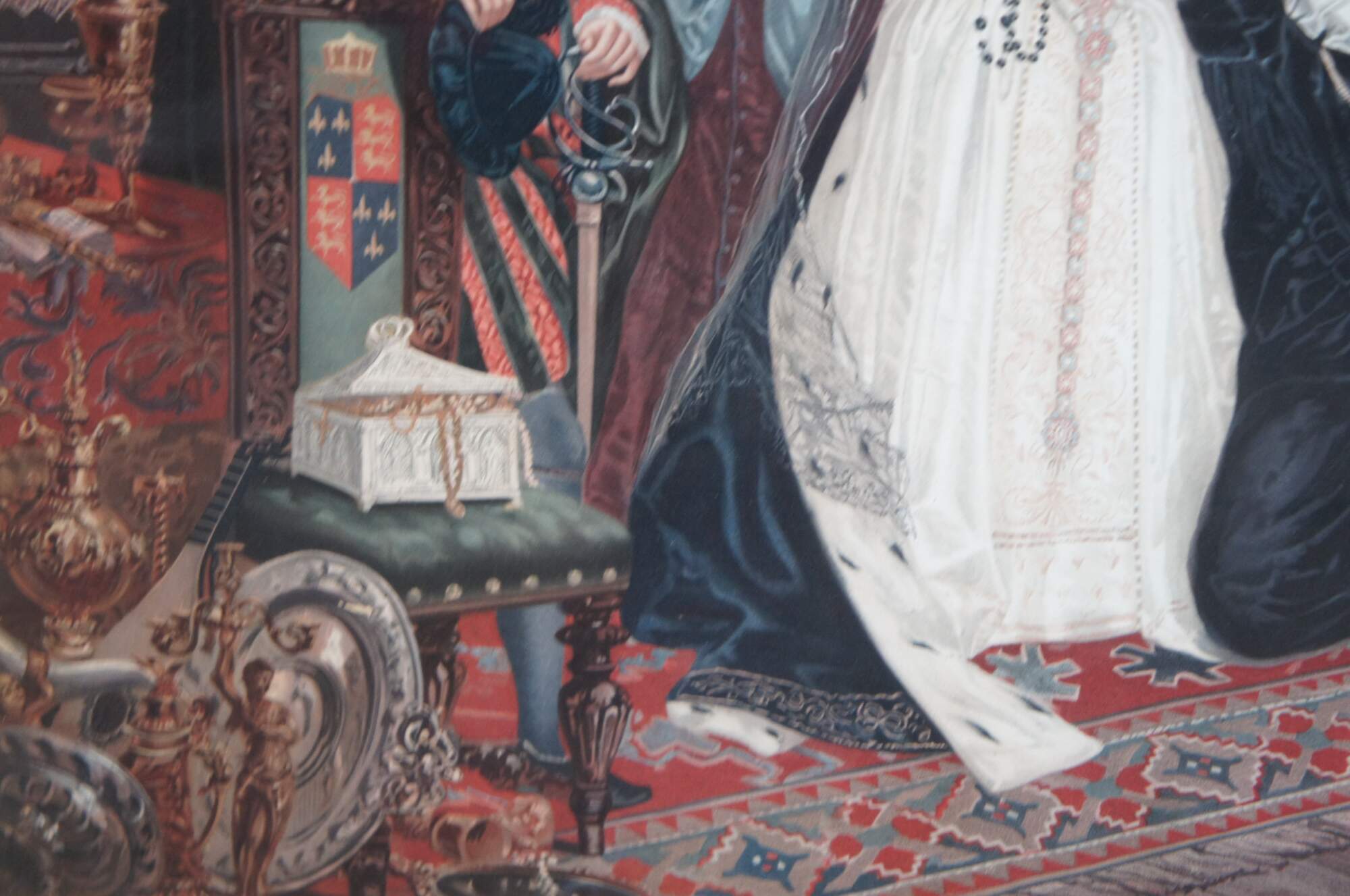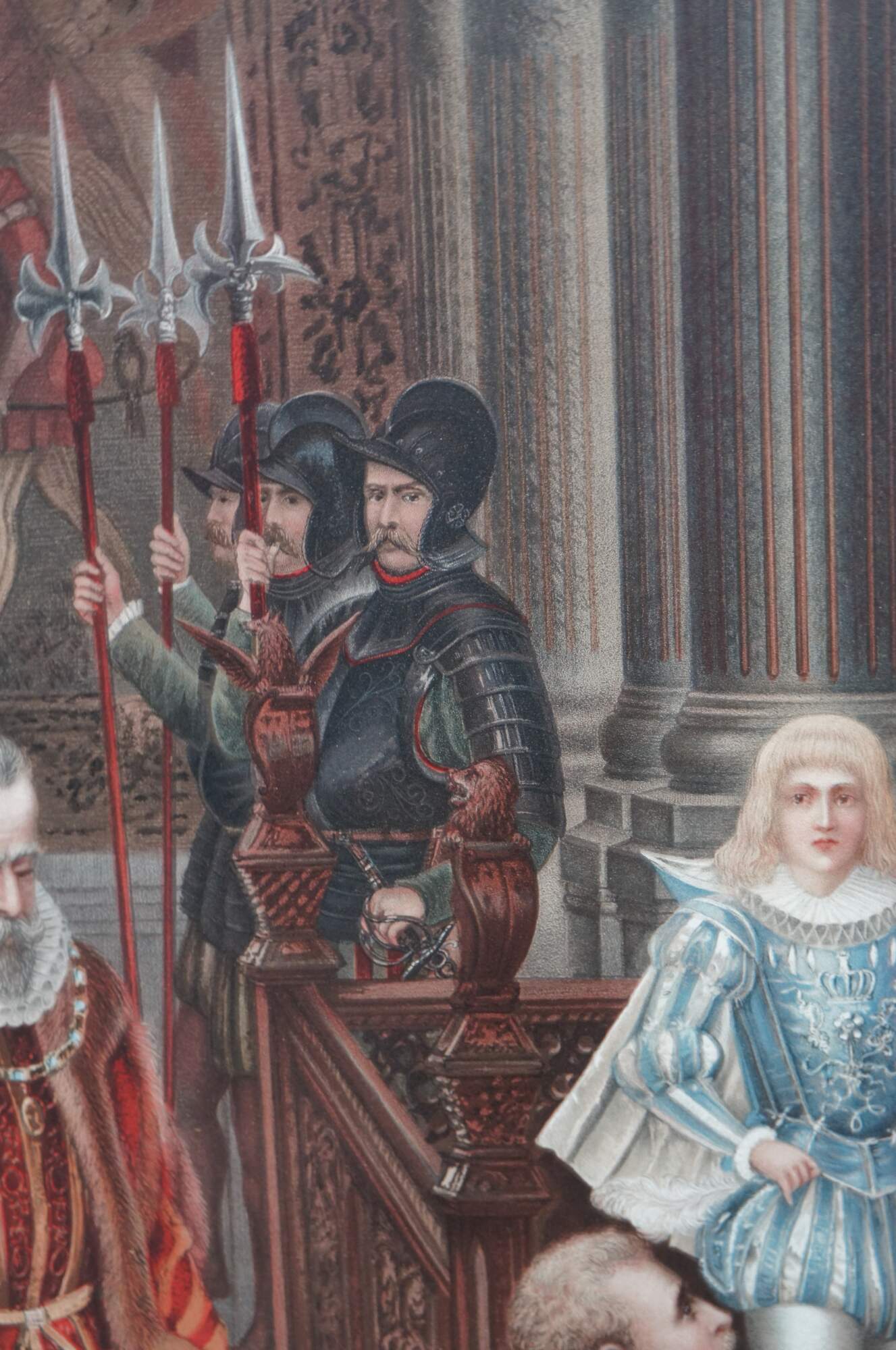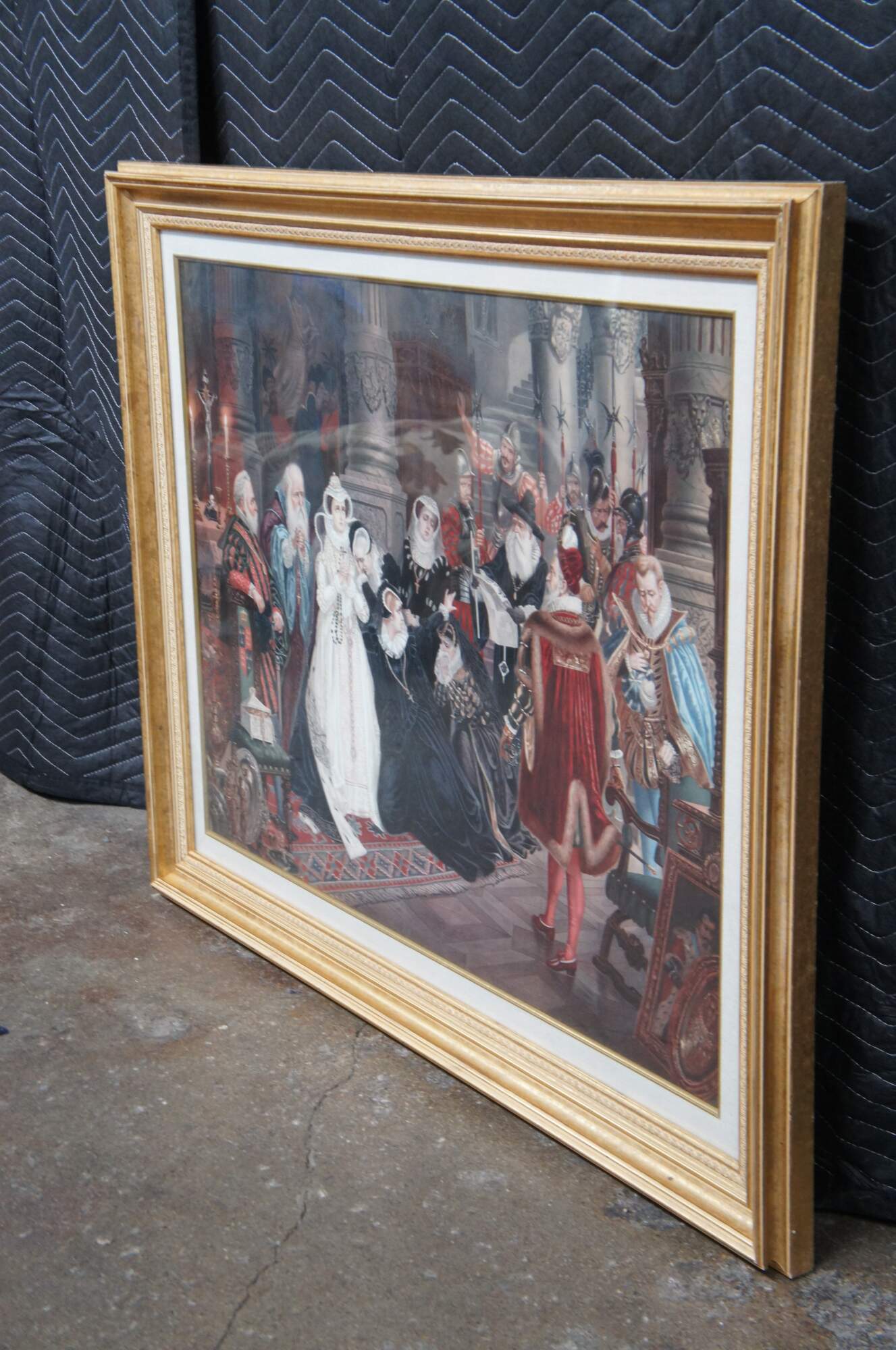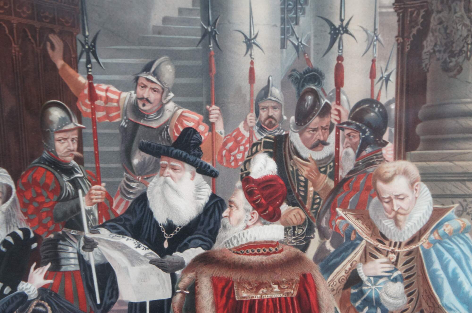 Two vintage Elizabethan court scene prints. One features Queen Elizabeth banishing a peasant, while the other features praying clergy and weeping women. The elaborate attire and decor of the 16th century is on full display with rugs, tapestries, art, sculpture and treasures adorning the walls and floors of the magnificent interior. Heraldic crests / coats of arms decorate the furniture, while the men and women of high status display elaborate jewels and soldiers hold spears and swords to enforce order.