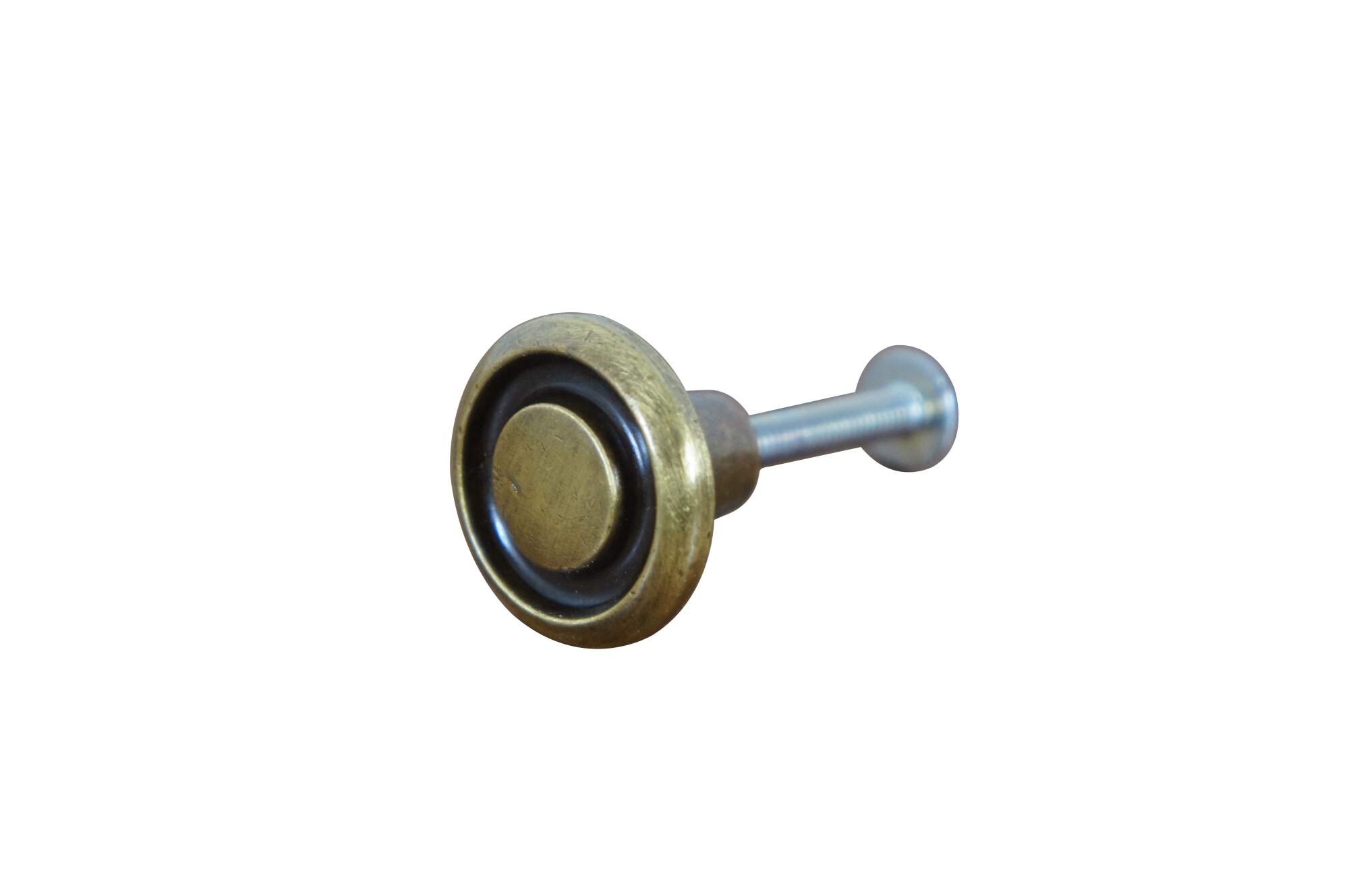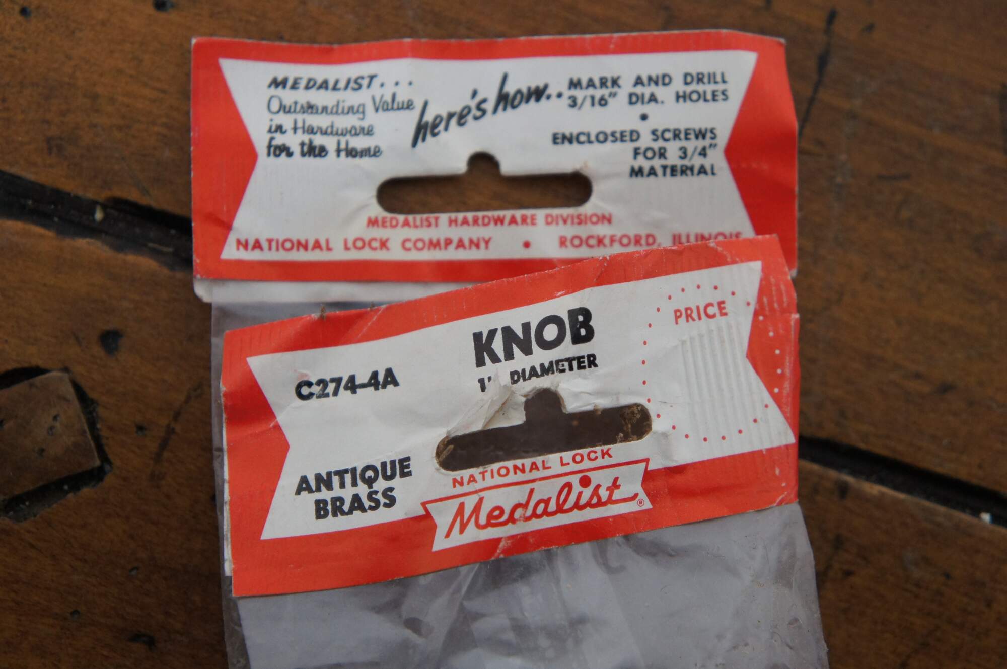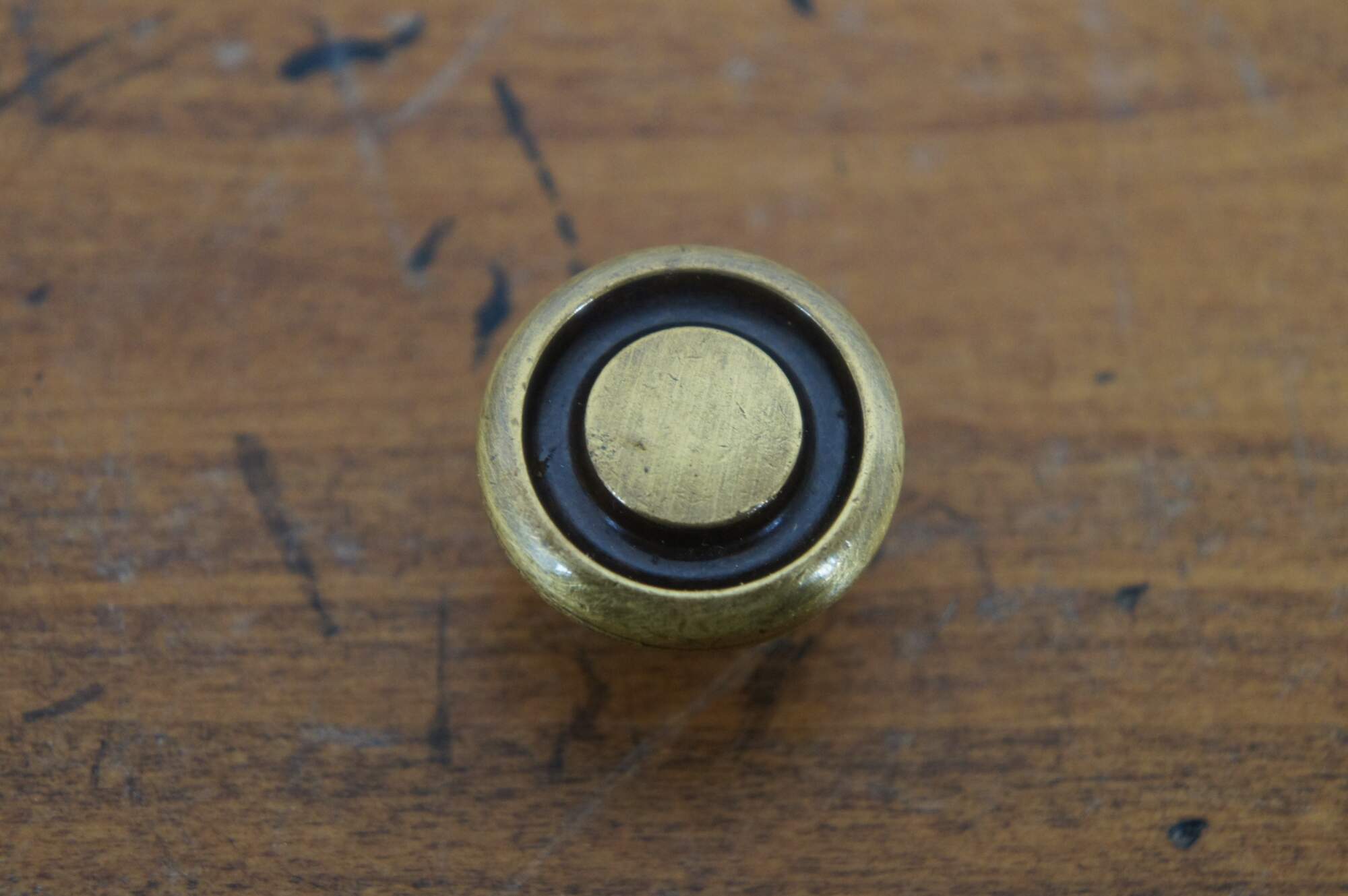 23 Available - Mid to late 20th century old-stock drawer / cabinet pulls. National Lock Company - Medalist, item number C274-4A Knob, Antique Brass. Round button shape with dark, recessed groove.