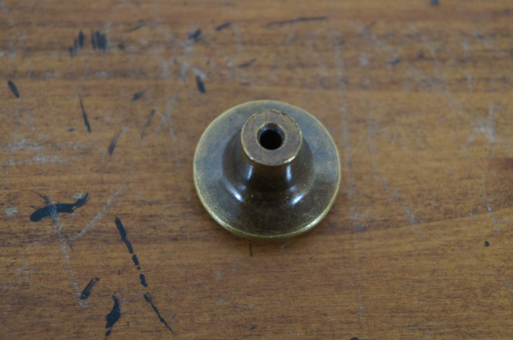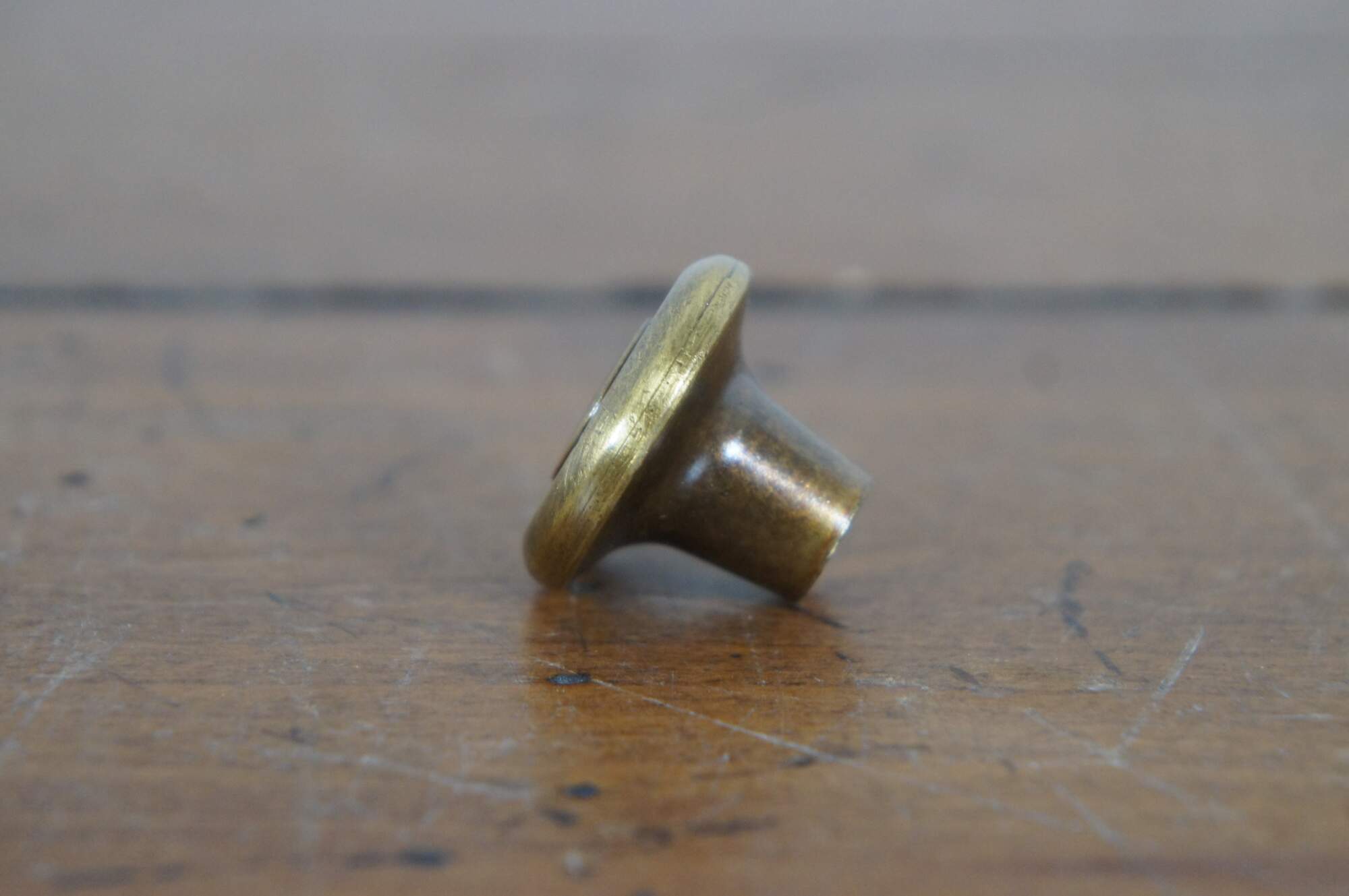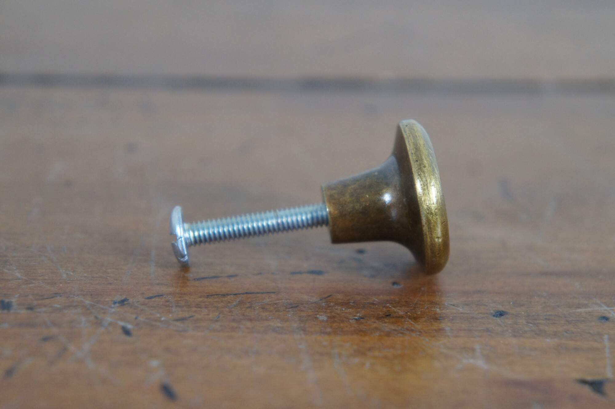 23 Available - Mid to late 20th century old-stock drawer / cabinet pulls. National Lock Company - Medalist, item number C274-4A Knob, Antique Brass. Round button shape with dark, recessed groove.
