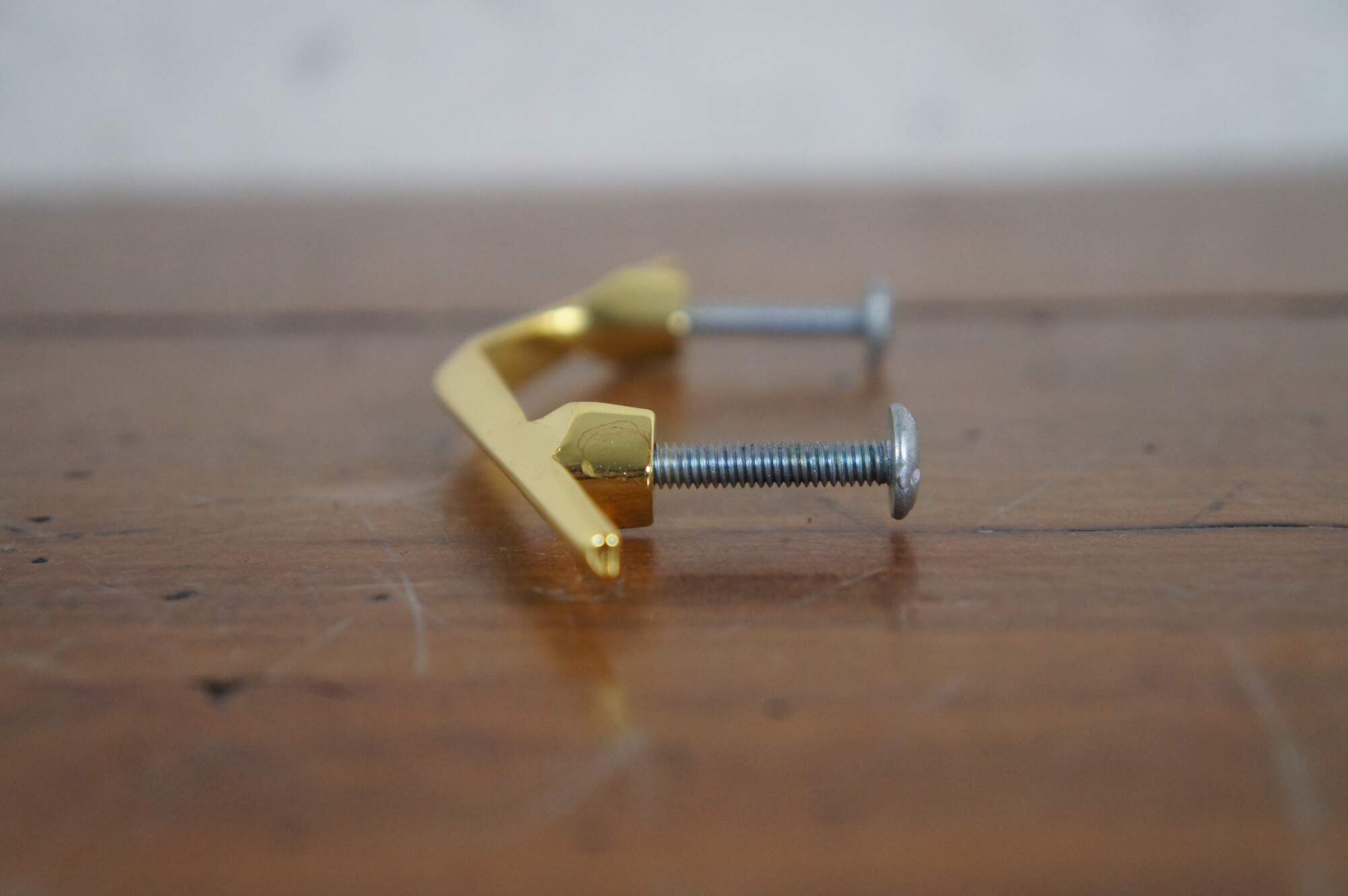 25 Available - Mid to late 20th century old-stock drawer / cabinet pulls. National Lock Company - Medalist, item number C279-3 Starflite Pull, Bright Brass. Mid Century Modern styling. Triangular, airplane or arrow-like shape.