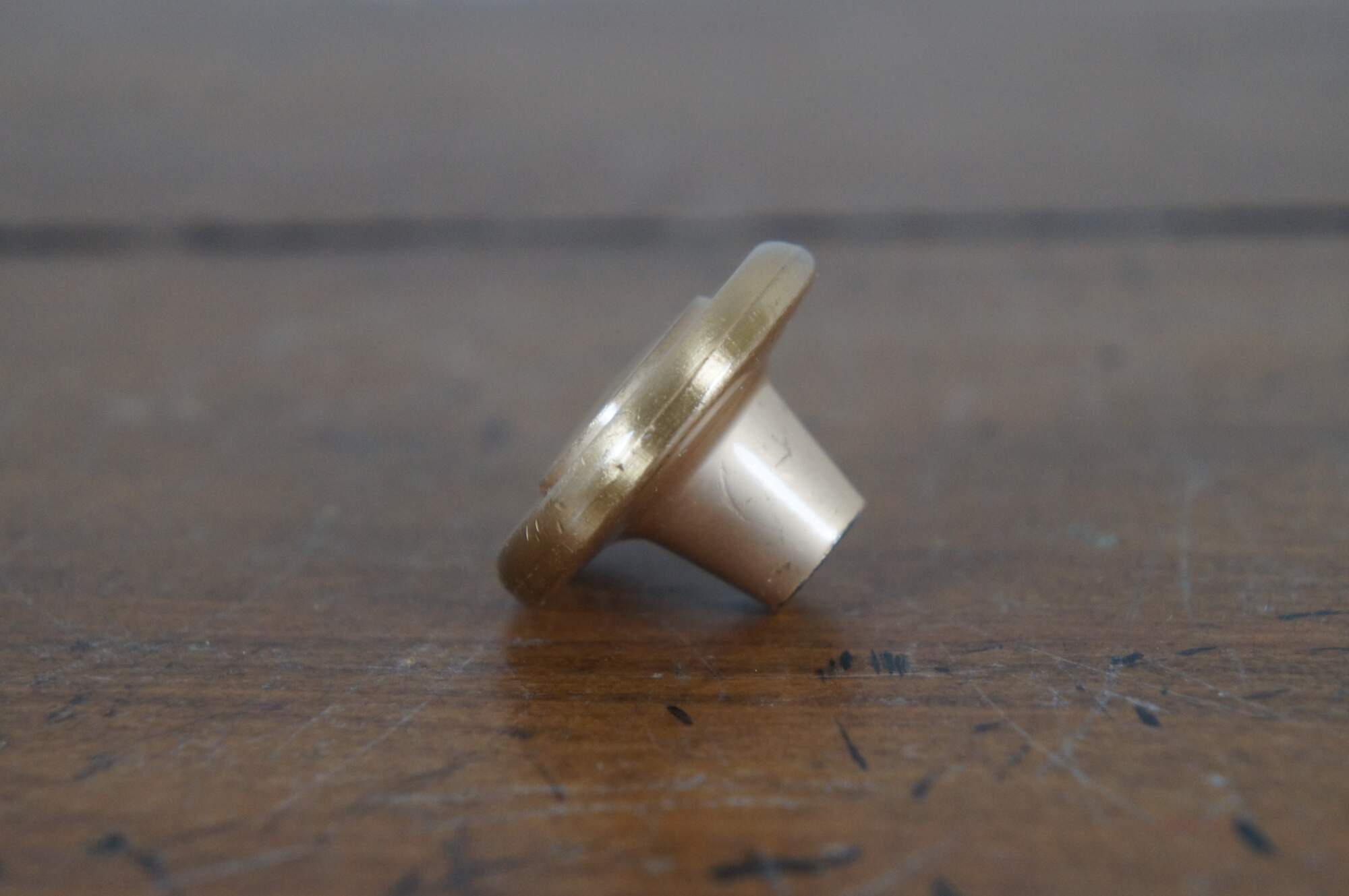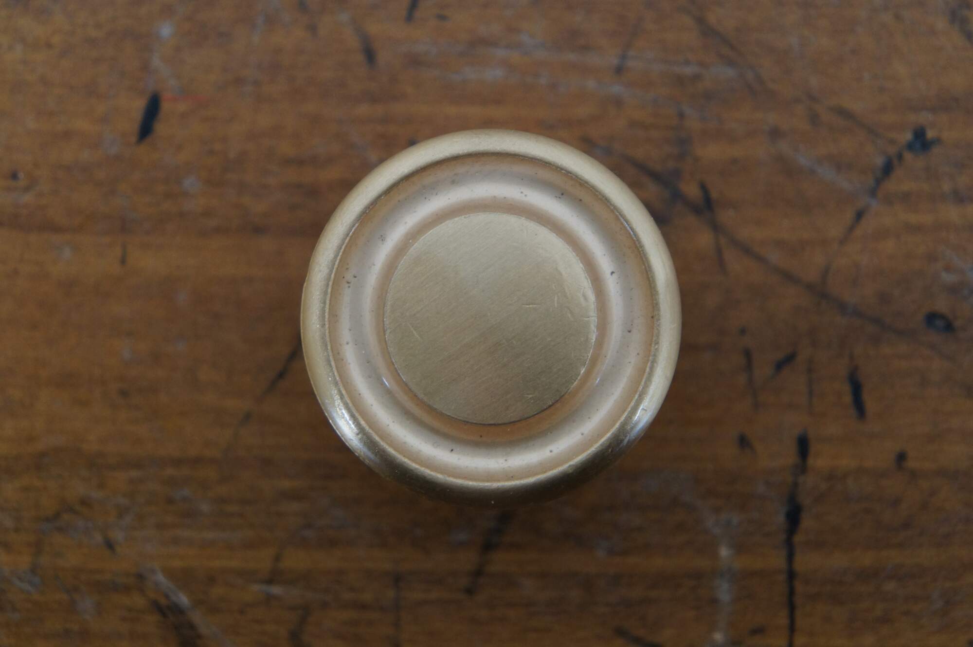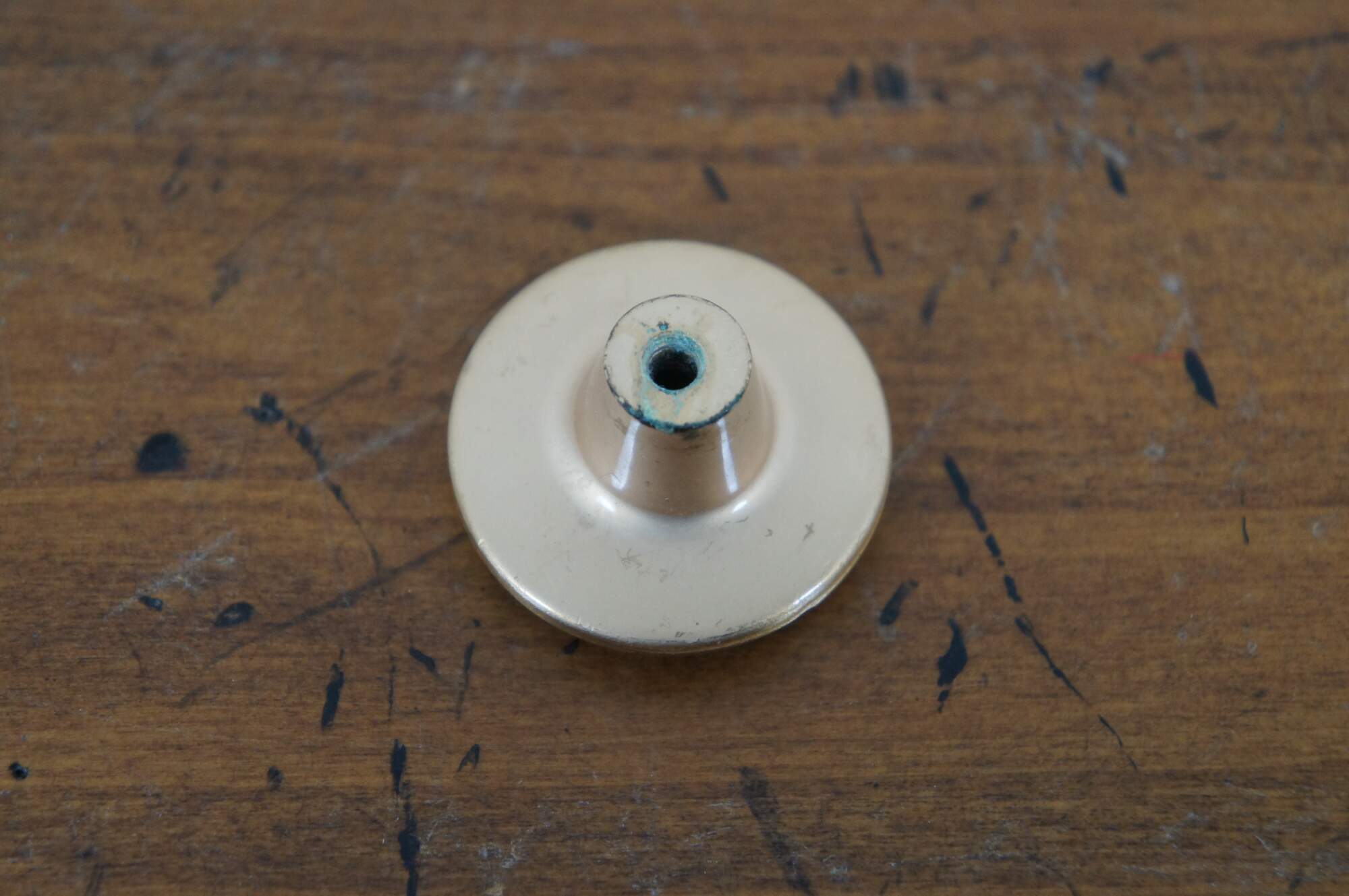 Mid to late 20th century old-stock drawer / cabinet pull pair. National Lock Company - Medalist, item number C275-10 Knob, Dull Bronze. Simple round button shape with recessed groove.