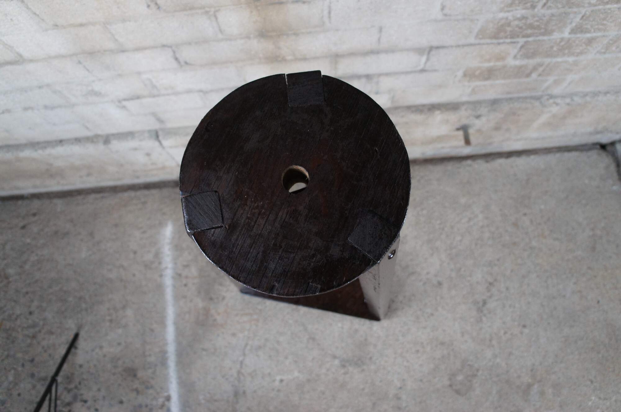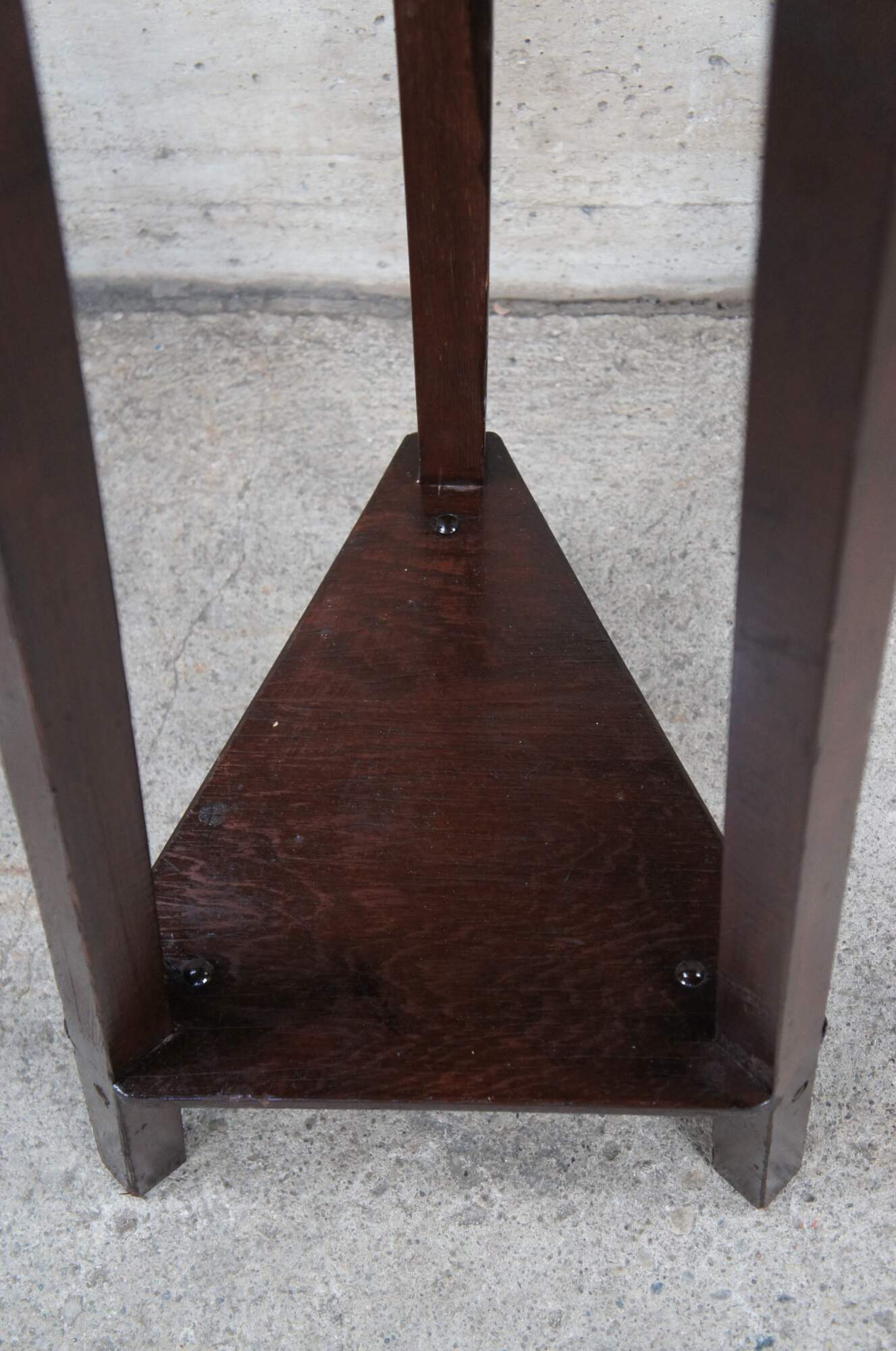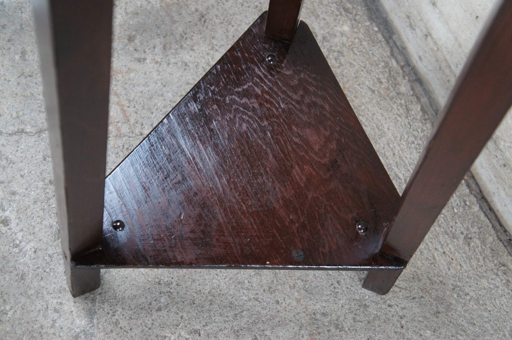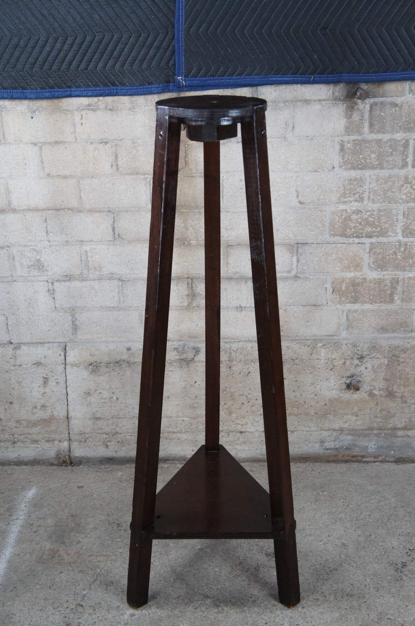 Pair of two very tall antique French sculpture stands. Made of oak featuring arts and crafts styling with triangular tapered form. The top surface has a hole for mounting with fastener underneath.