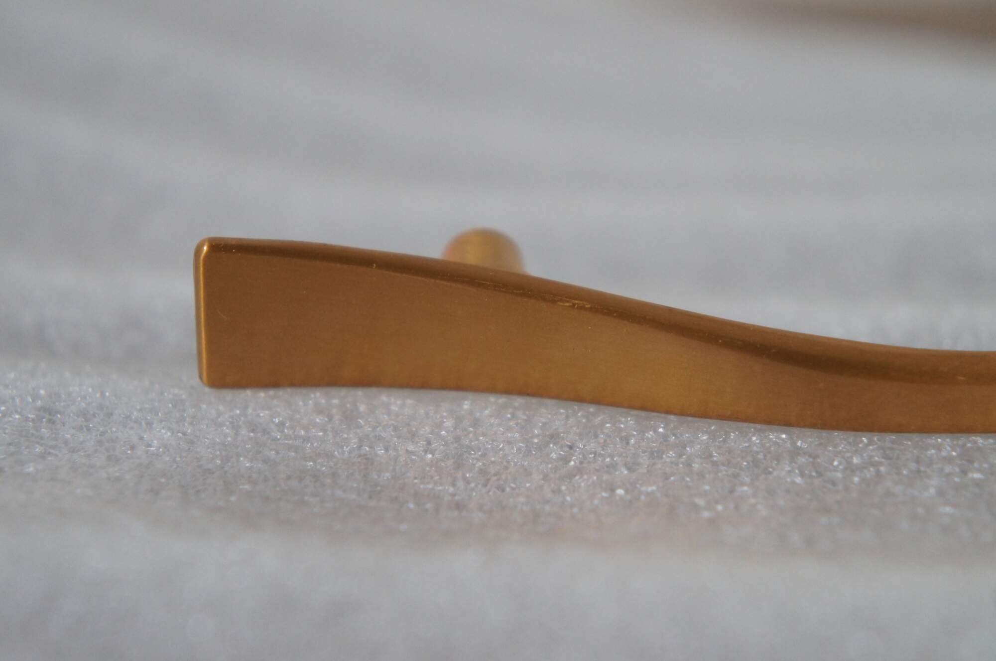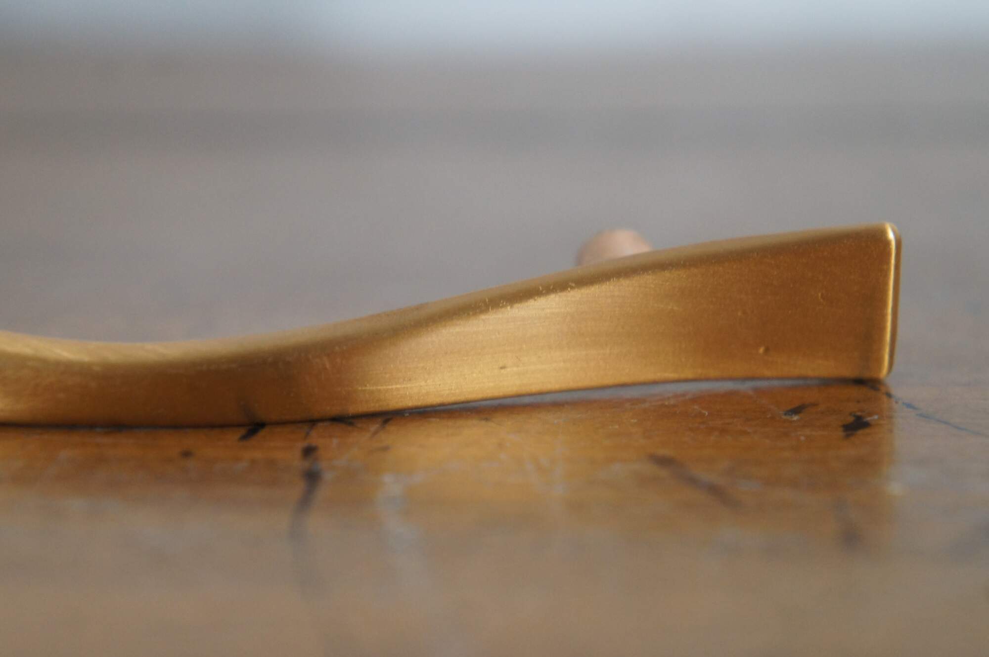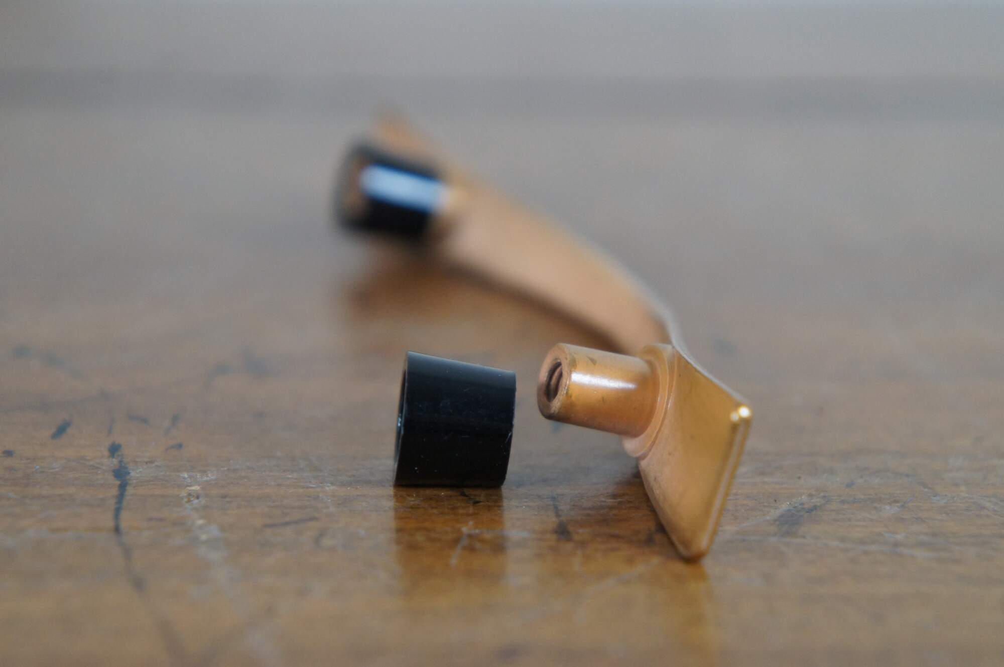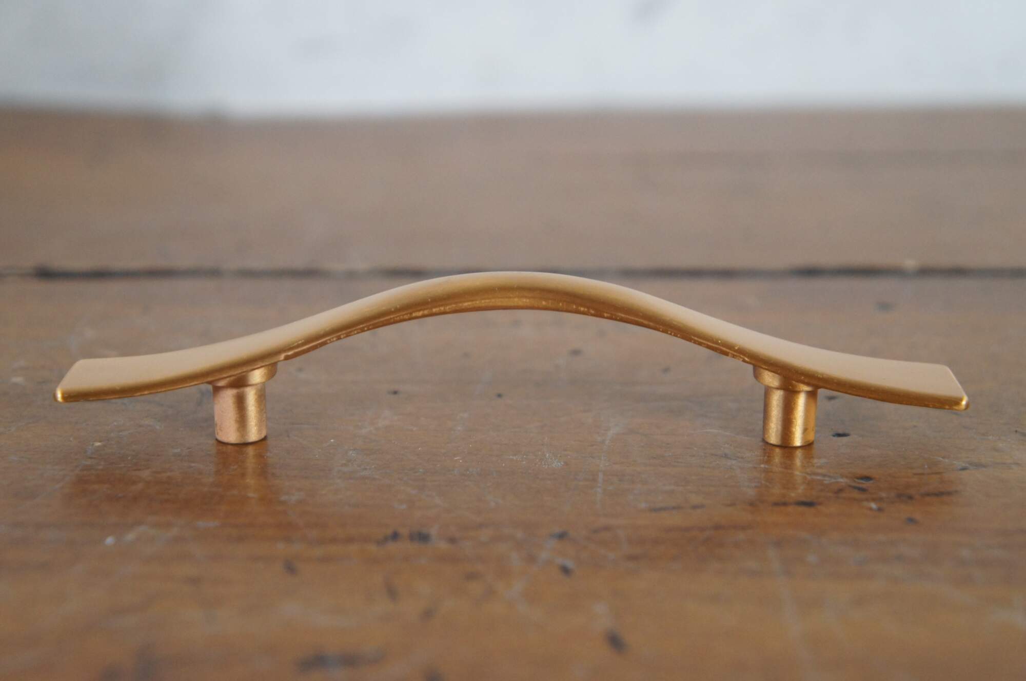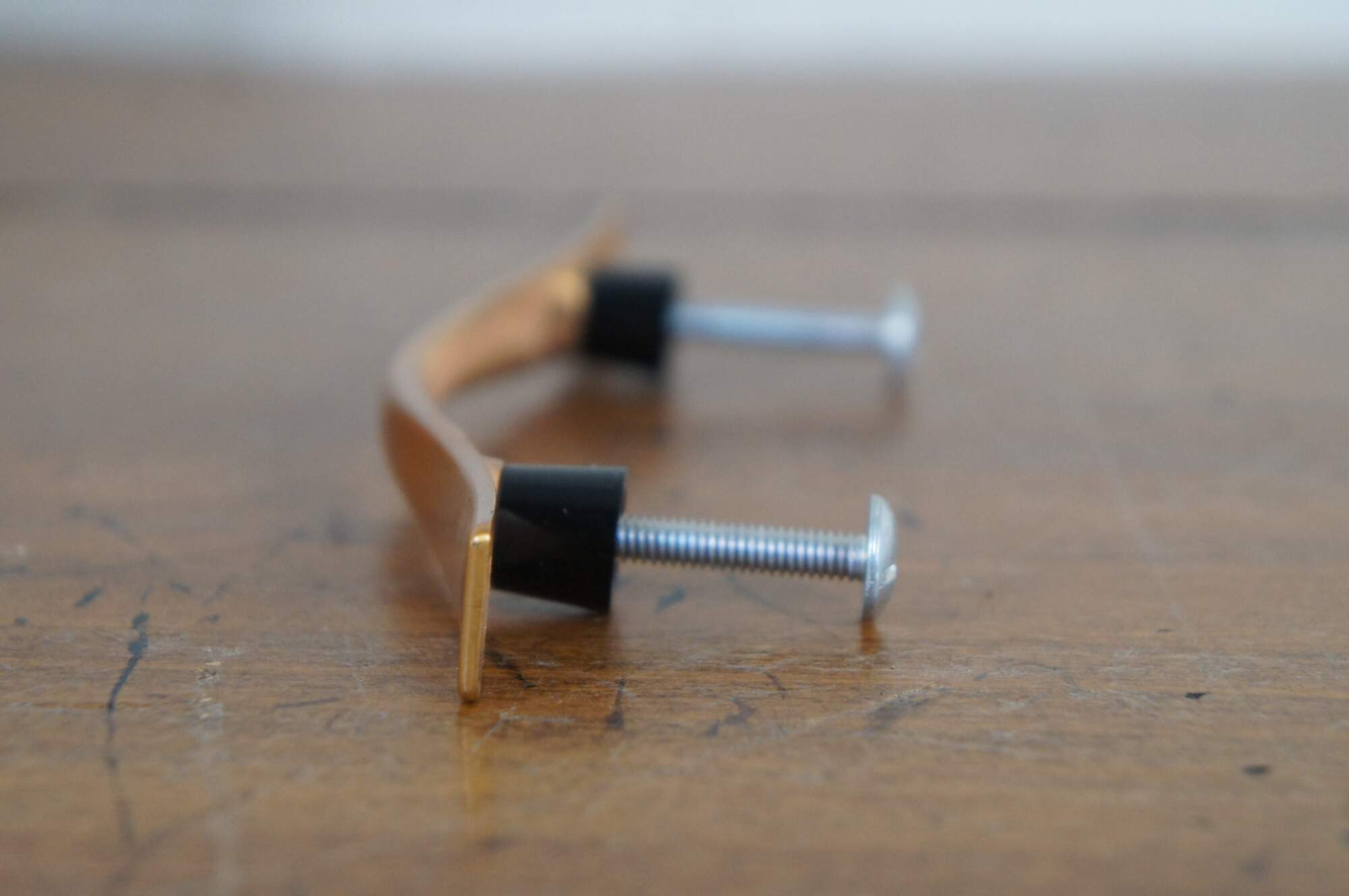 12 Available - Mid to late 20th century old-stock drawer / cabinet pulls. National Lock Company - Medalist, item number C278. Mid Century Modern styling. Lightly curved semi-abstract bow tie shape with black caps. 3" Hole Centers.