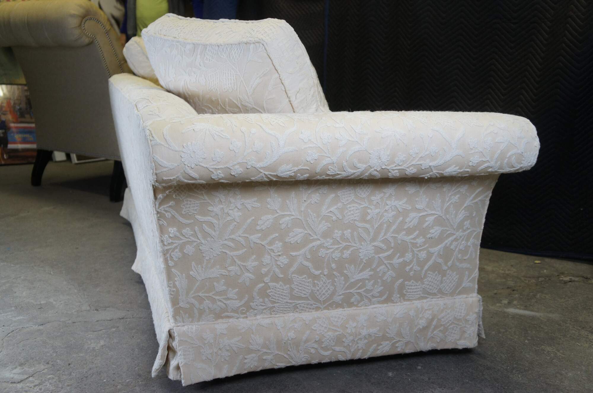 Baker Furniture George IV Skirted Sofa by Stately Homes, 886-86, circa 1990s. A traditional form upholstered in ivory wool fabric with flared rolled arms and a straight back with slight contoured shoulders. The sofa is supported by square tapered legs. Includes two long seat cushions and give back pillows. Seat cushions are a combination of down, foam and fiber. Back pillows 75% waterfowl and 25% down.