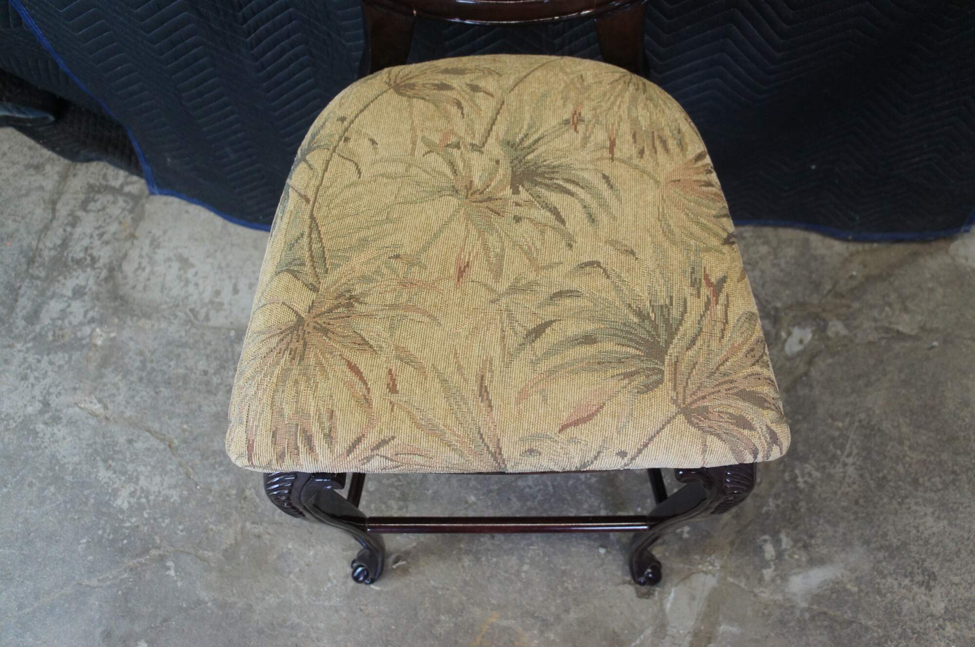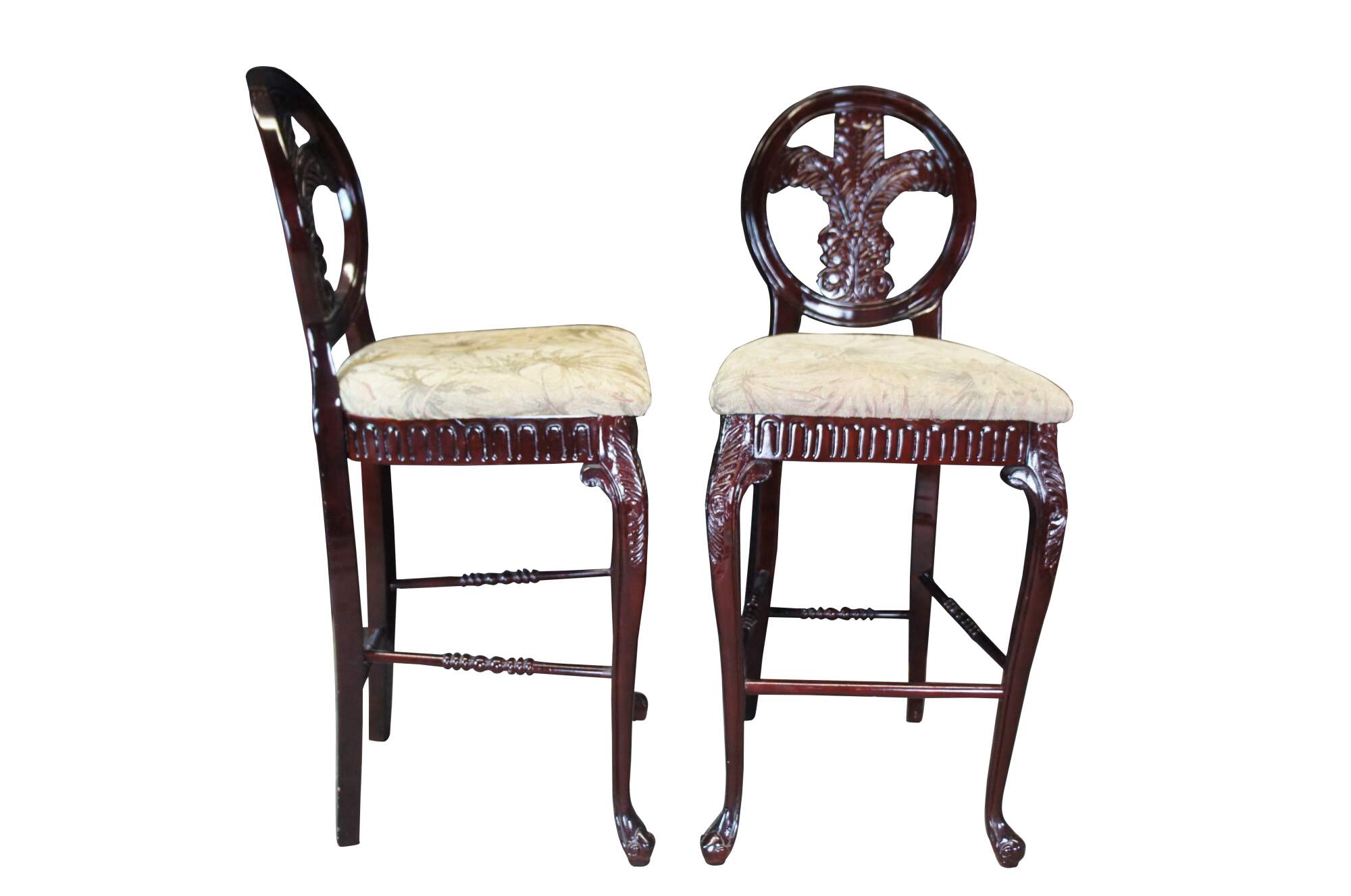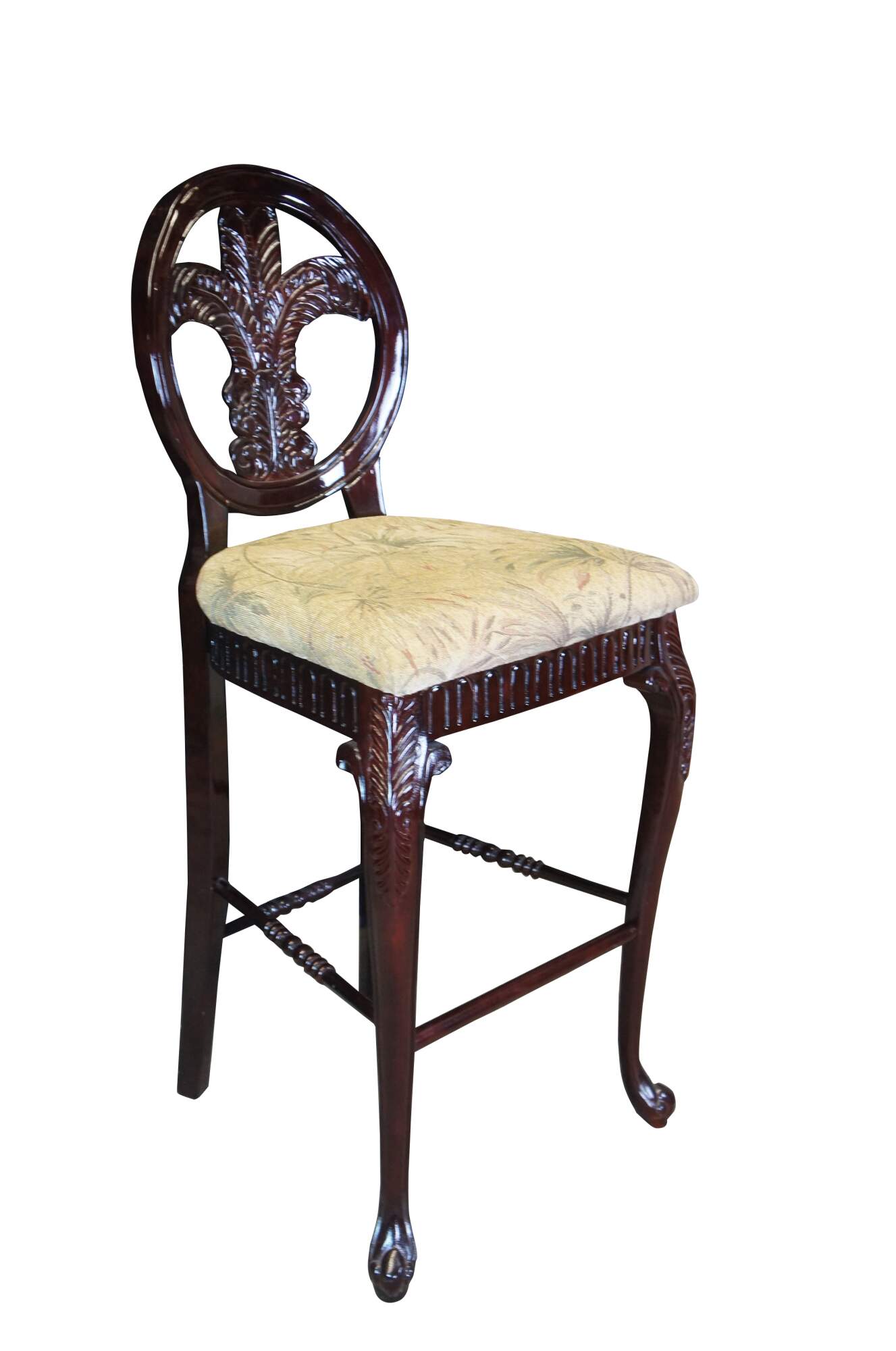 The Pulaski Foxcroft Bar Stool has an elegantly carved back showcasing prince of wales feathers and acanthus carved legs as well as a lovely and classic upholstered seat. Finished in mahogany