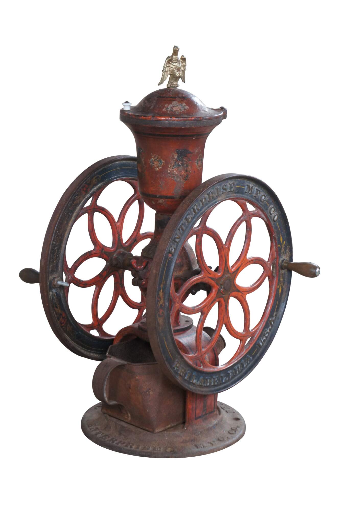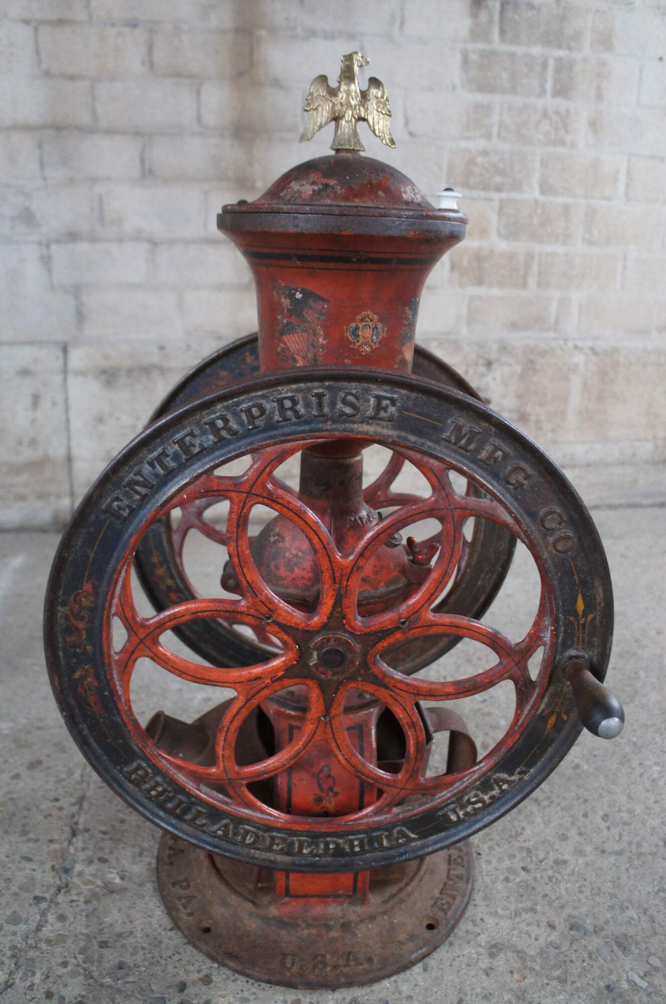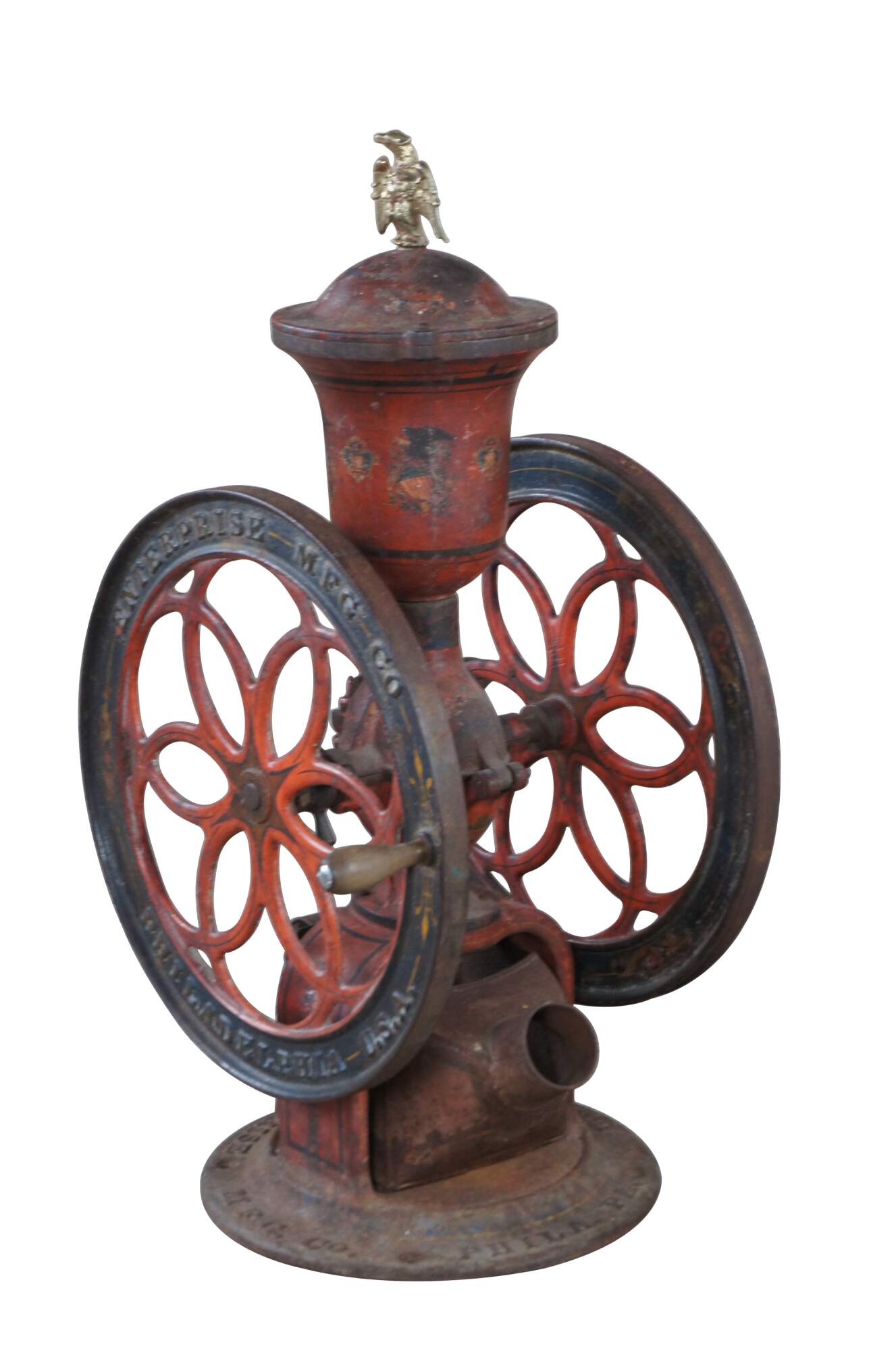 Antique Enterprise Mfg Co coffee grinder / mill, circa 1876. It is one of the largest and heaviest of the counter top grinders, made for the country general stores and farmhouses. This double wheeled coffee grinder is made of cast iron and features American Bald Eagles stenciled to the urn shaped hopper at the top to pour in the coffee beans. A cast brass eagle finial decorates the top lid and it includes the rare original insert for catching the grounds.