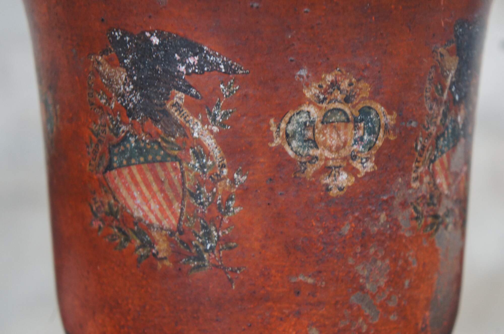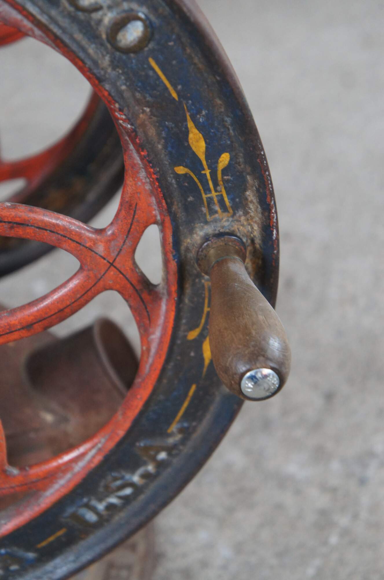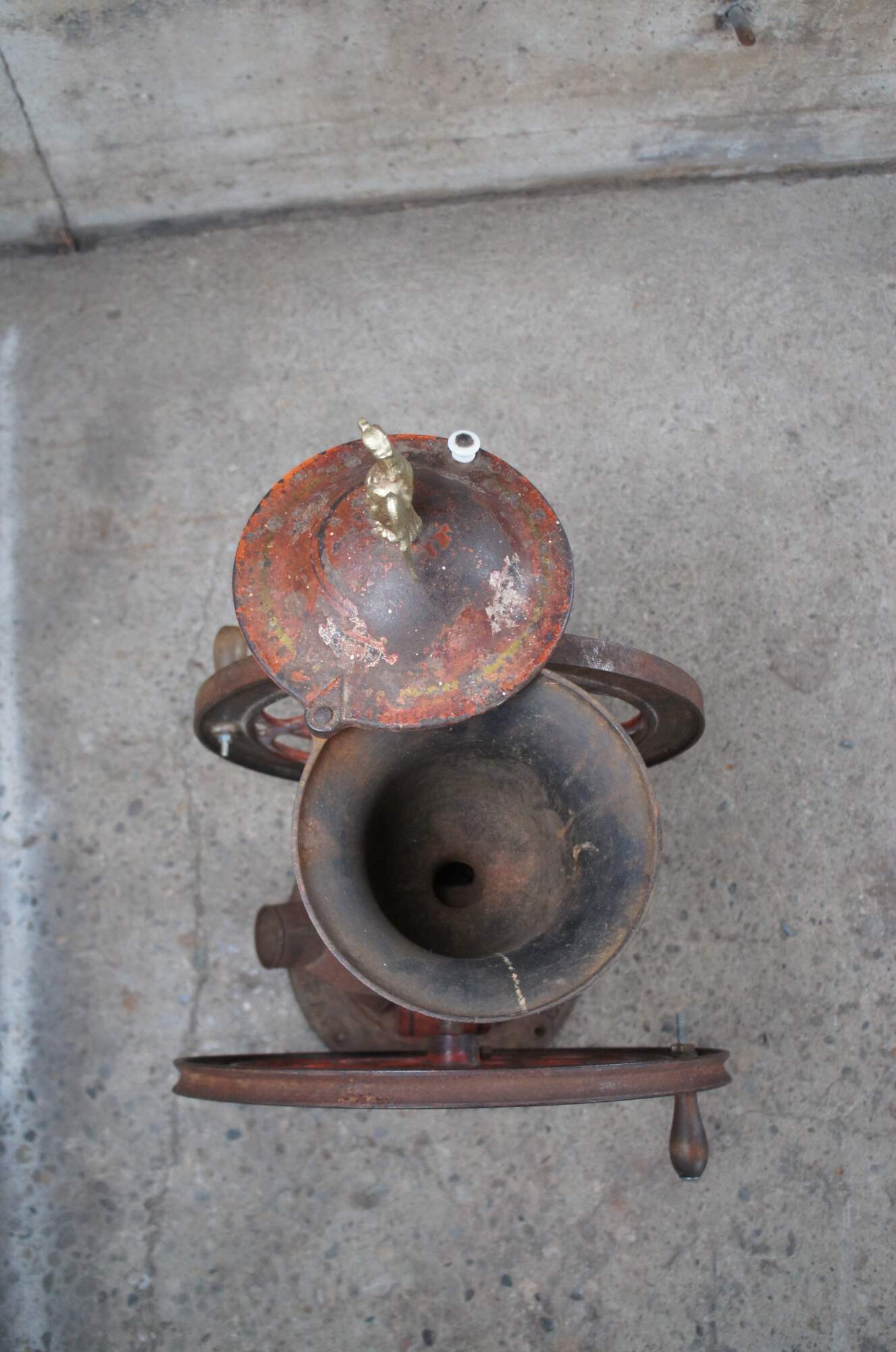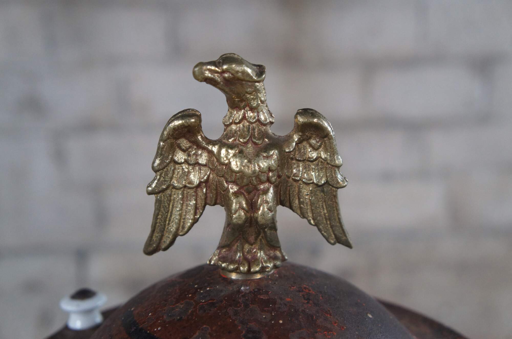 Antique Enterprise Mfg Co coffee grinder / mill, circa 1876. It is one of the largest and heaviest of the counter top grinders, made for the country general stores and farmhouses. This double wheeled coffee grinder is made of cast iron and features American Bald Eagles stenciled to the urn shaped hopper at the top to pour in the coffee beans. A cast brass eagle finial decorates the top lid and it includes the rare original insert for catching the grounds.