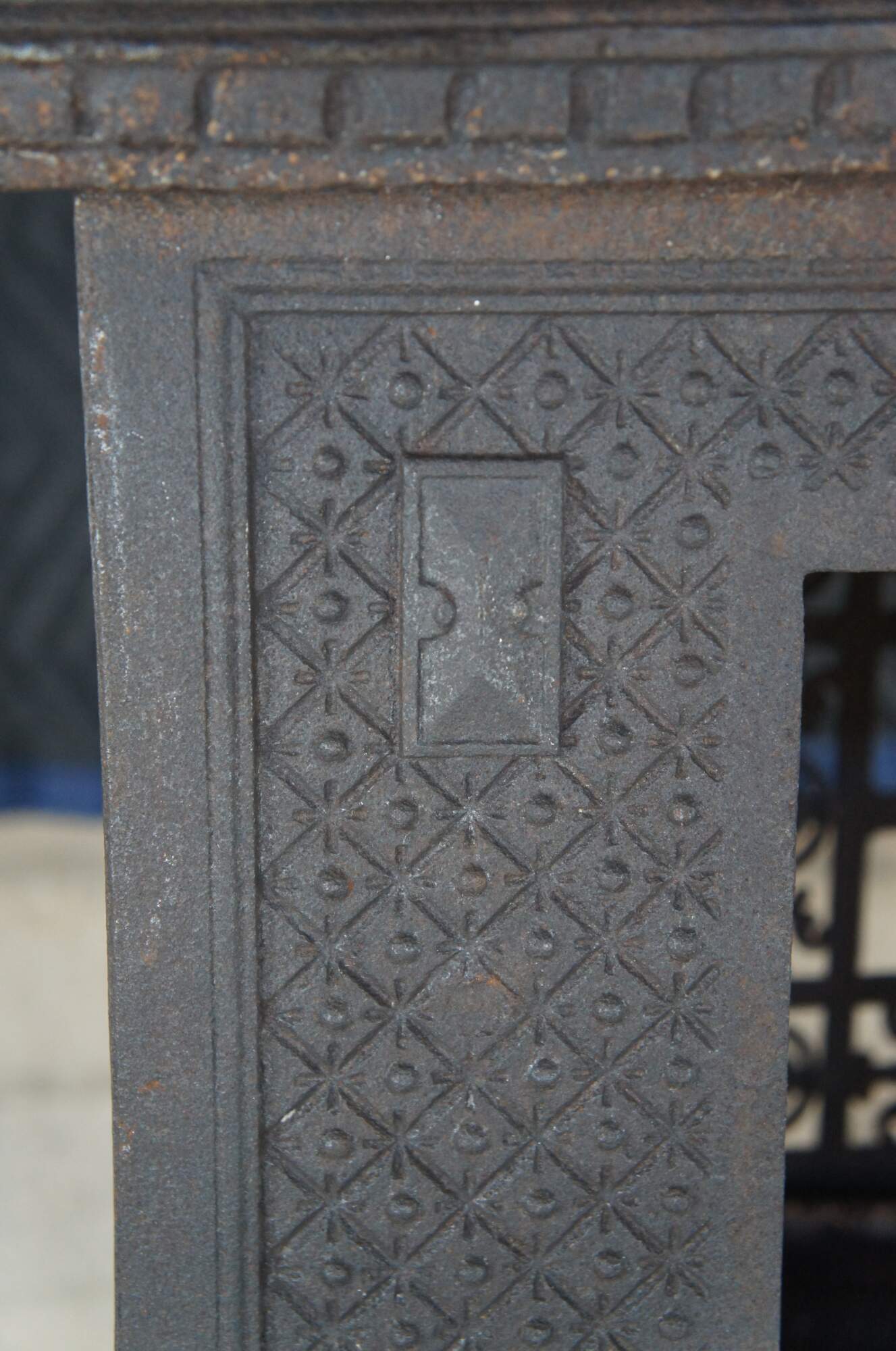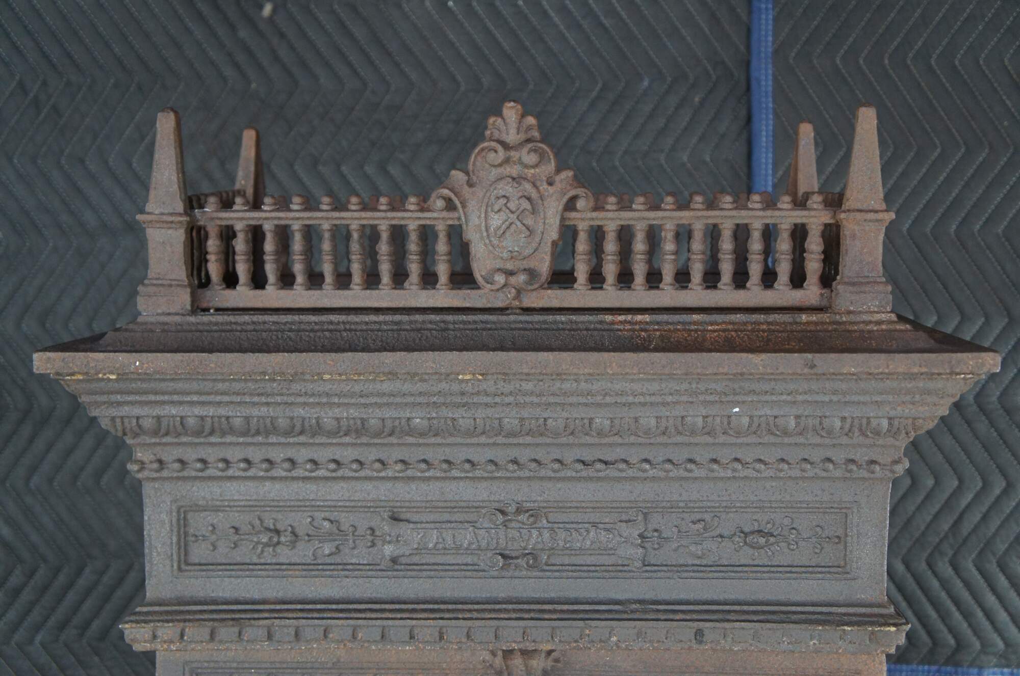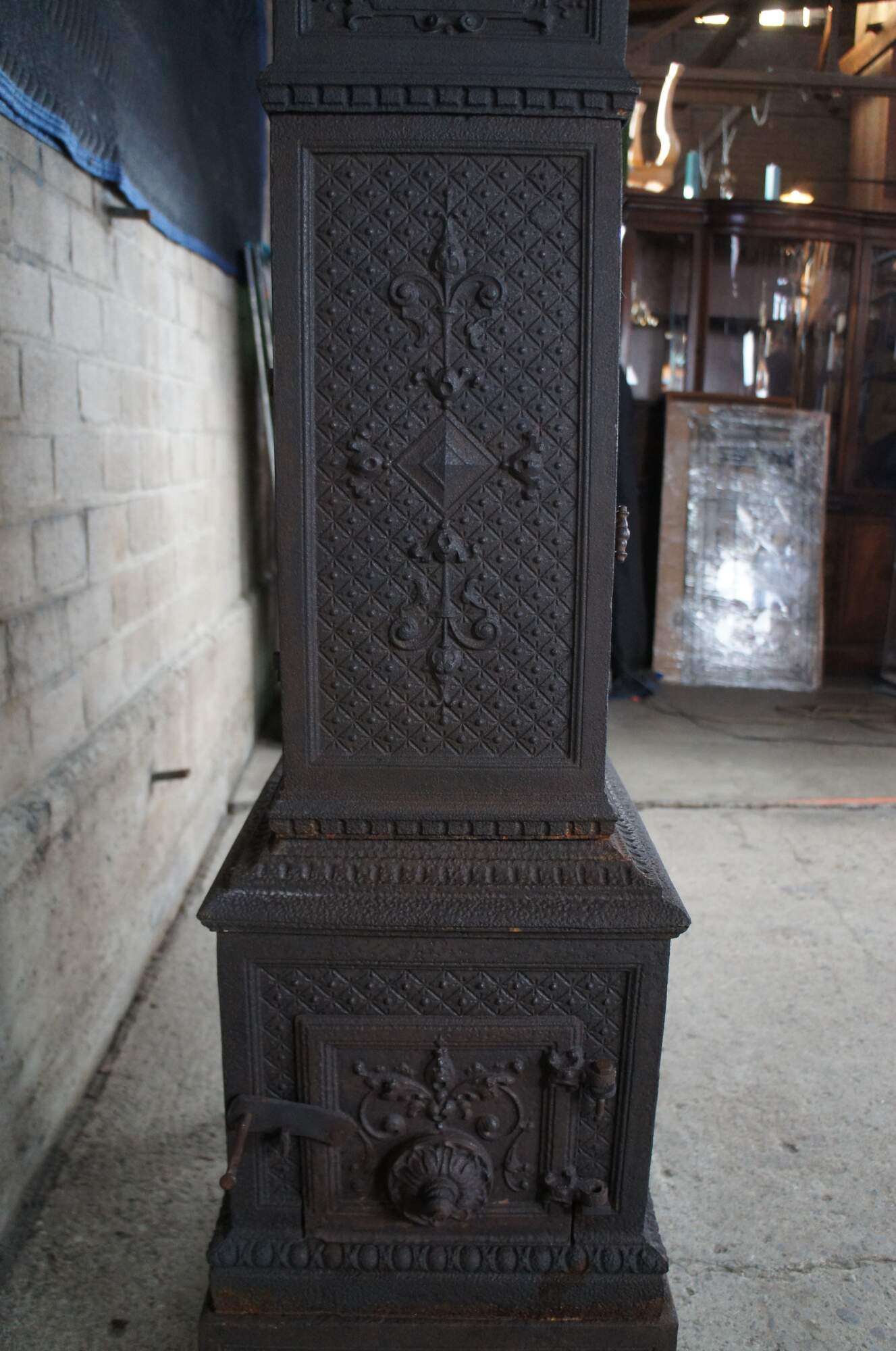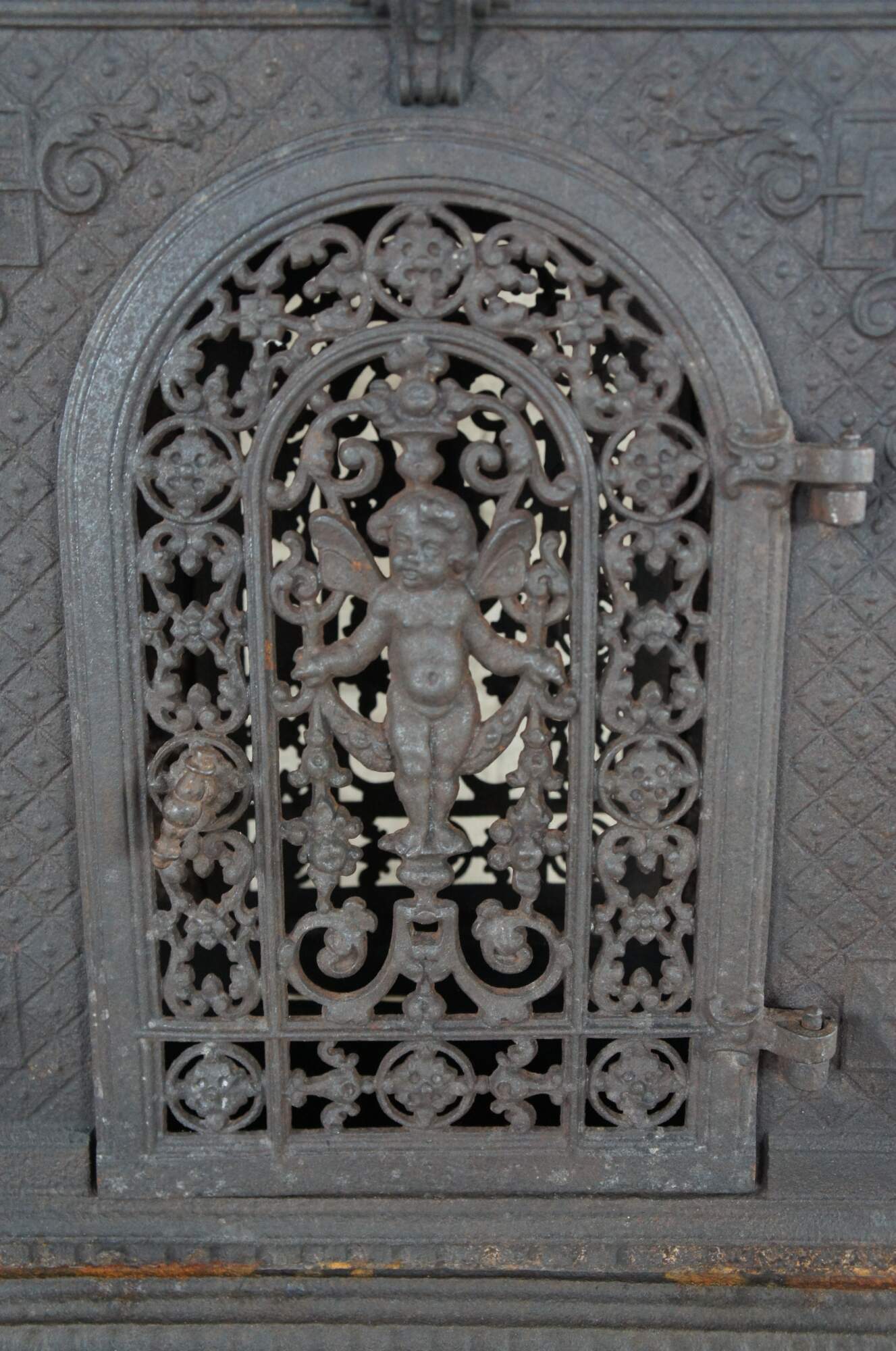 Rare antique Norwegian Kalani Vasgyar castle stove / hearthware heater / warmer / fireplace fire grate. Made of cast iron featuring stackable sections with double sided cabinet featuring ornate reticulated / pierced designs with cherubs / putties and fleur de lis. Circa 1900.