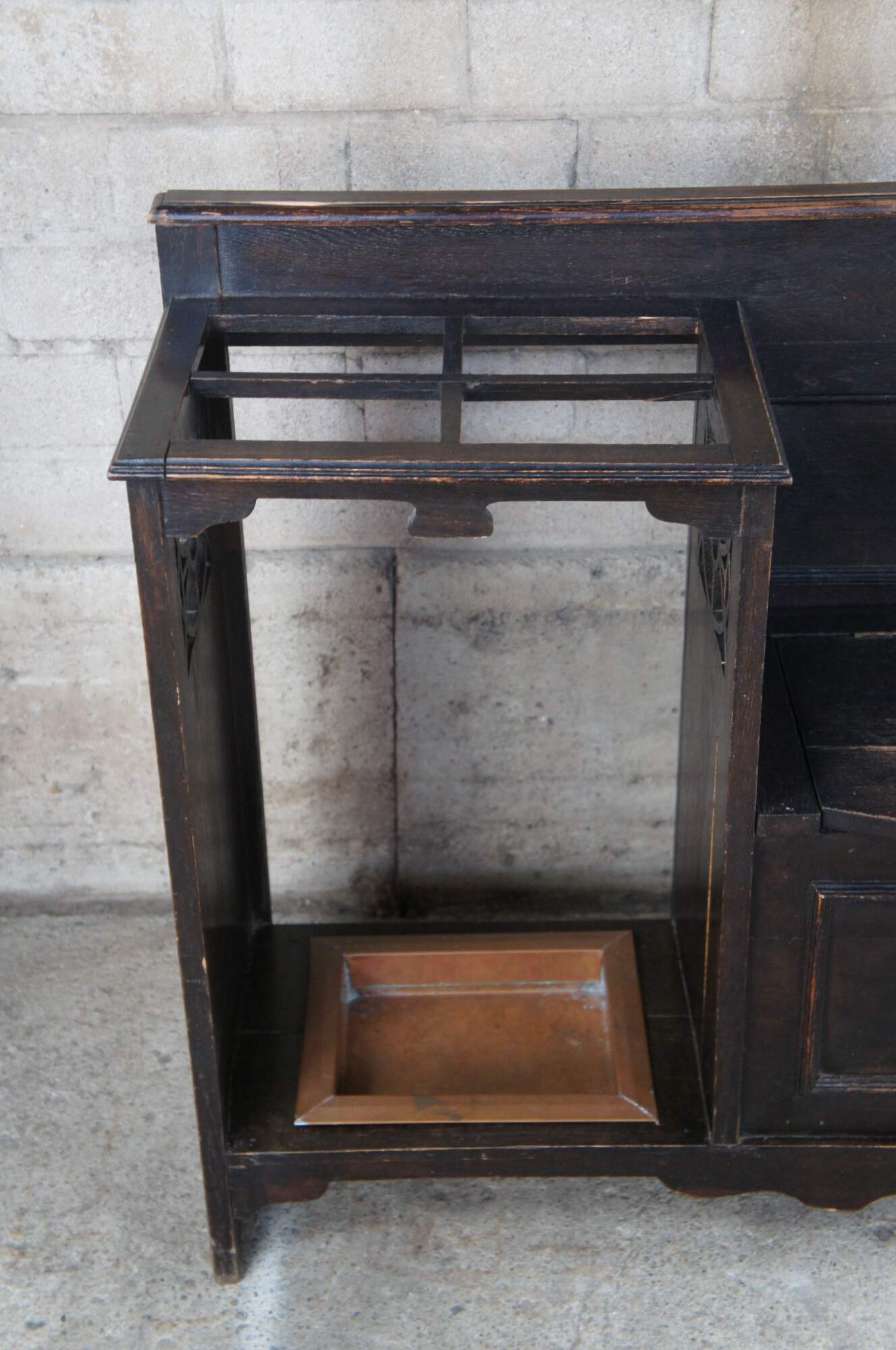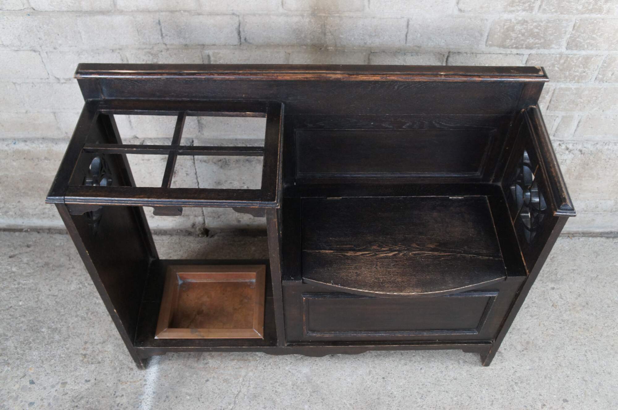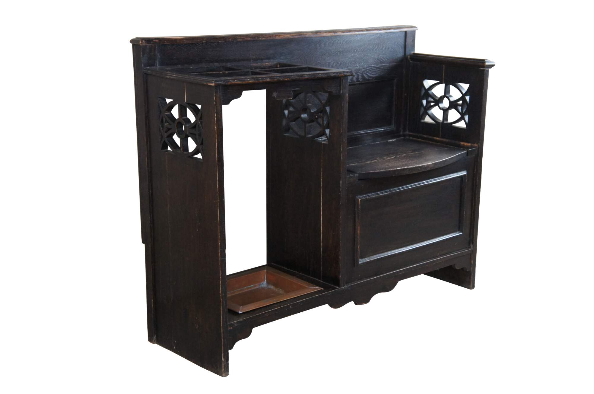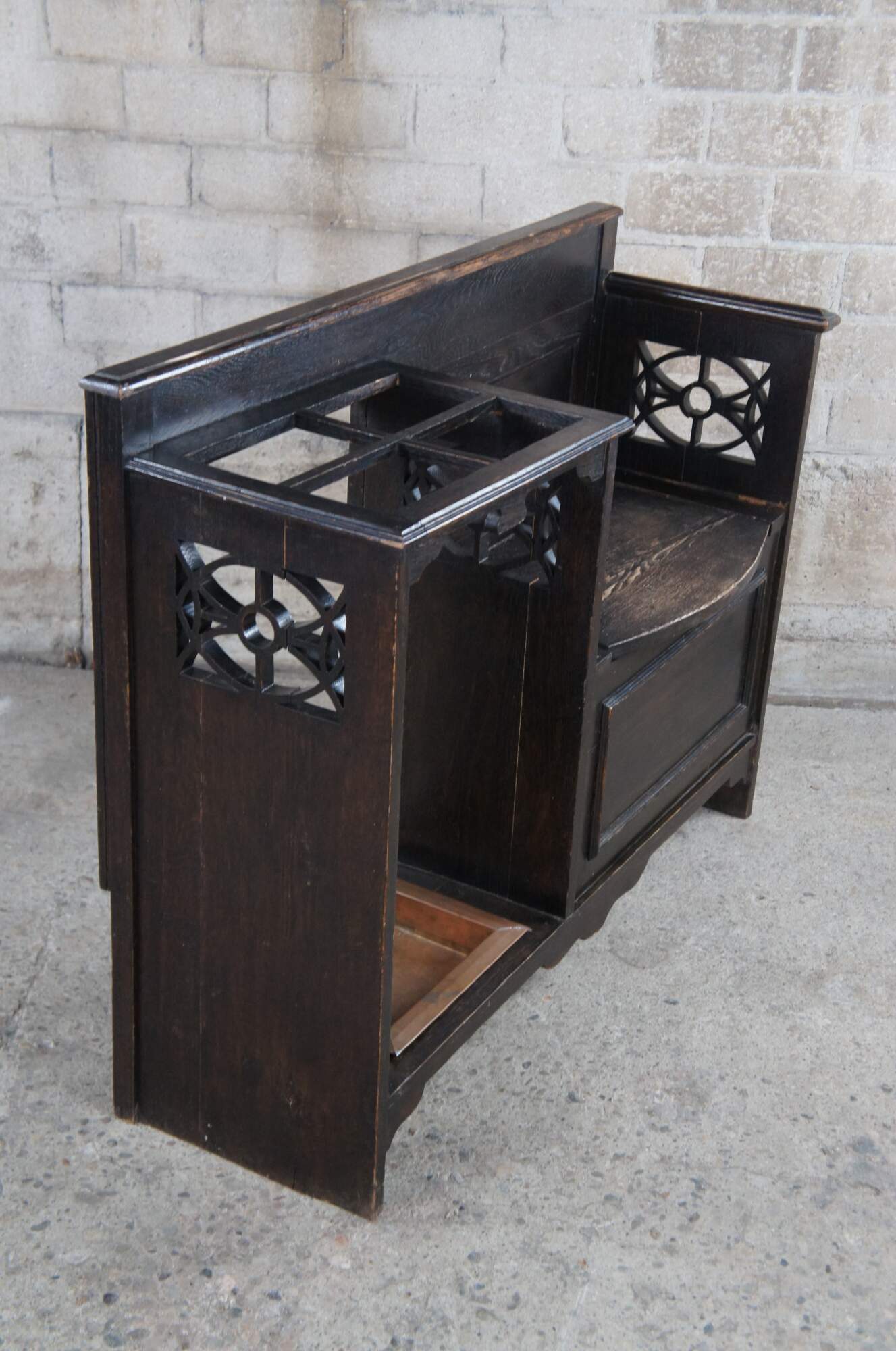 Antique Victorian hall bench umbrella / cane / stick stand. Made of oak featuring pierced / reticulated accents with seat that opens for storage and copper drip pan insert.