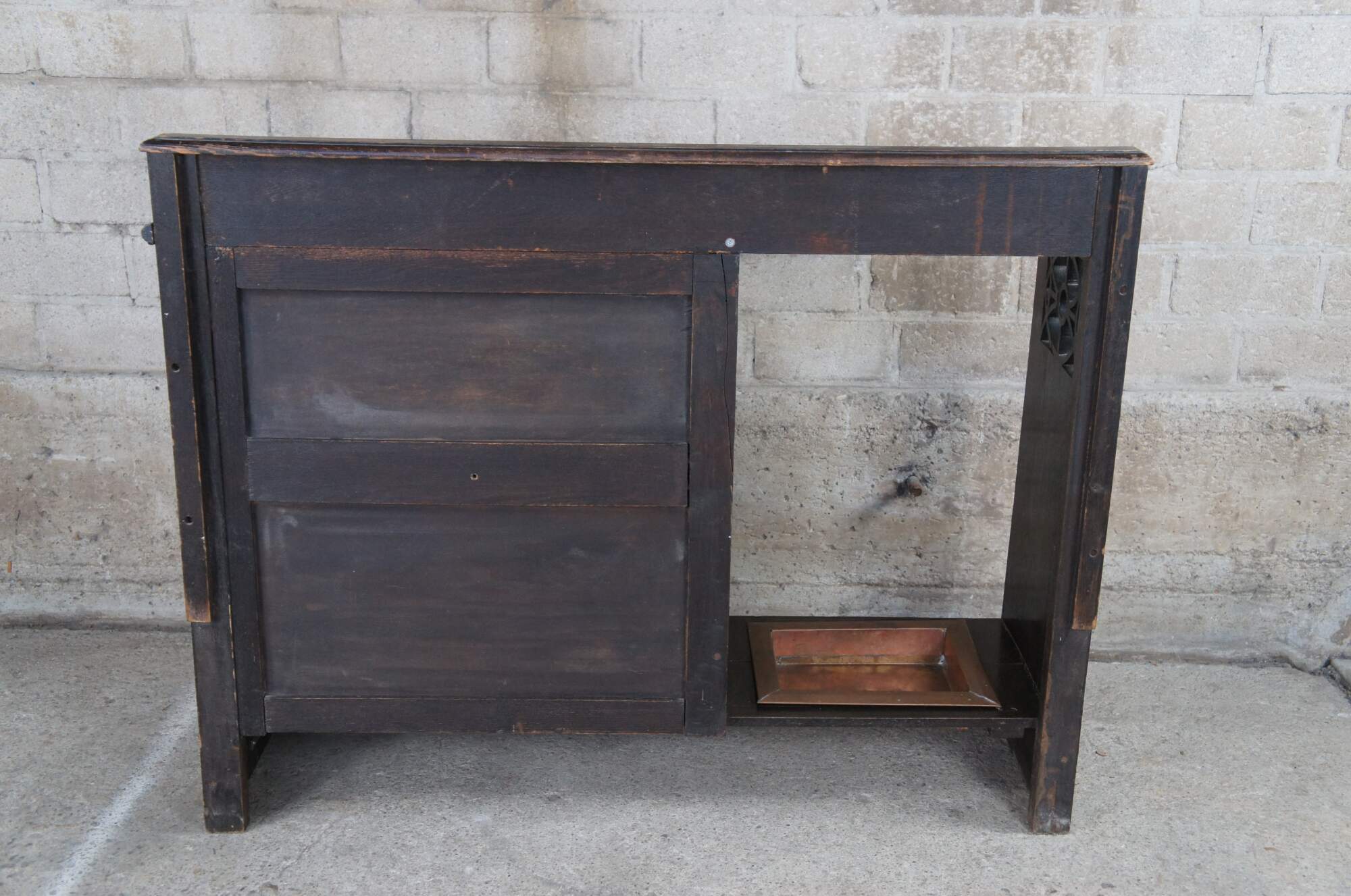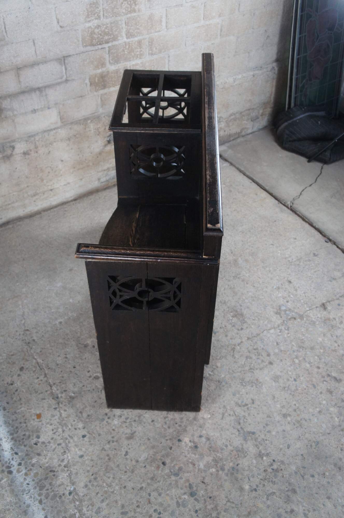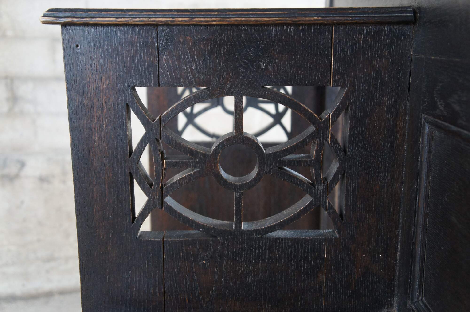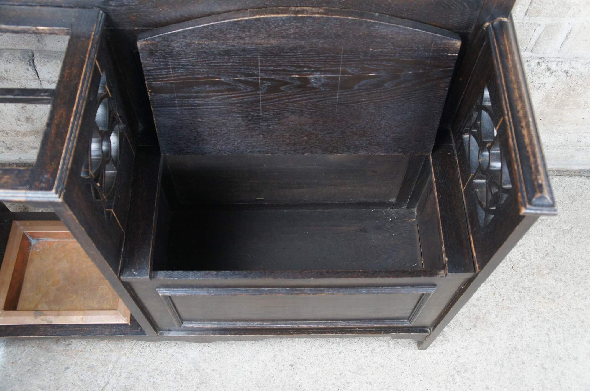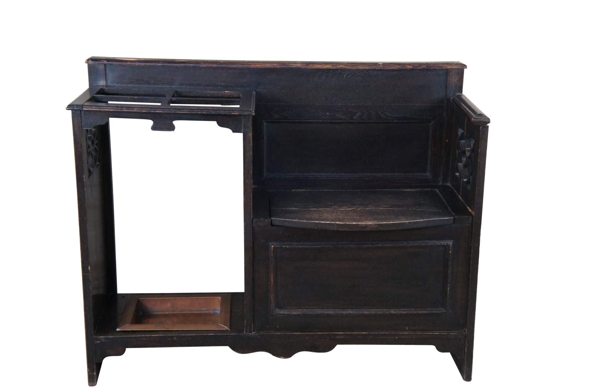 Antique Victorian hall bench umbrella / cane / stick stand. Made of oak featuring pierced / reticulated accents with seat that opens for storage and copper drip pan insert.
