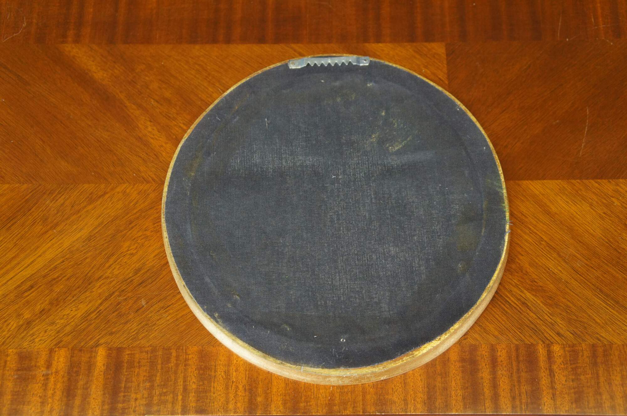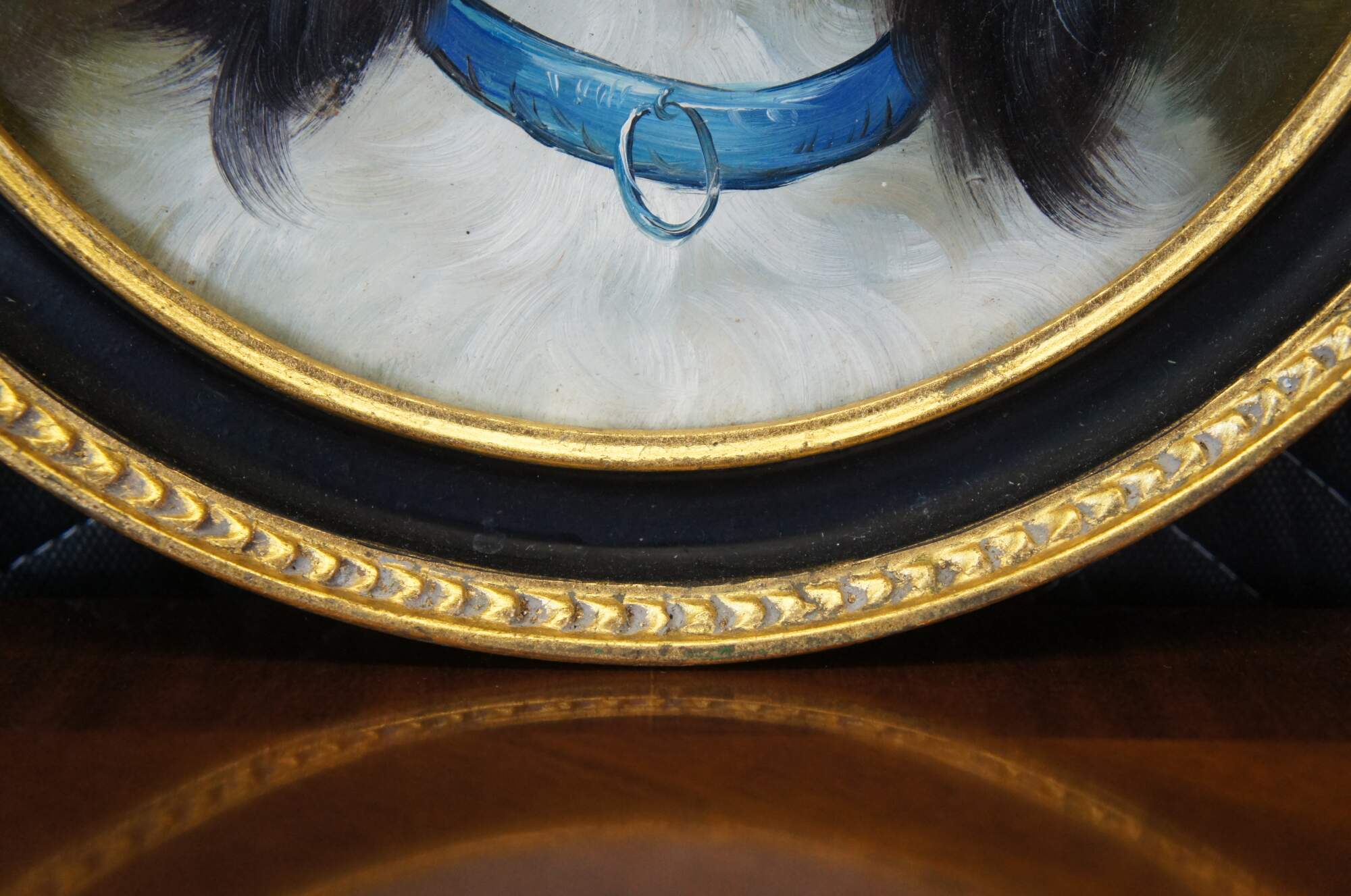 A lovely 20th century oil painting of a King Charles Spaniel with blue collar over a yellowish green background. The painting is on board and framed in a round black / gold wood frame.