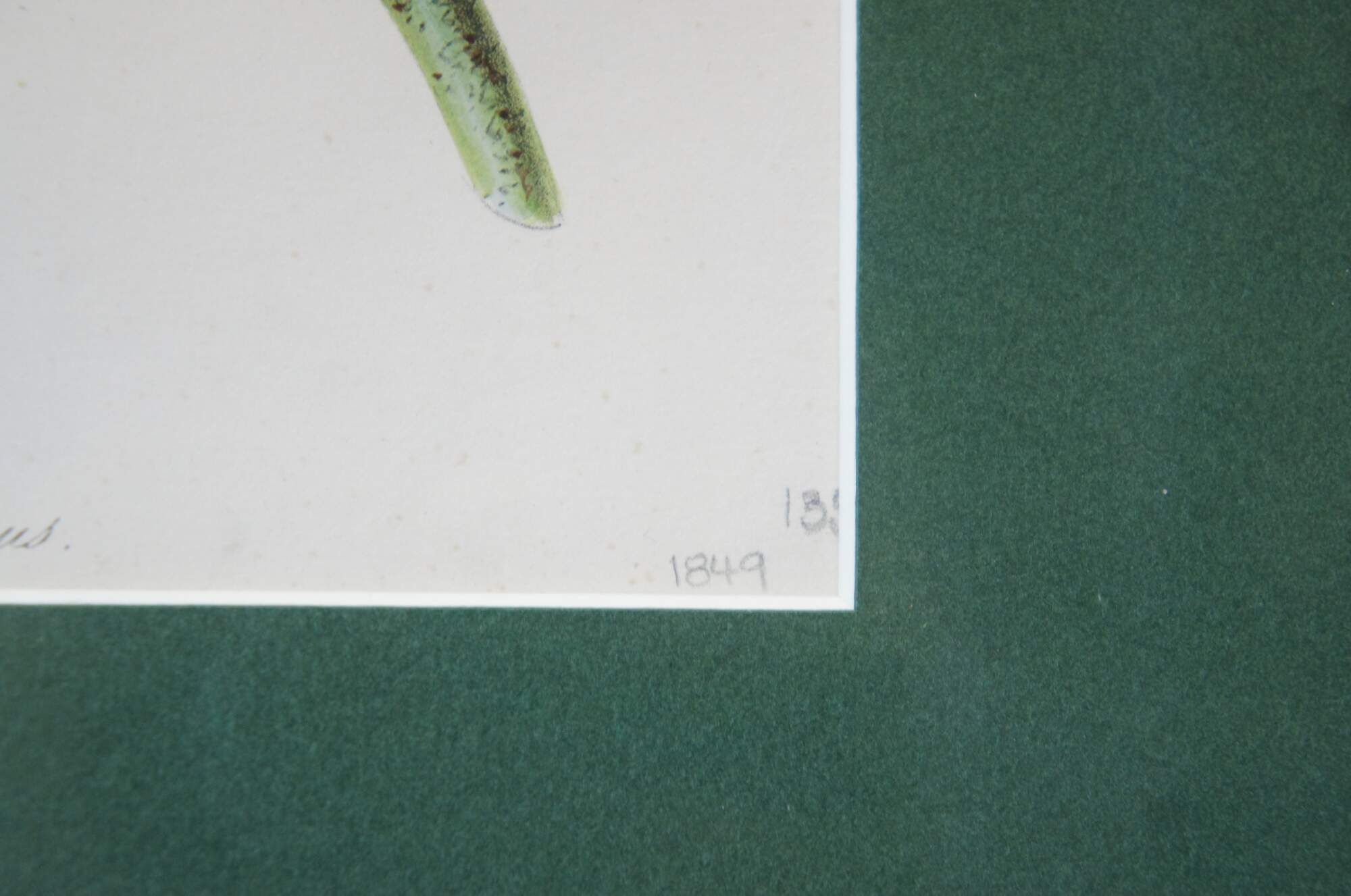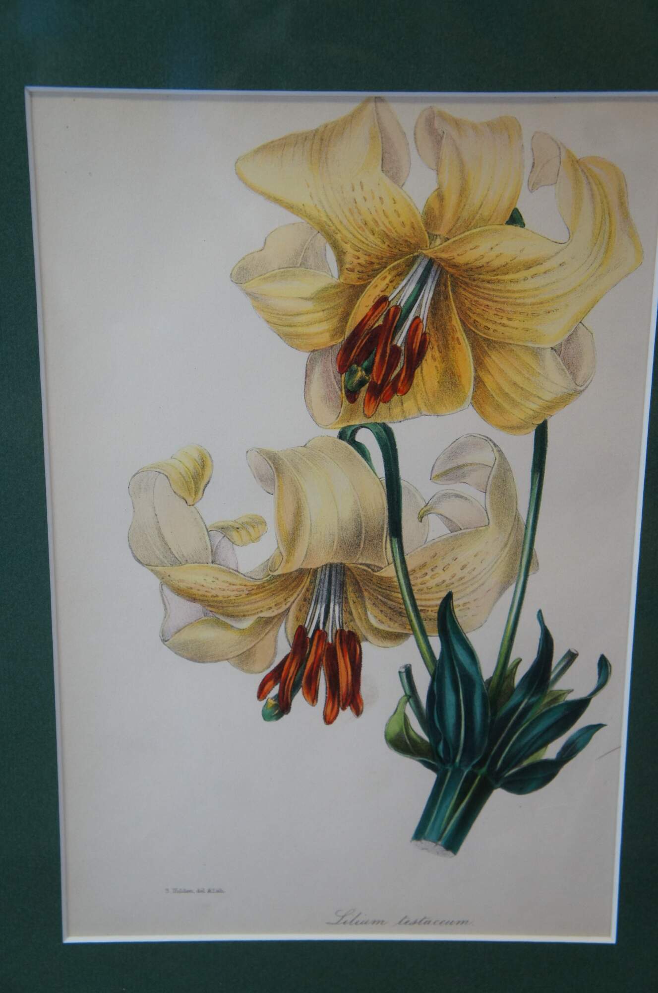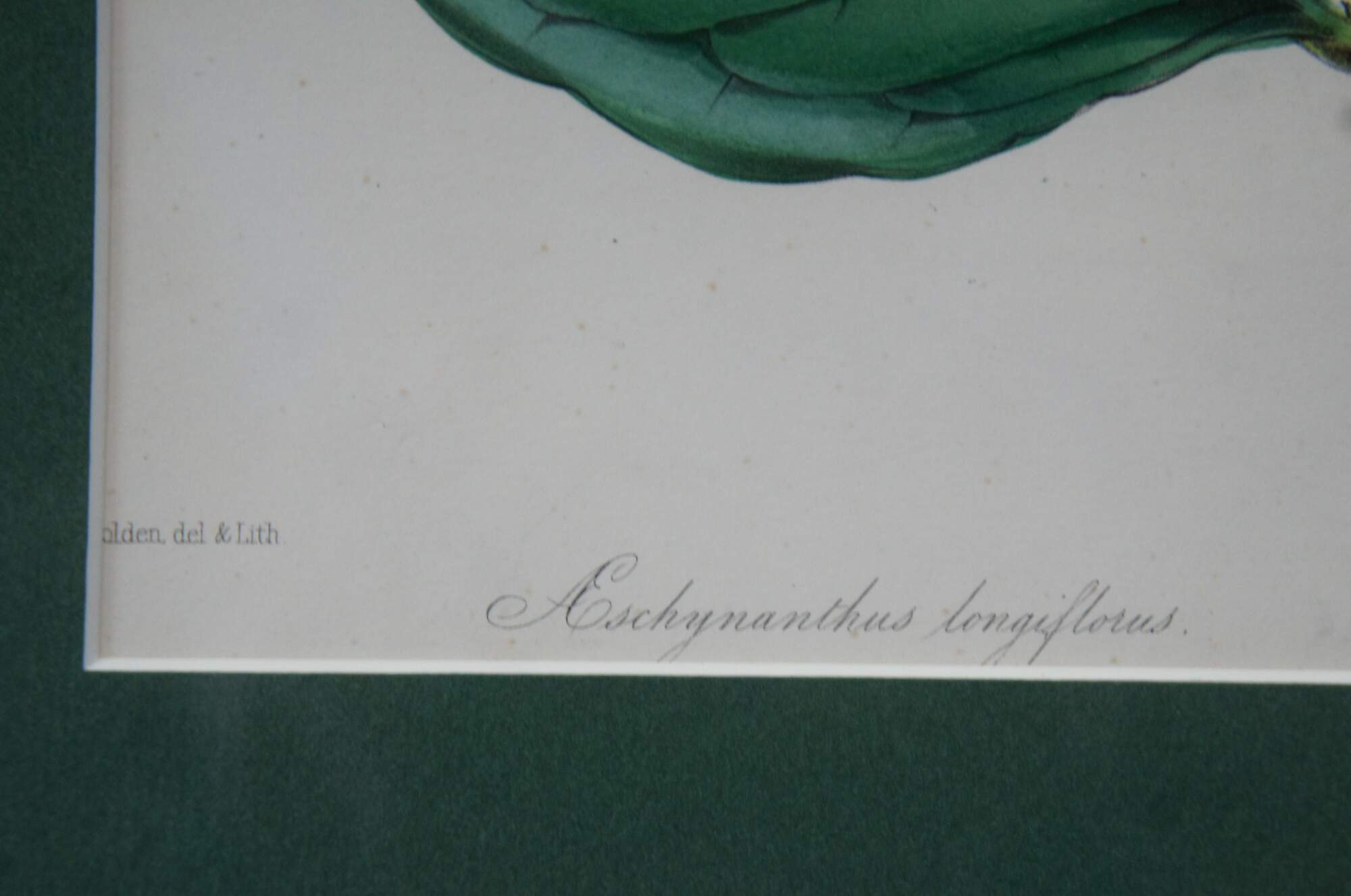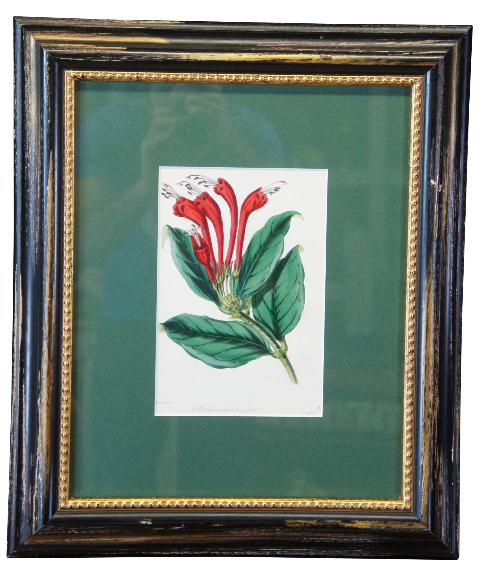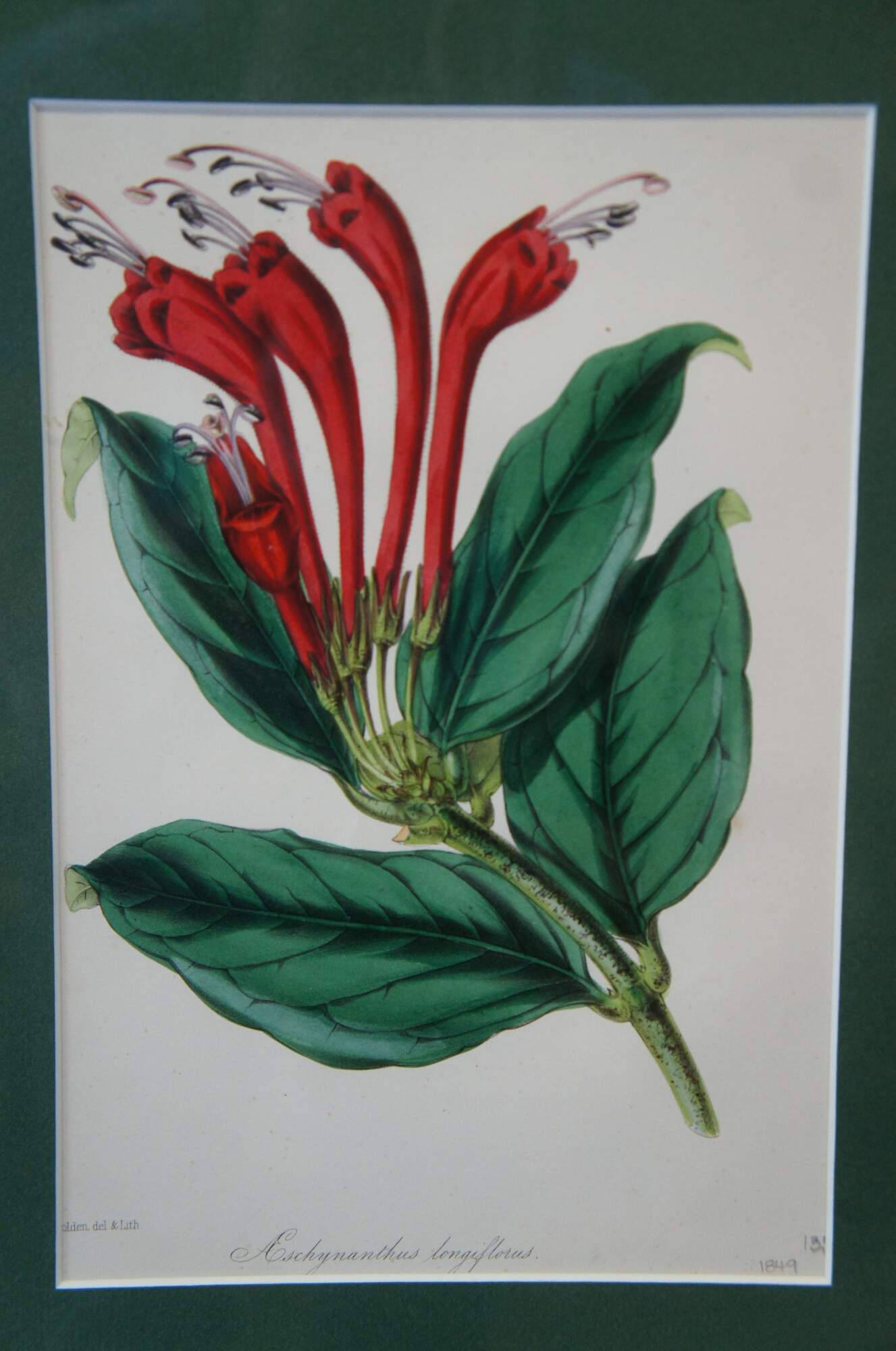 Aeschynanthus longiflorus & Lilium testaceum, circa 1849 by Samuel Holden. Each lithograph is hand colored and set in a green mat beneath glass. The frame is made from wood with black finish and gold beeded accents.
