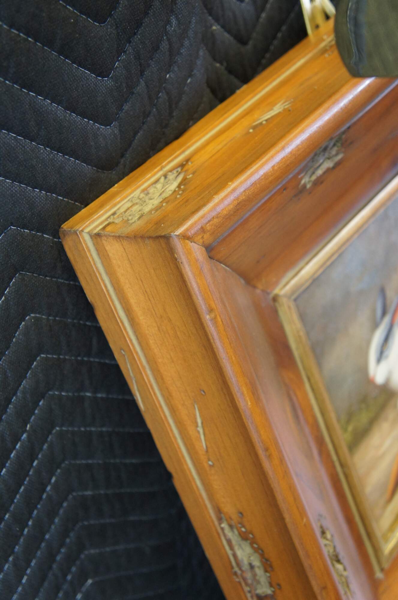 A lovely oil painting featuring two rabbits perched over a carrot with a grassy landscape and pond in the background. The painting is on canvas and is framed in pine with naturally distressed accents and light along the top. Signed Segal, lower right.