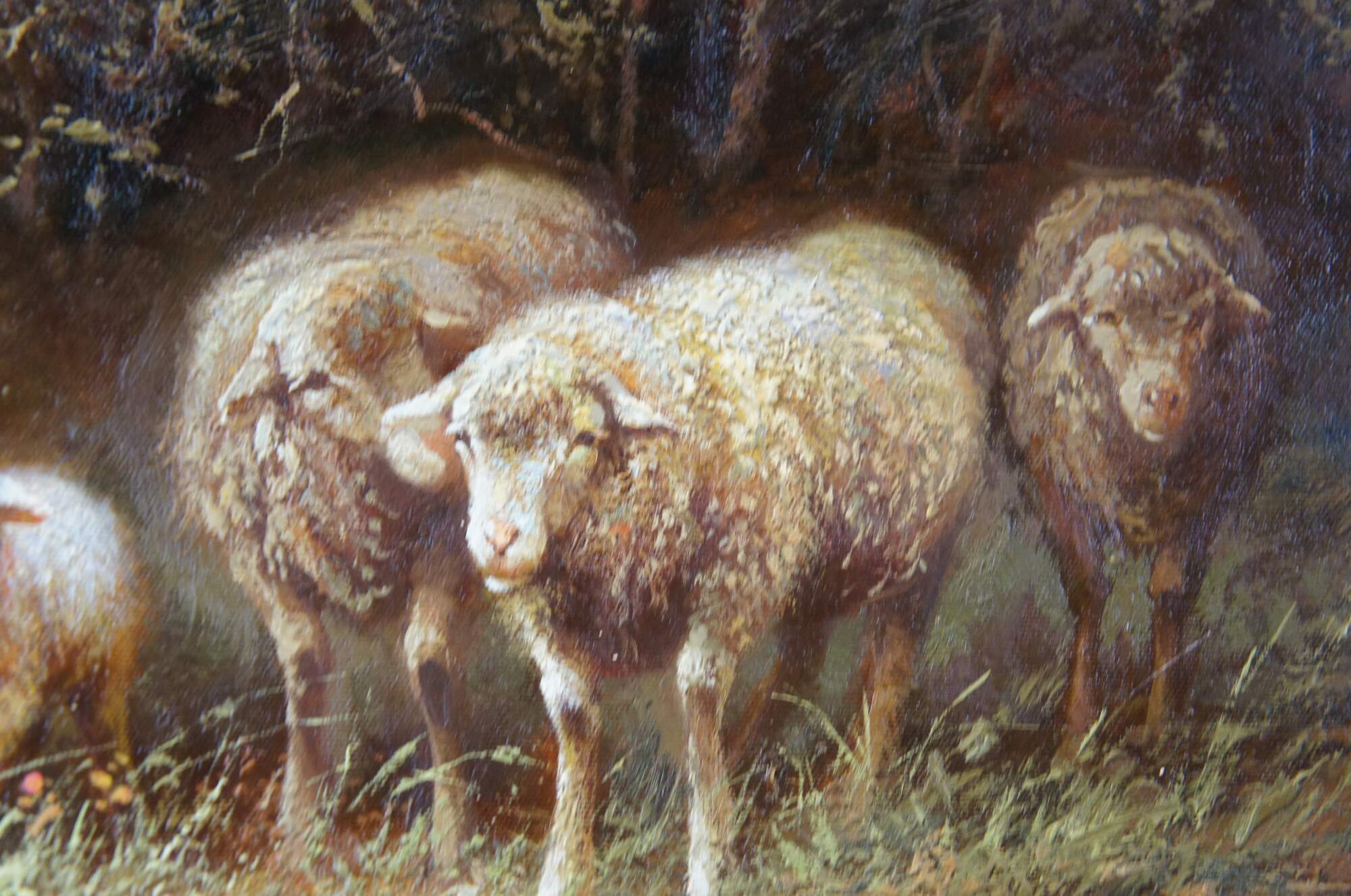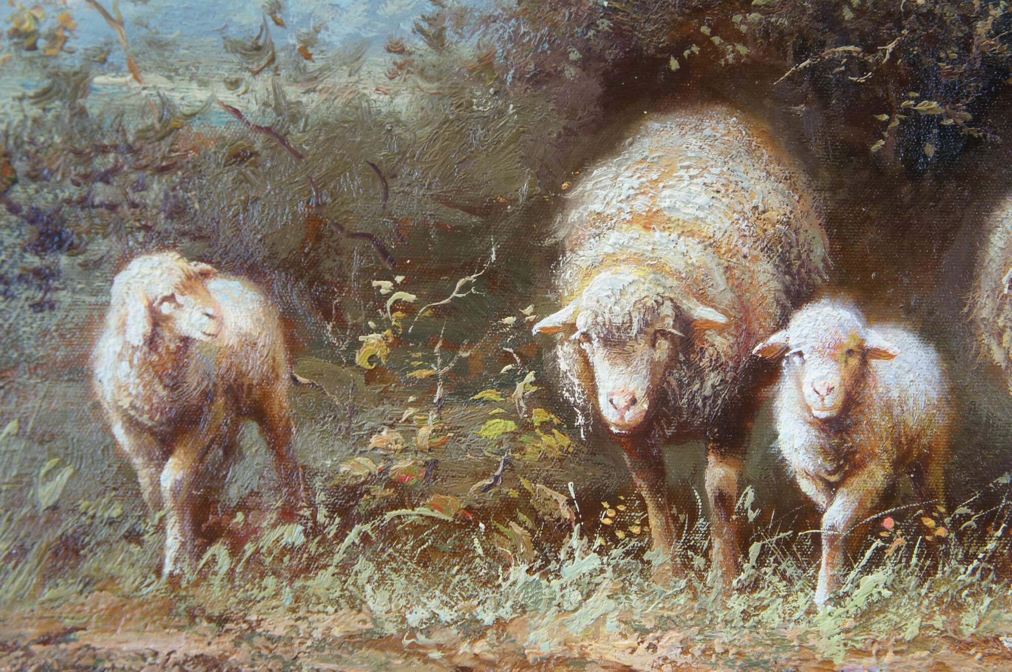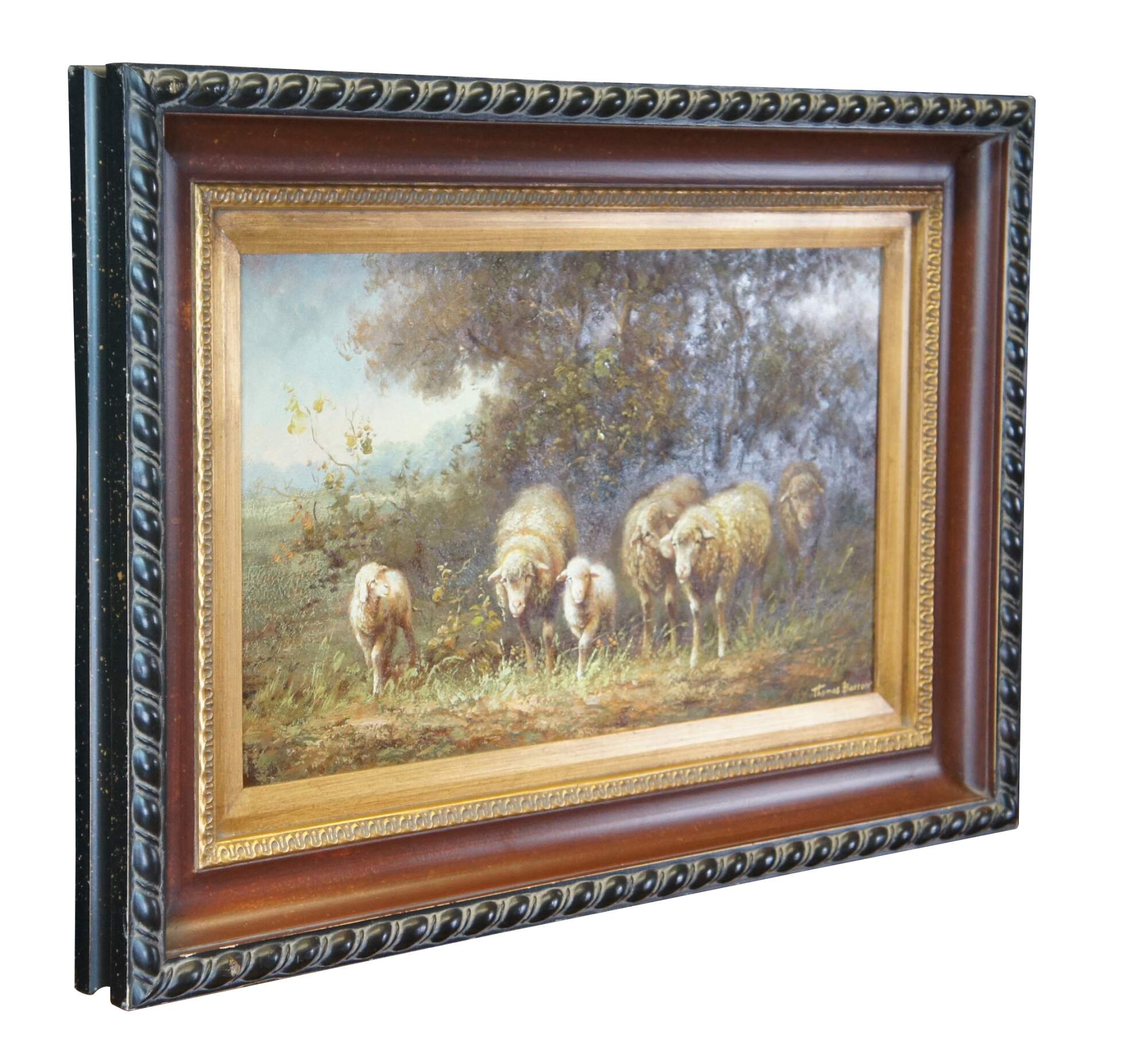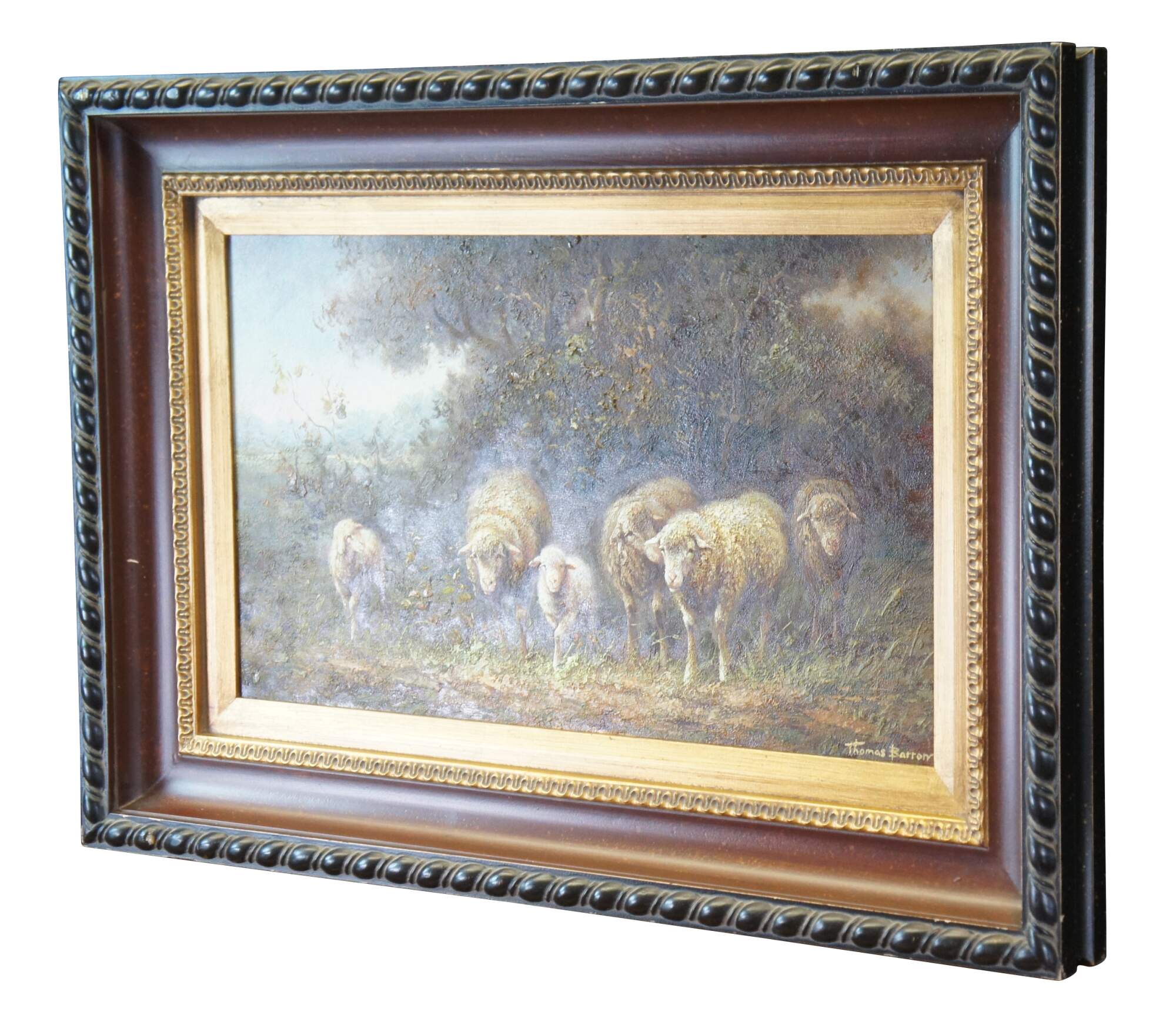 An impressive oil painting depicting a pastoral flock of grazing sheep by Thomas Barron. Impressionism at is finest with vivid detail and color. The canvas is signed lower right. Framed in pine with gold egg and dart molding, beveled interior and rope twisted edge finished in black.