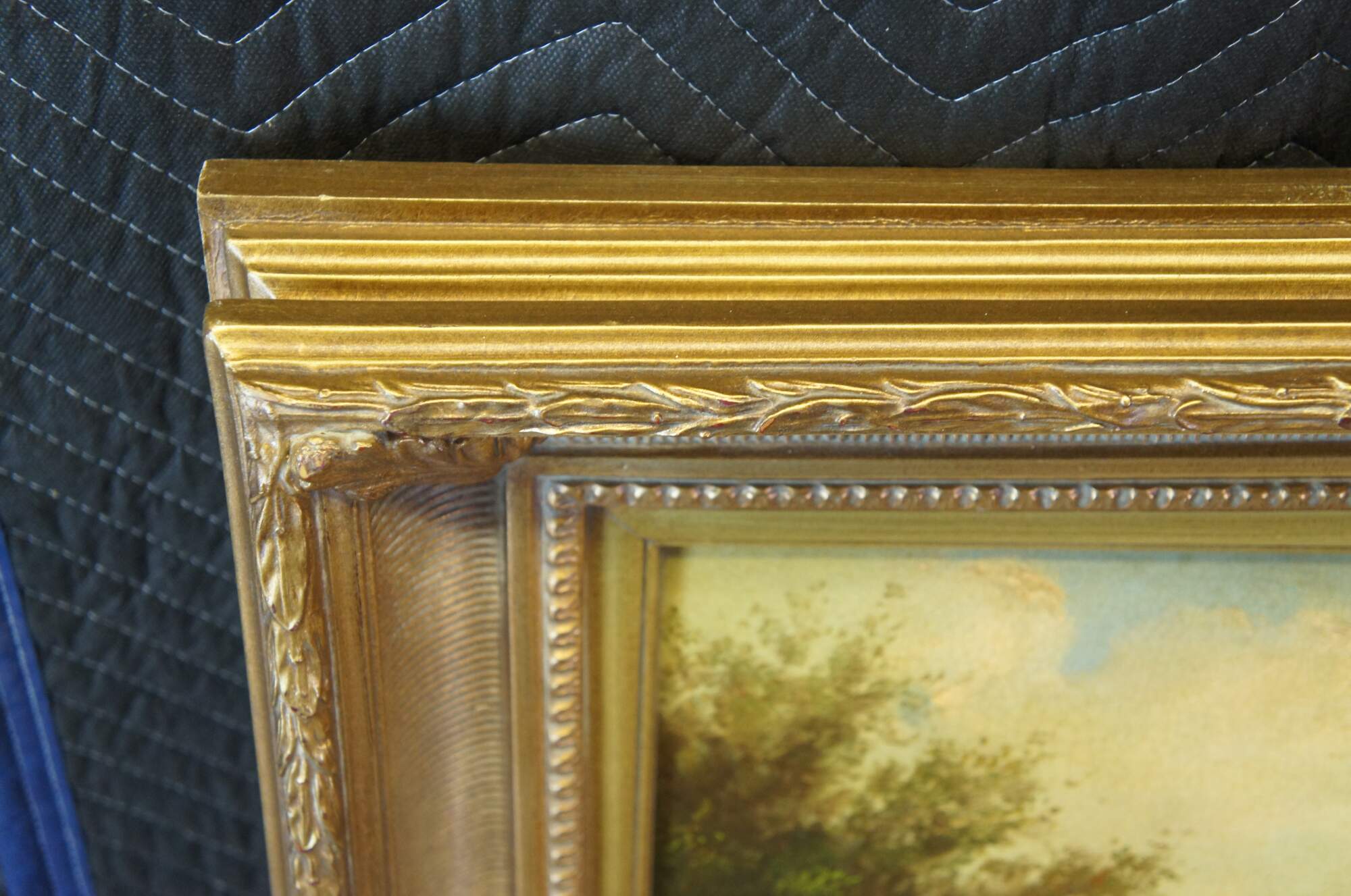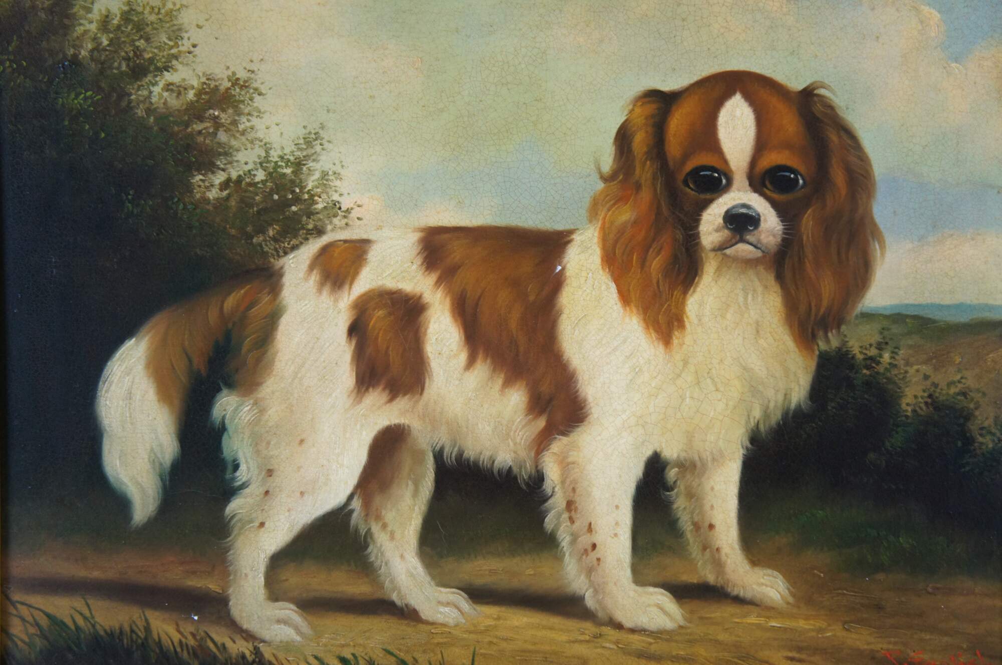 Late 20th century oil painting by Paul English. Features a brown and white cavalier posing on a trail landscape. The canvas is signed lower right and framed in gold. Paul English (contemporary) is active/lives in United Kingdom.