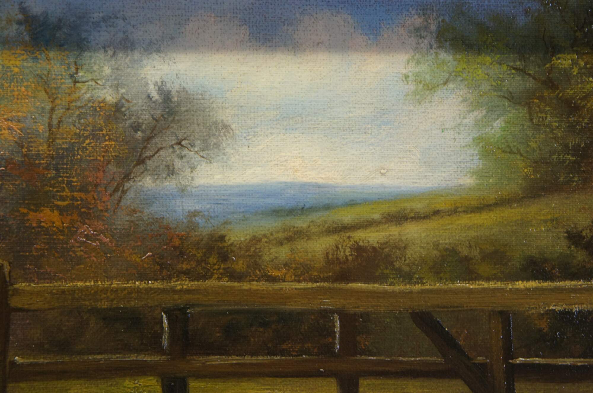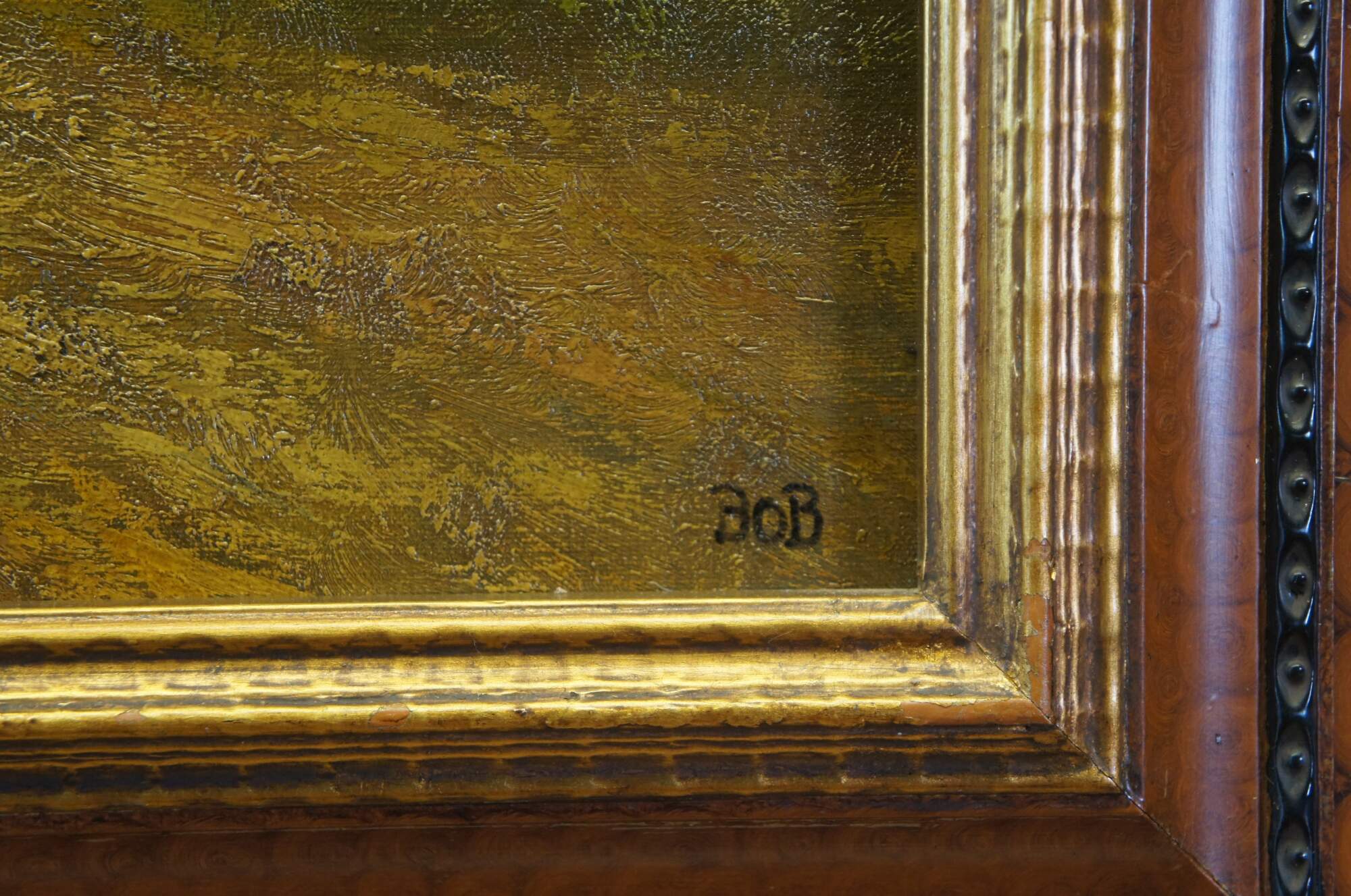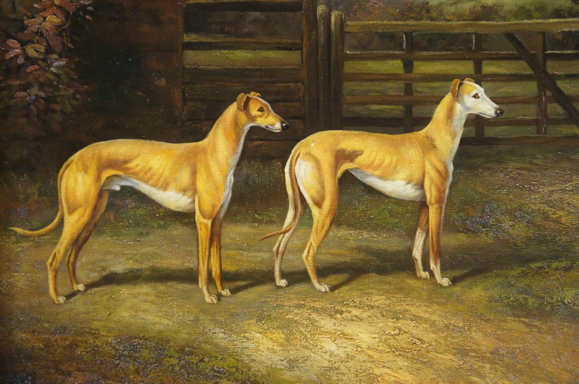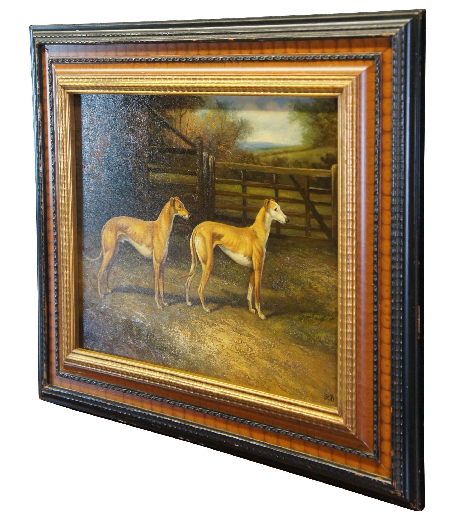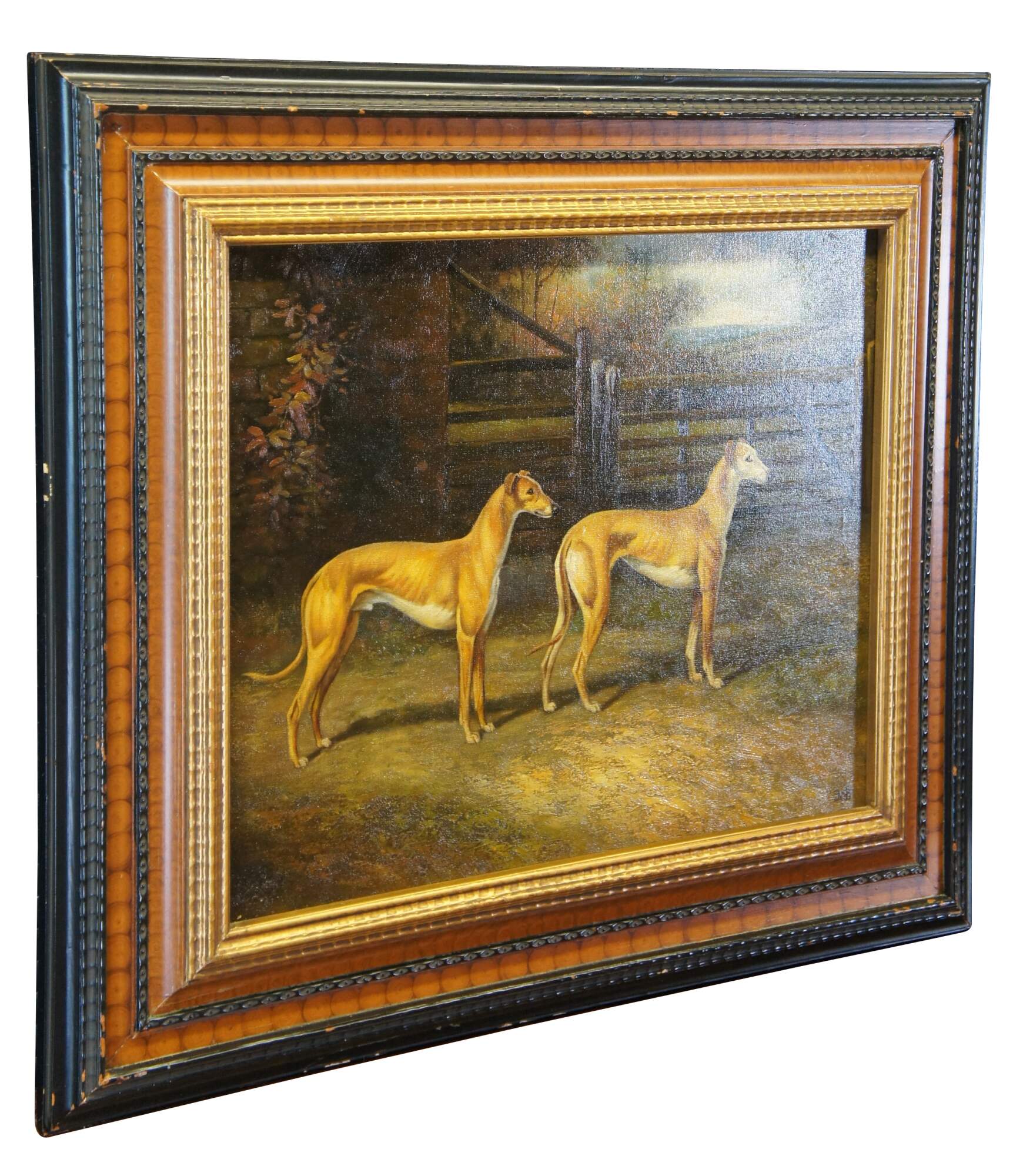 Late 20th century painting titled Fellow from Wales and Silvery Sand, After Heywood Hardy. Features two Greyhounds set within a country landscape with a fence and trees in the background. Signed BOB lower right. Framed in ornate pine.