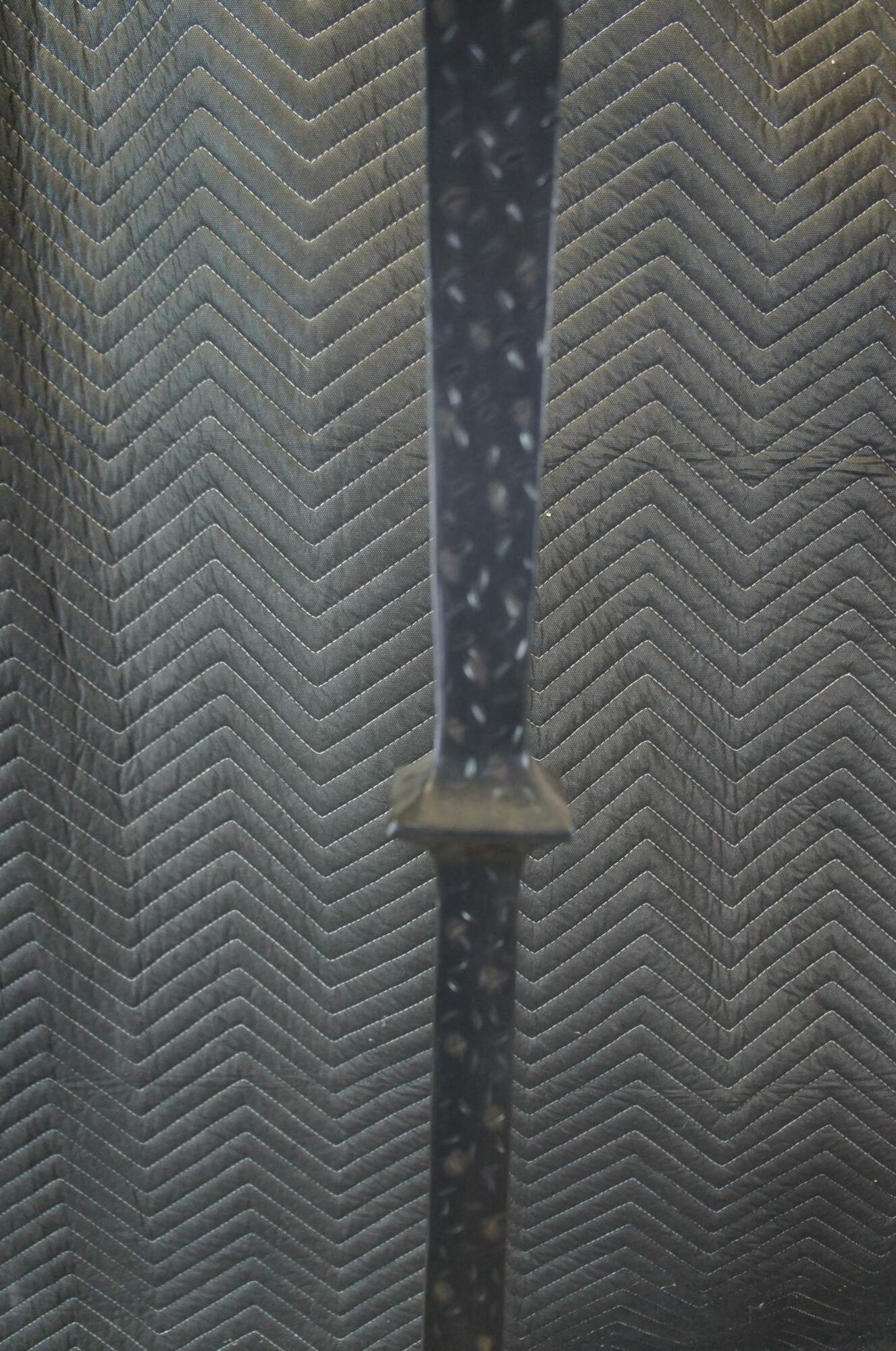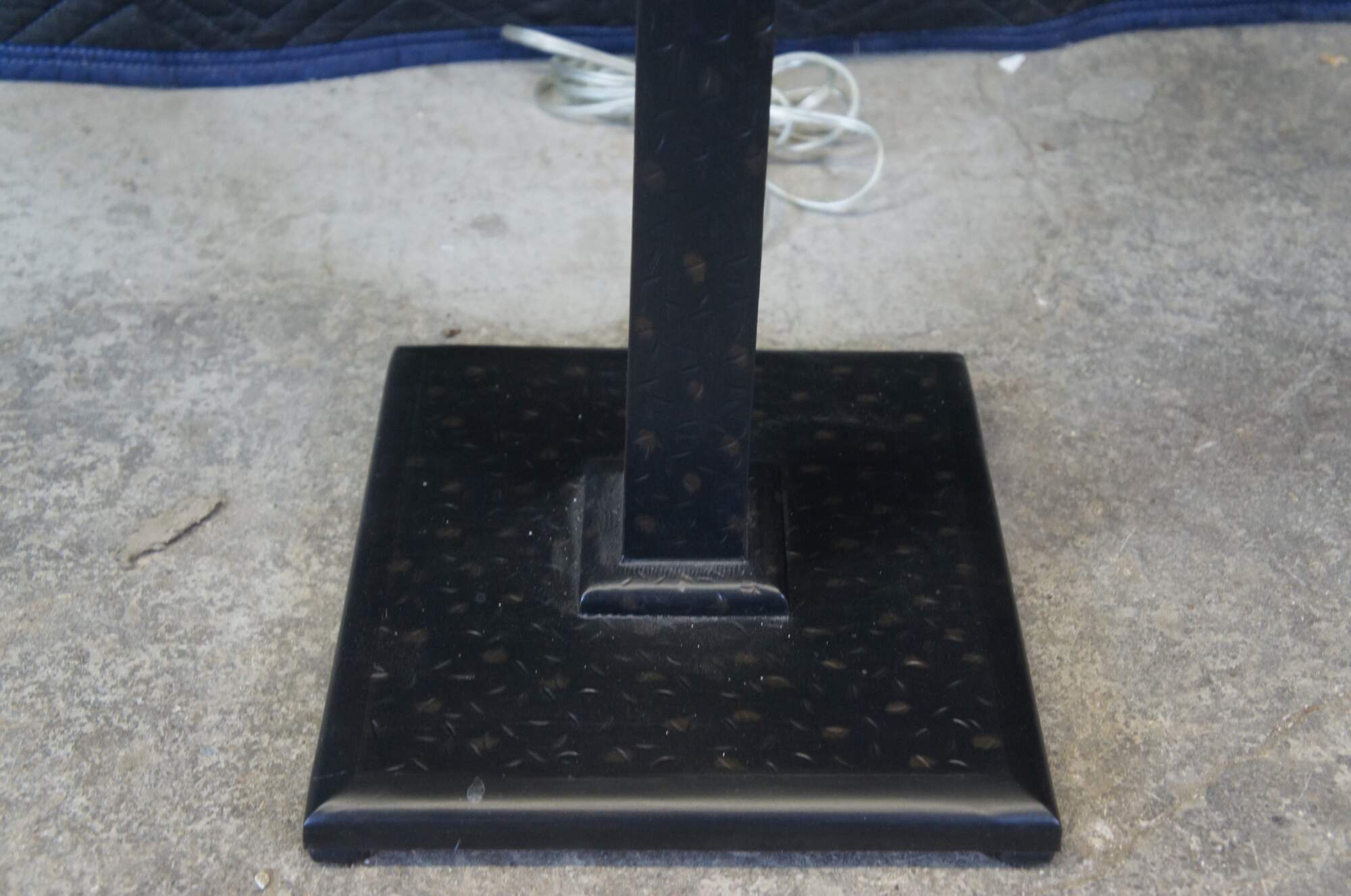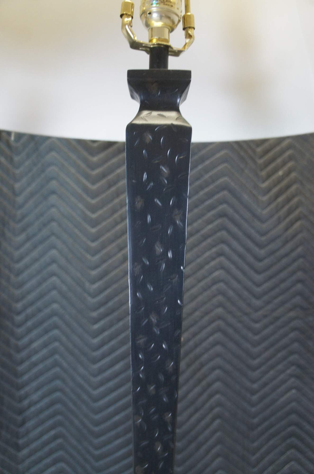 Distressed iron floor lamp. Features a square center and base with tapered shade.
