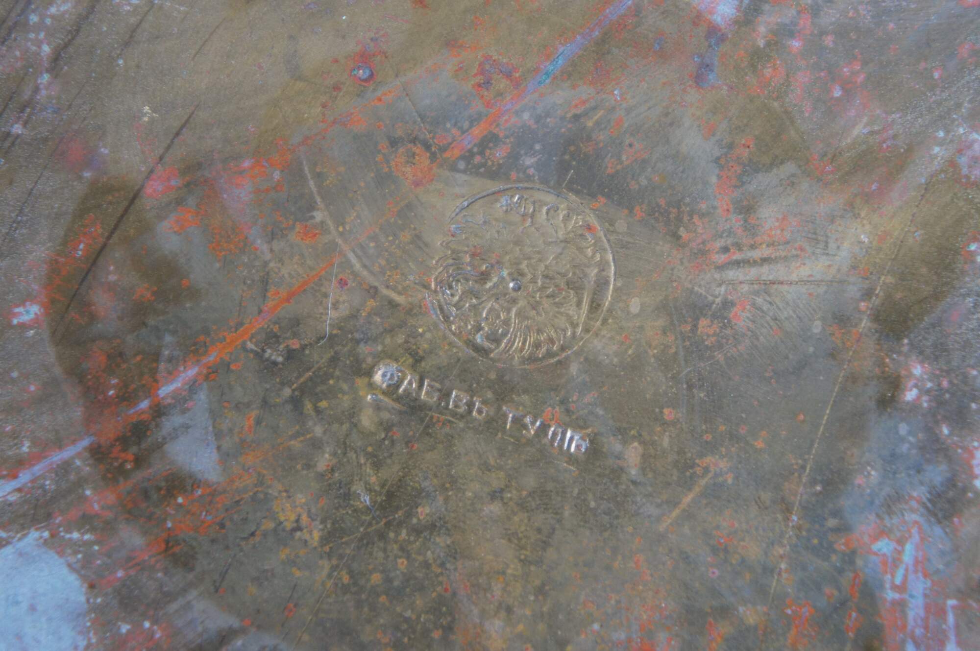 Antique arts and crafts Russian made floor vase / umbrella / cane stand, crafted of brass with a lobed base and rim, copper bands, lion's head door knocker style handles and claw / paw feet. Marked in Cyrillic on base.