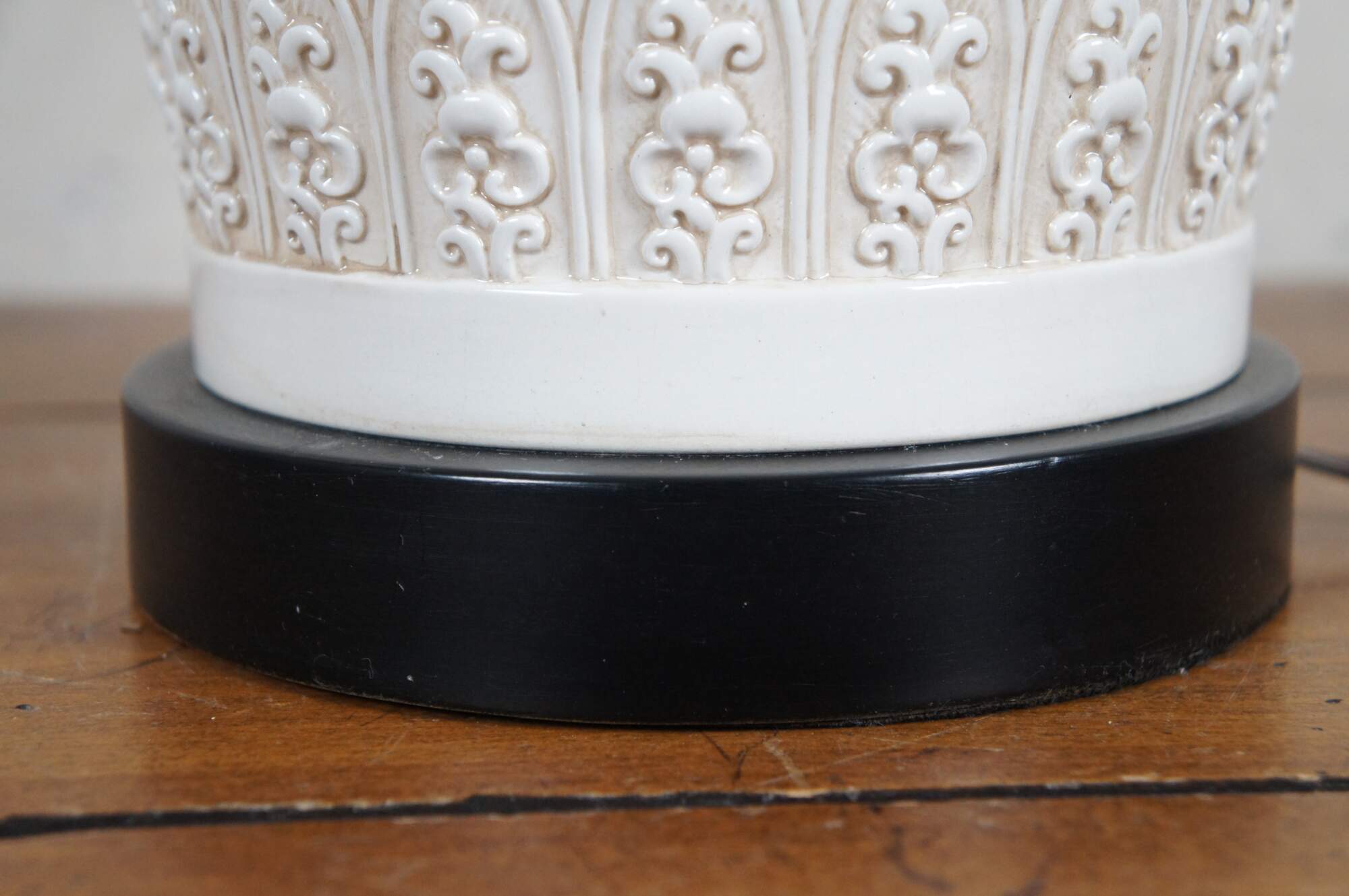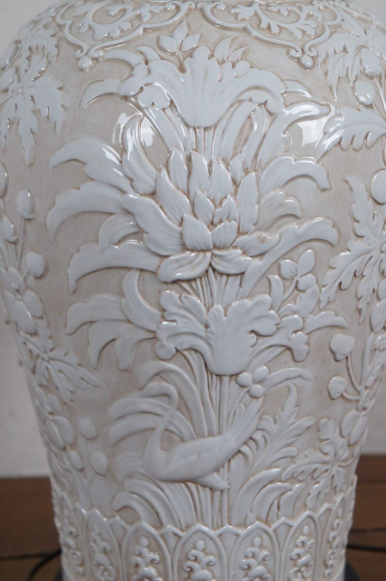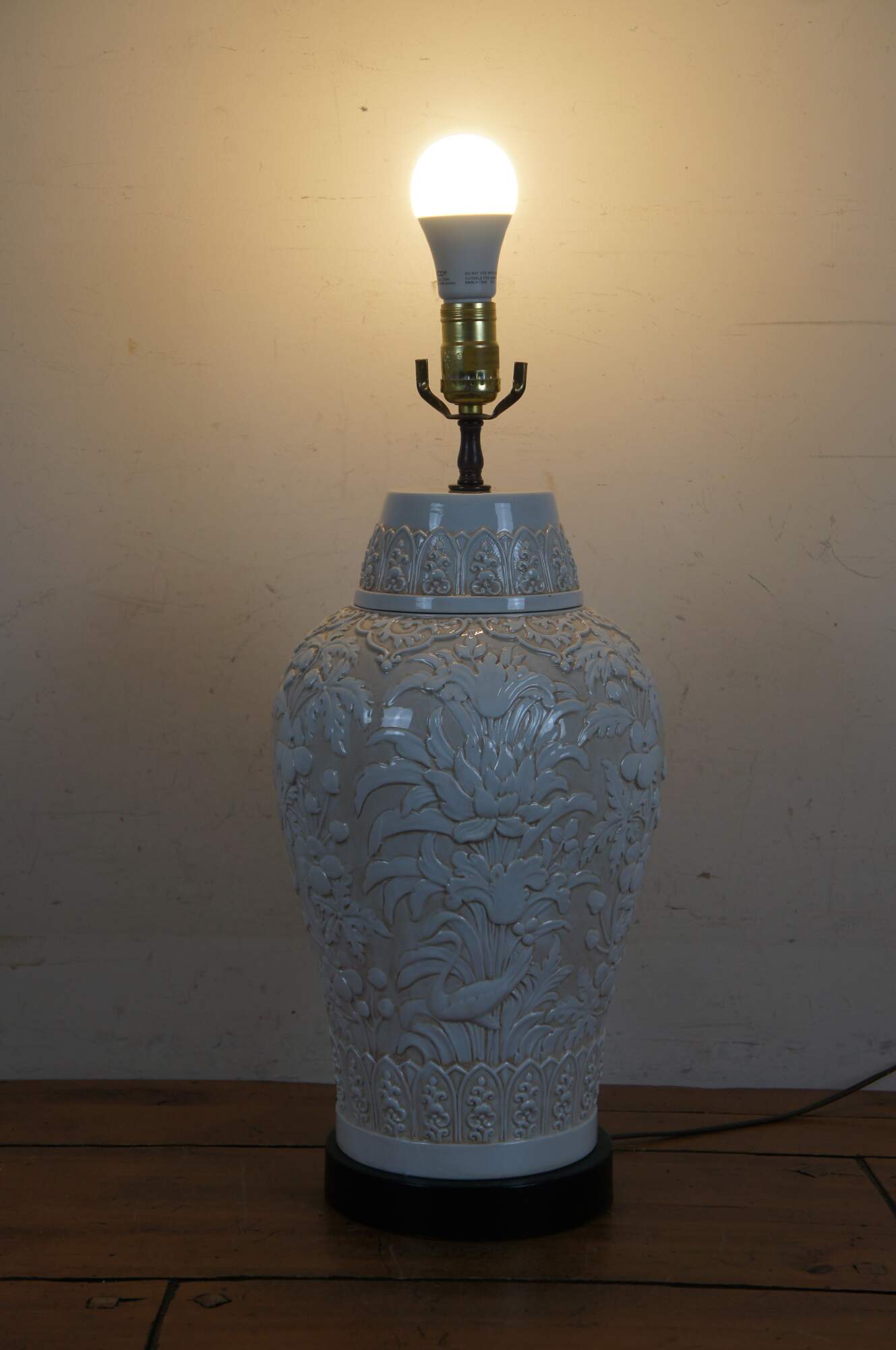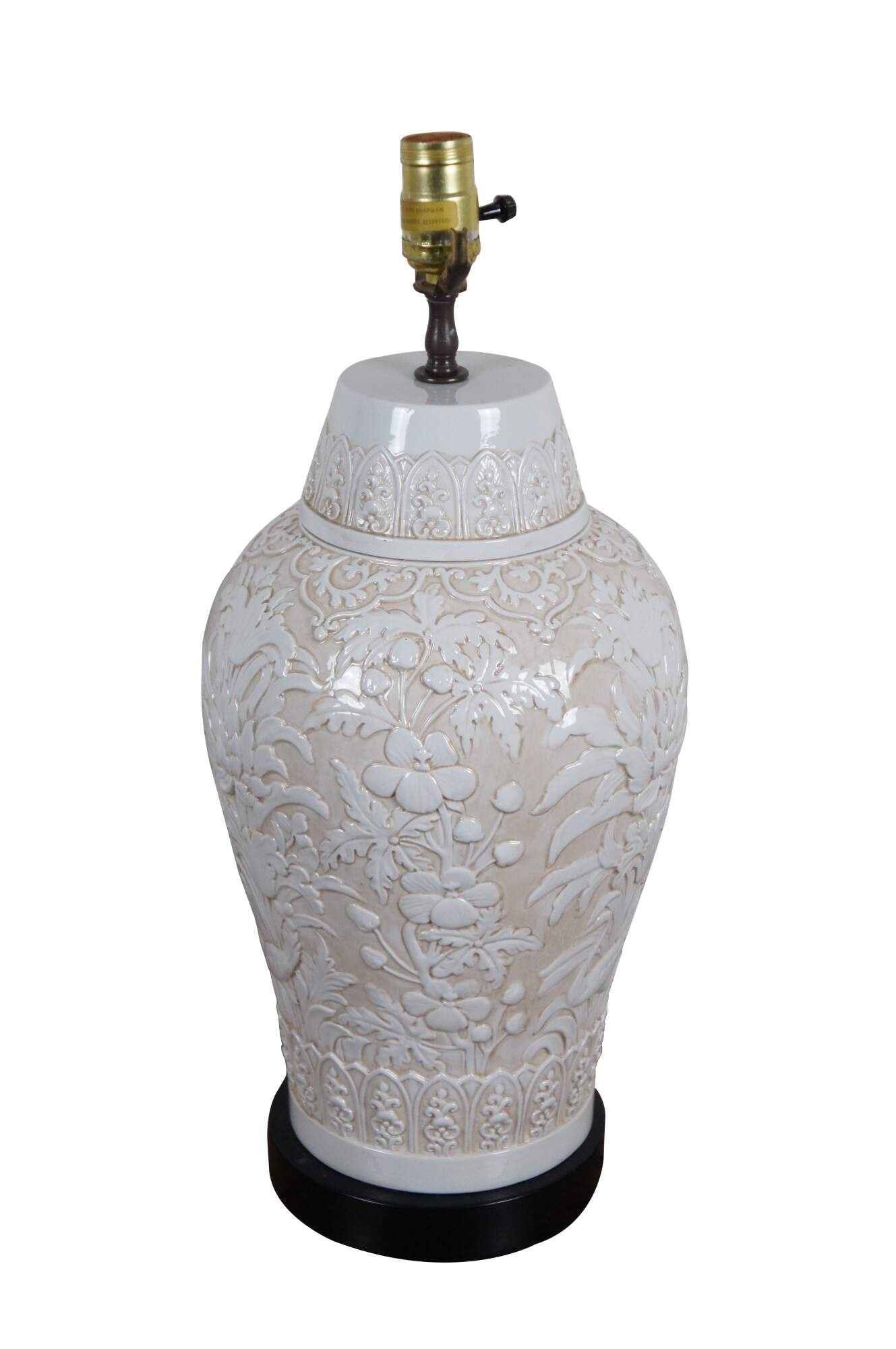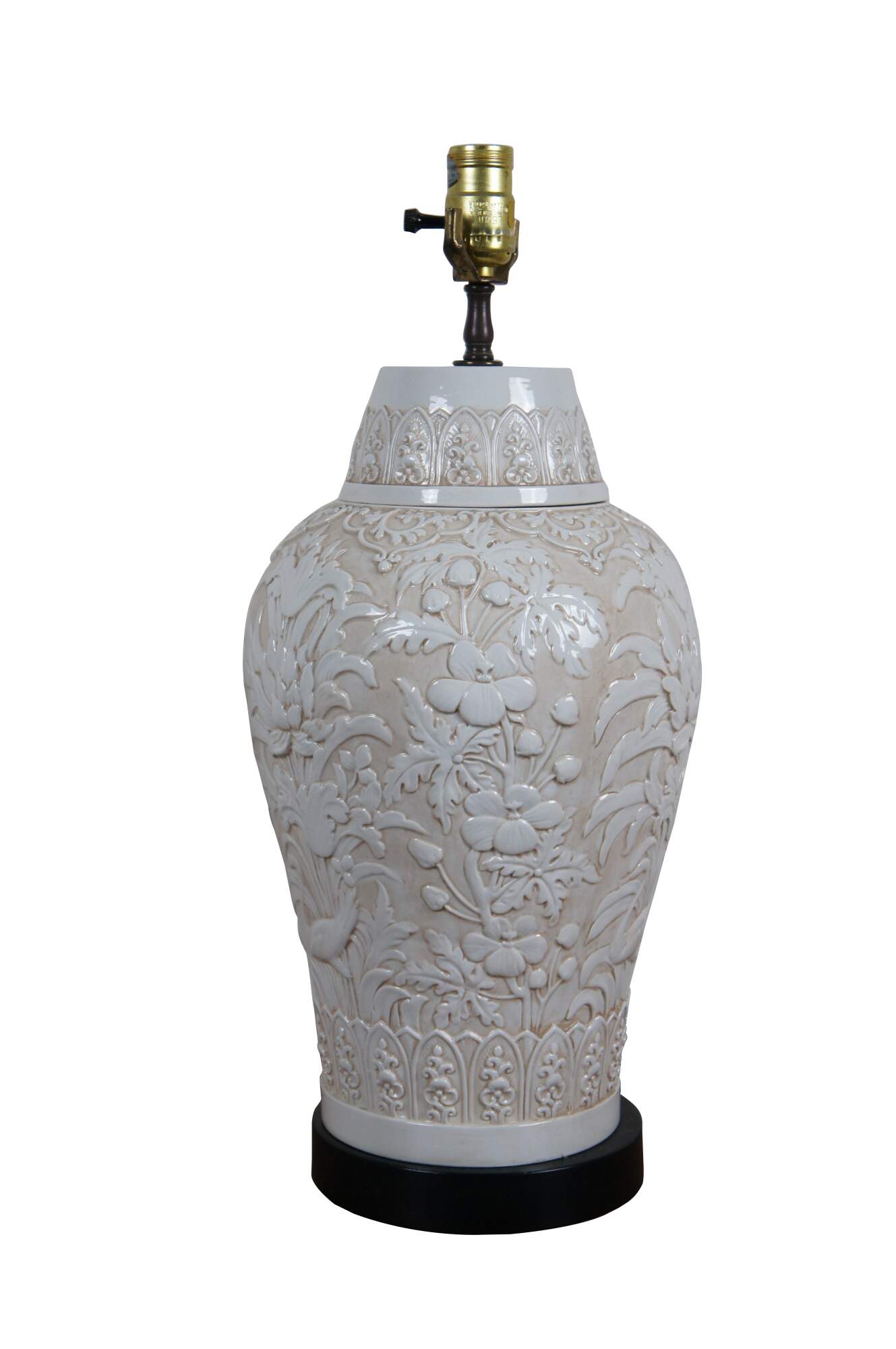 Vintage 1972 Chapman table lamp, crafted from porcelain featuring a chinoiserie design of flowers / chrysanthemum and birds in white relief on a beige ground, mounted on a simple black base. No harp or shade.