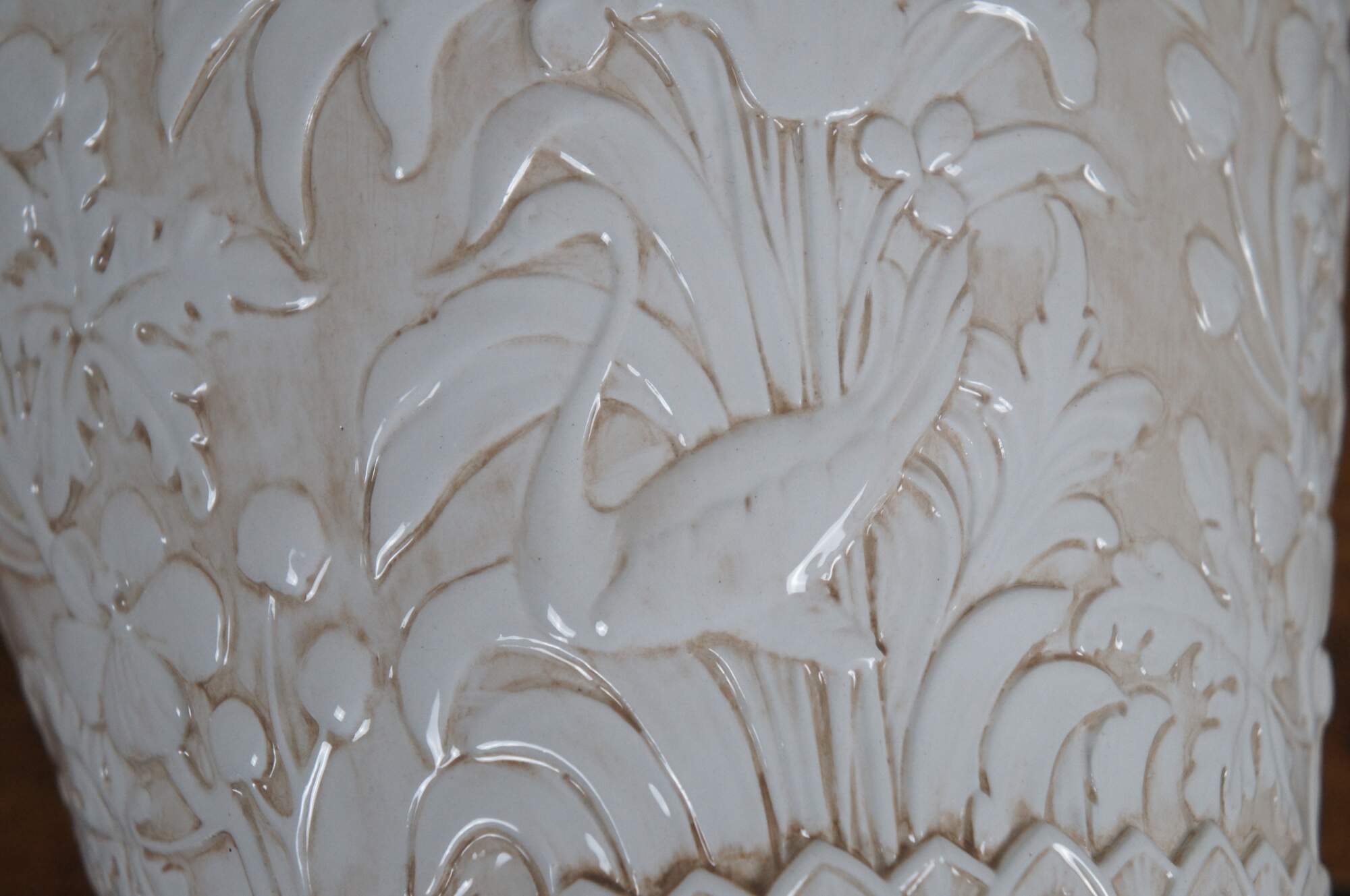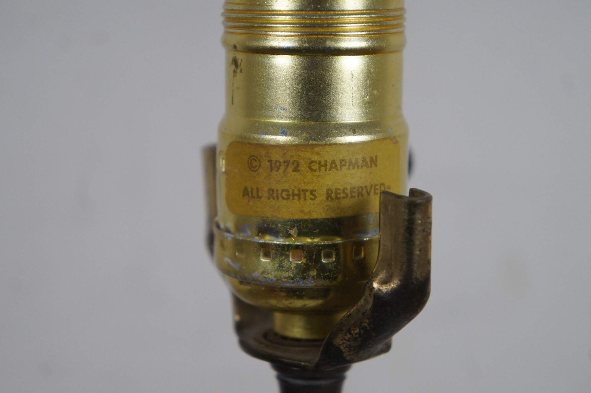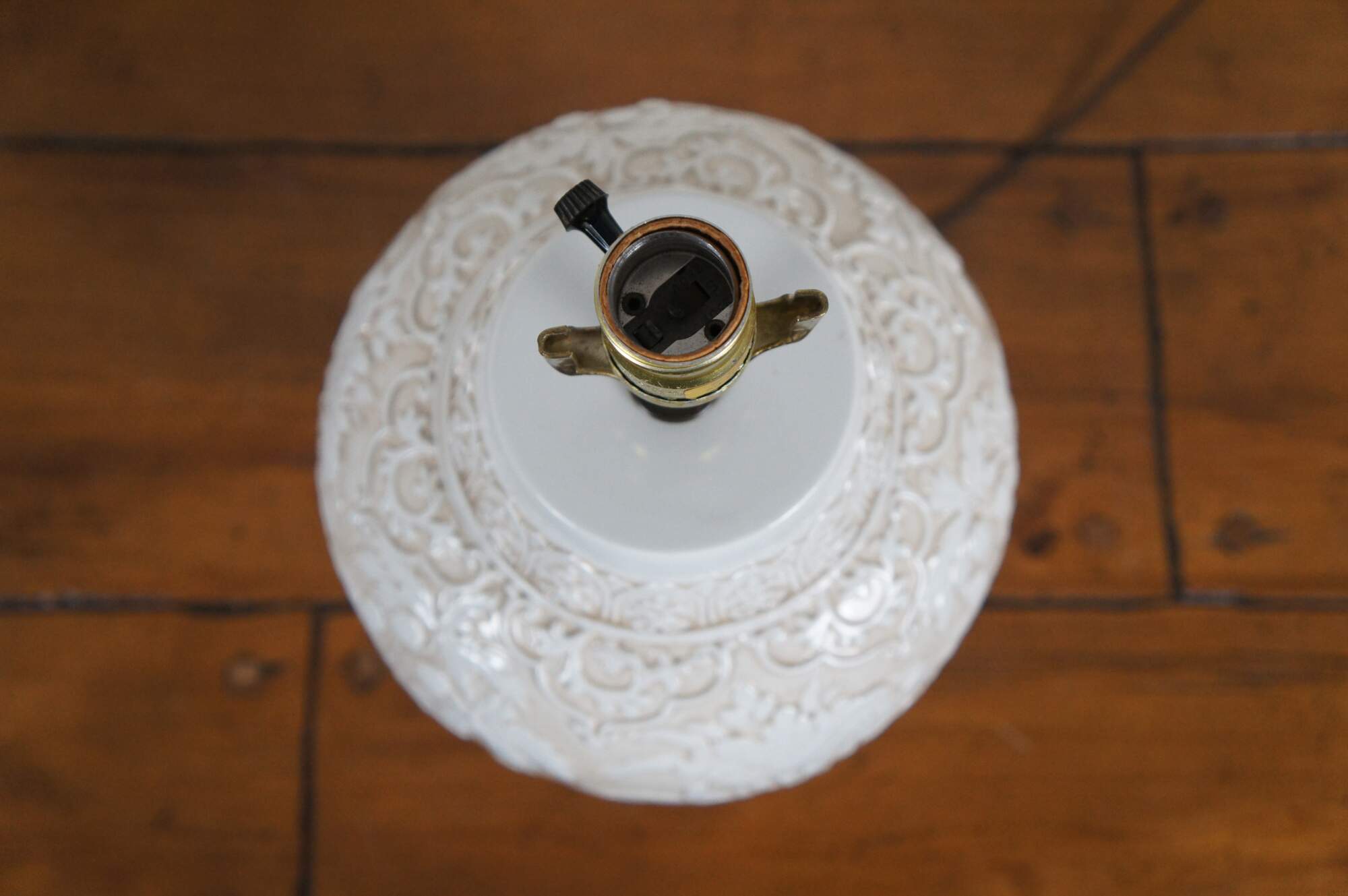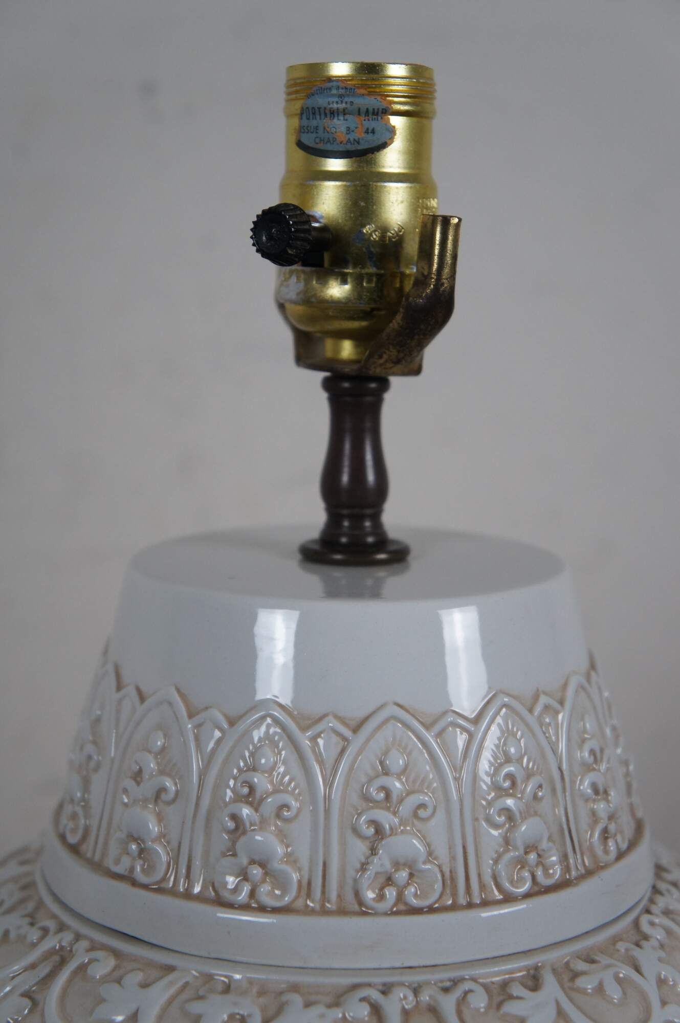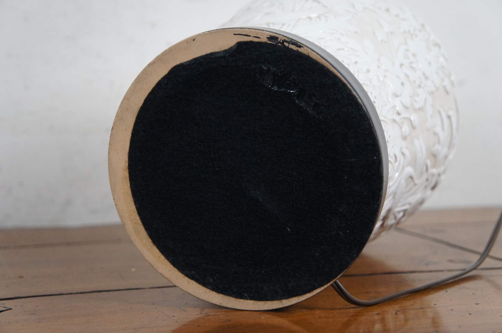Vintage 1972 Chapman table lamp, crafted from porcelain featuring a chinoiserie design of flowers / chrysanthemum and birds in white relief on a beige ground, mounted on a simple black base. No harp or shade.