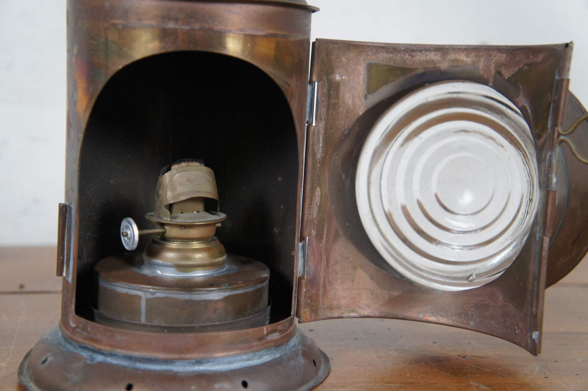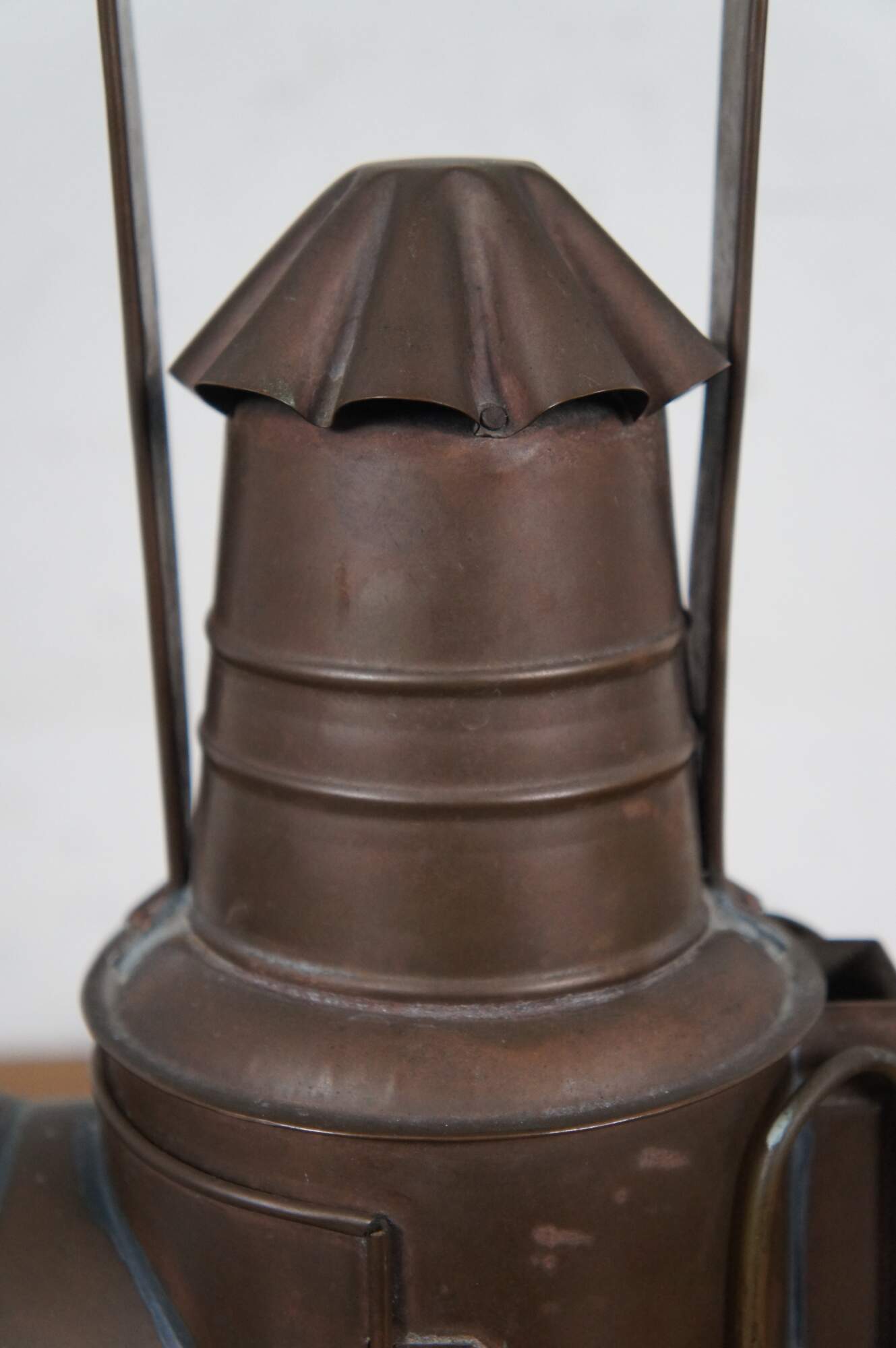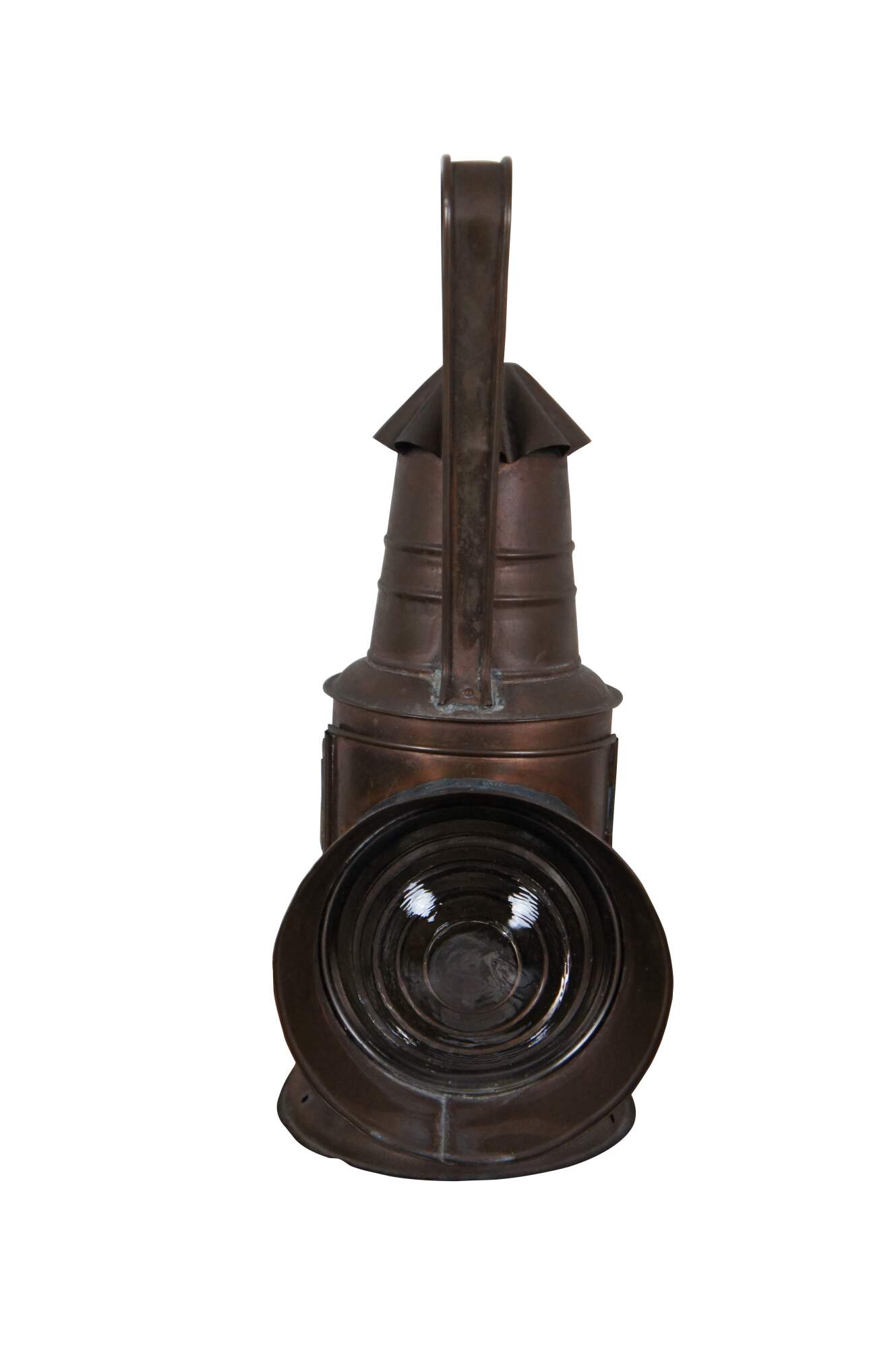 Antique copper police/ railroad / boat signal lantern / hand lamp. Features cylindrical body style, fluted cone shaped chimney top, and rear handles of a typical dark lantern but no internal shutter for hiding the light. Fixed rectangular bail handle on top. Thick ridged bulls eye glass lens. Front with lens opens via wire latch. Removable oil reservoir and wick. Attributed to Nippon Sento Co, LTD of Tokyo Japan.
