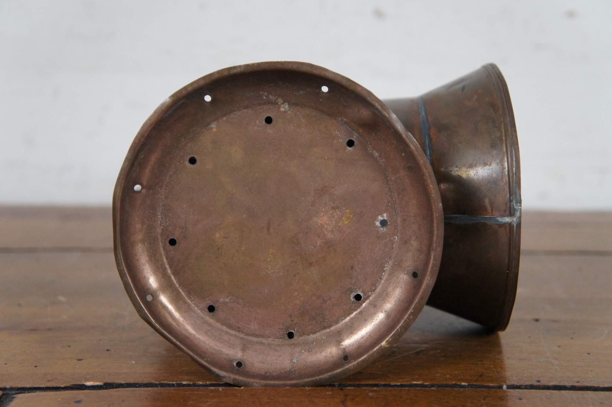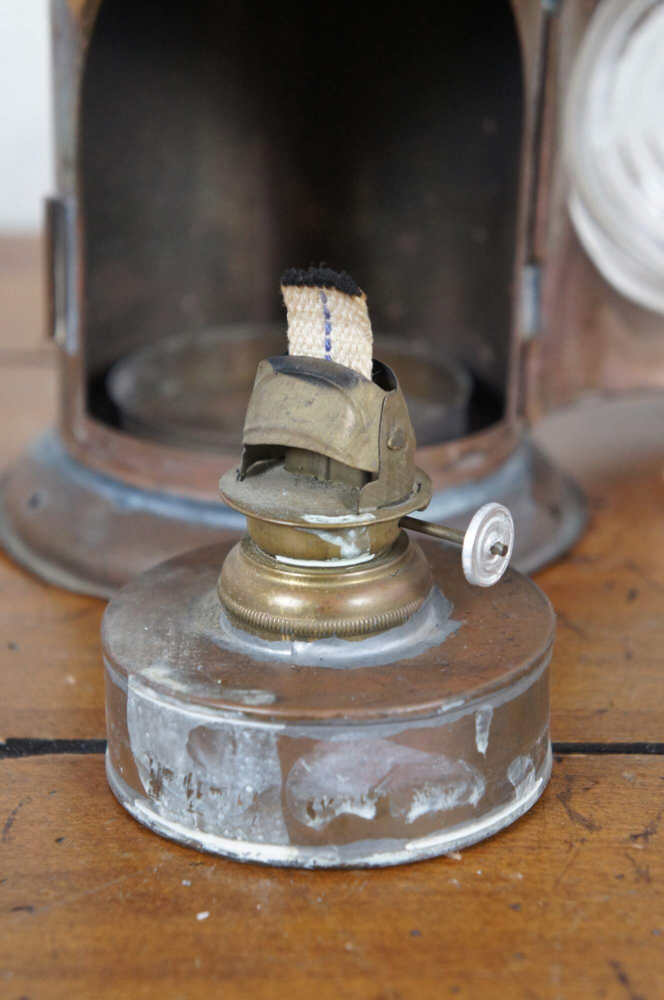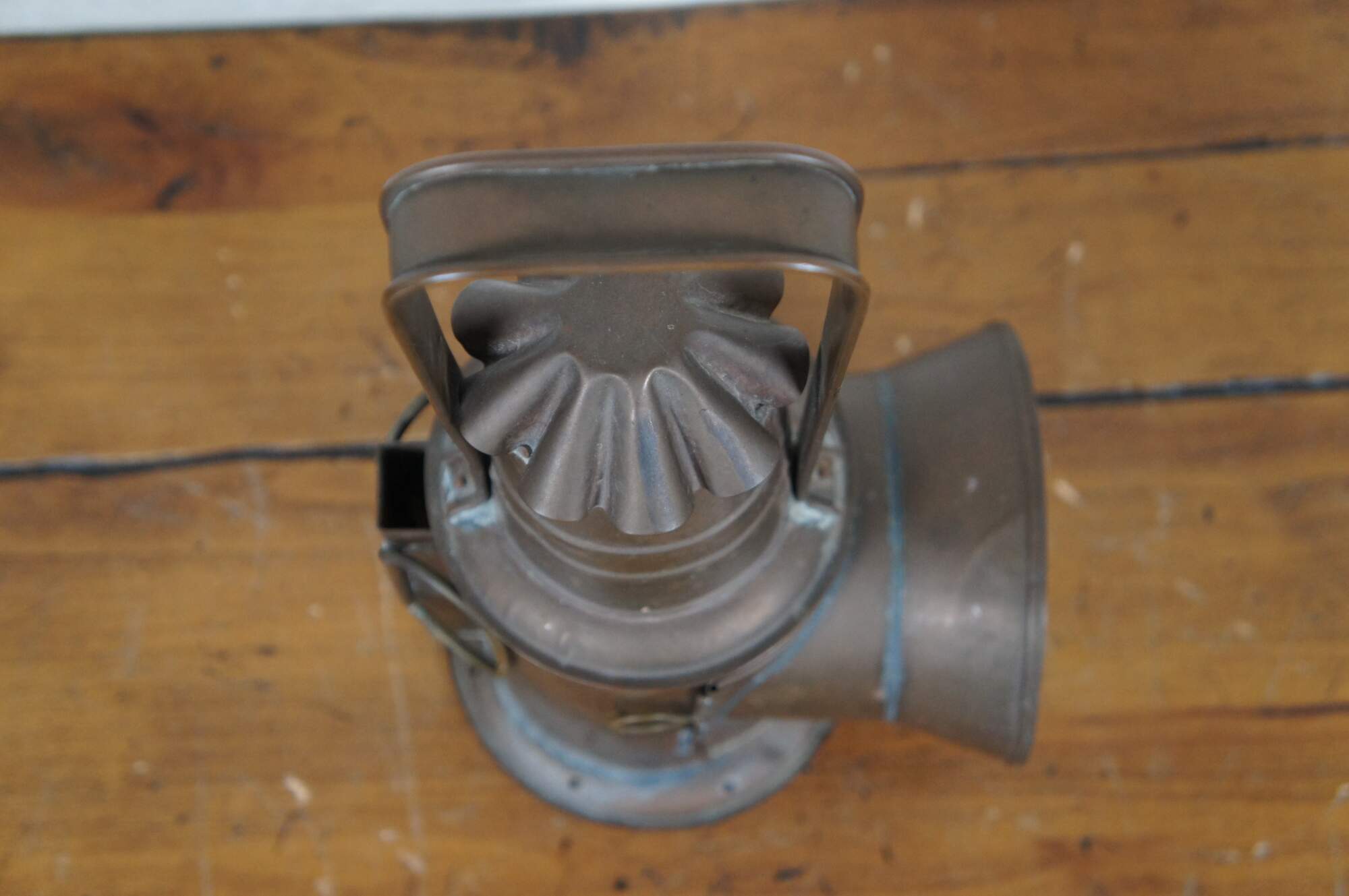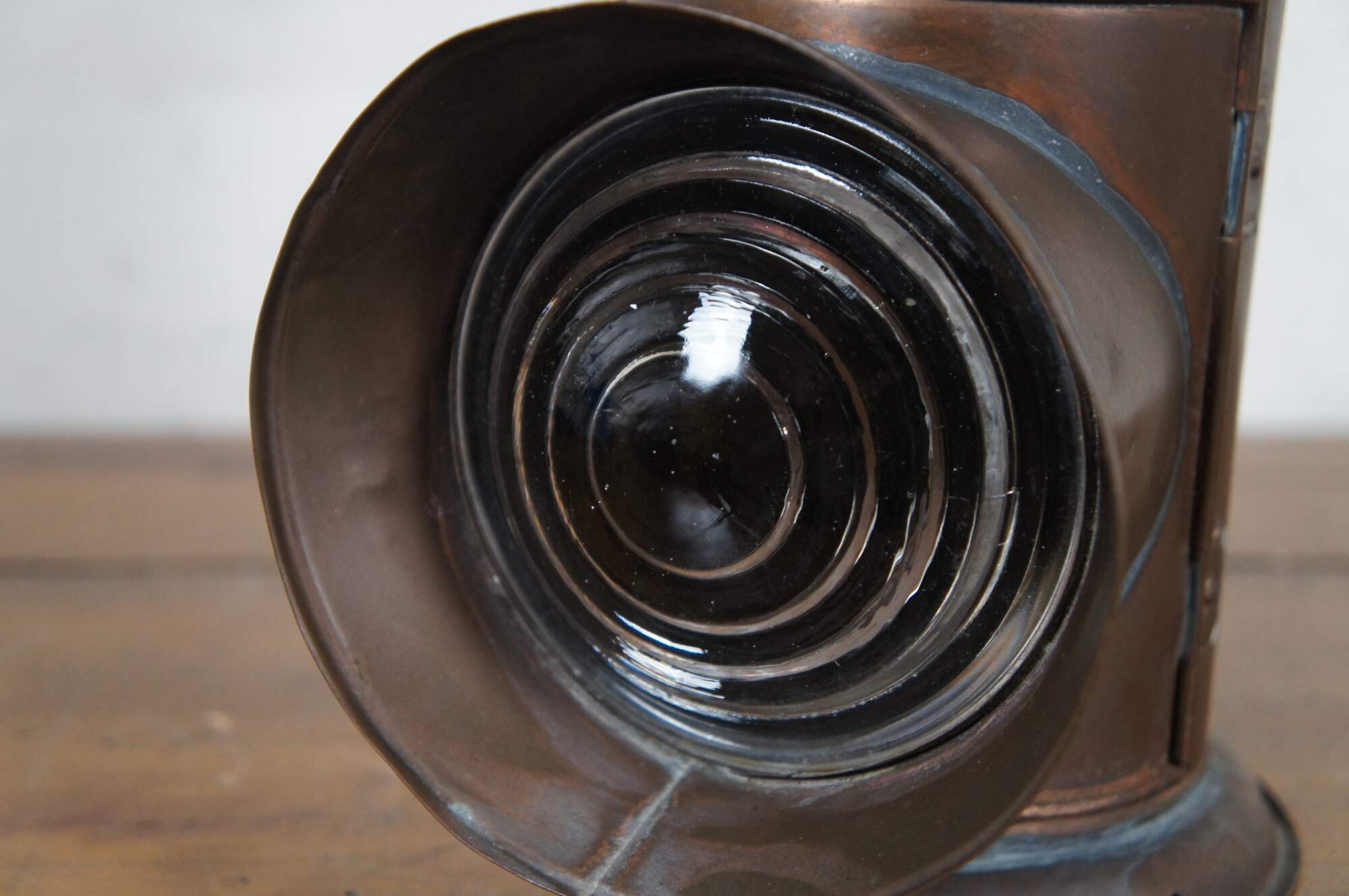 Antique copper police/ railroad / boat signal lantern / hand lamp. Features cylindrical body style, fluted cone shaped chimney top, and rear handles of a typical dark lantern but no internal shutter for hiding the light. Fixed rectangular bail handle on top. Thick ridged bulls eye glass lens. Front with lens opens via wire latch. Removable oil reservoir and wick. Attributed to Nippon Sento Co, LTD of Tokyo Japan.