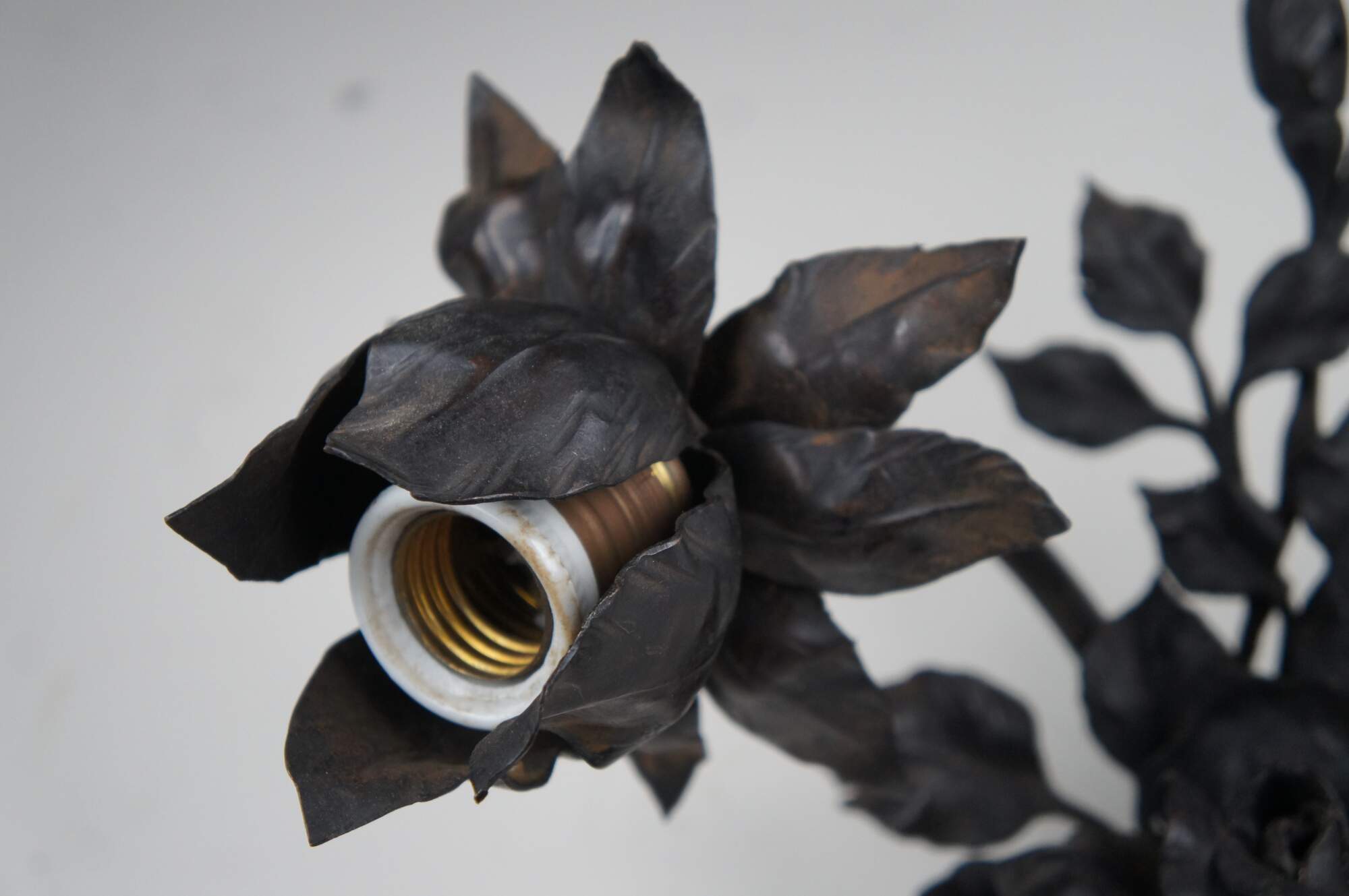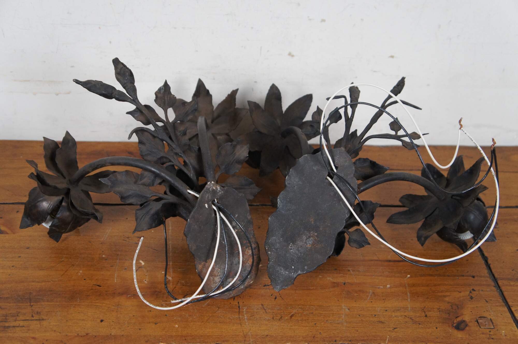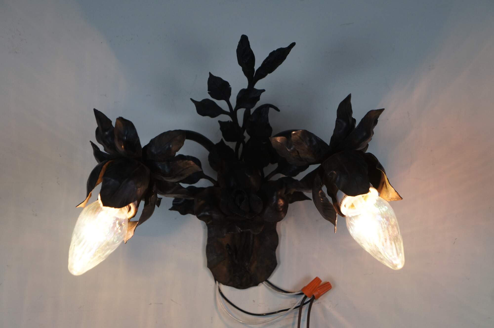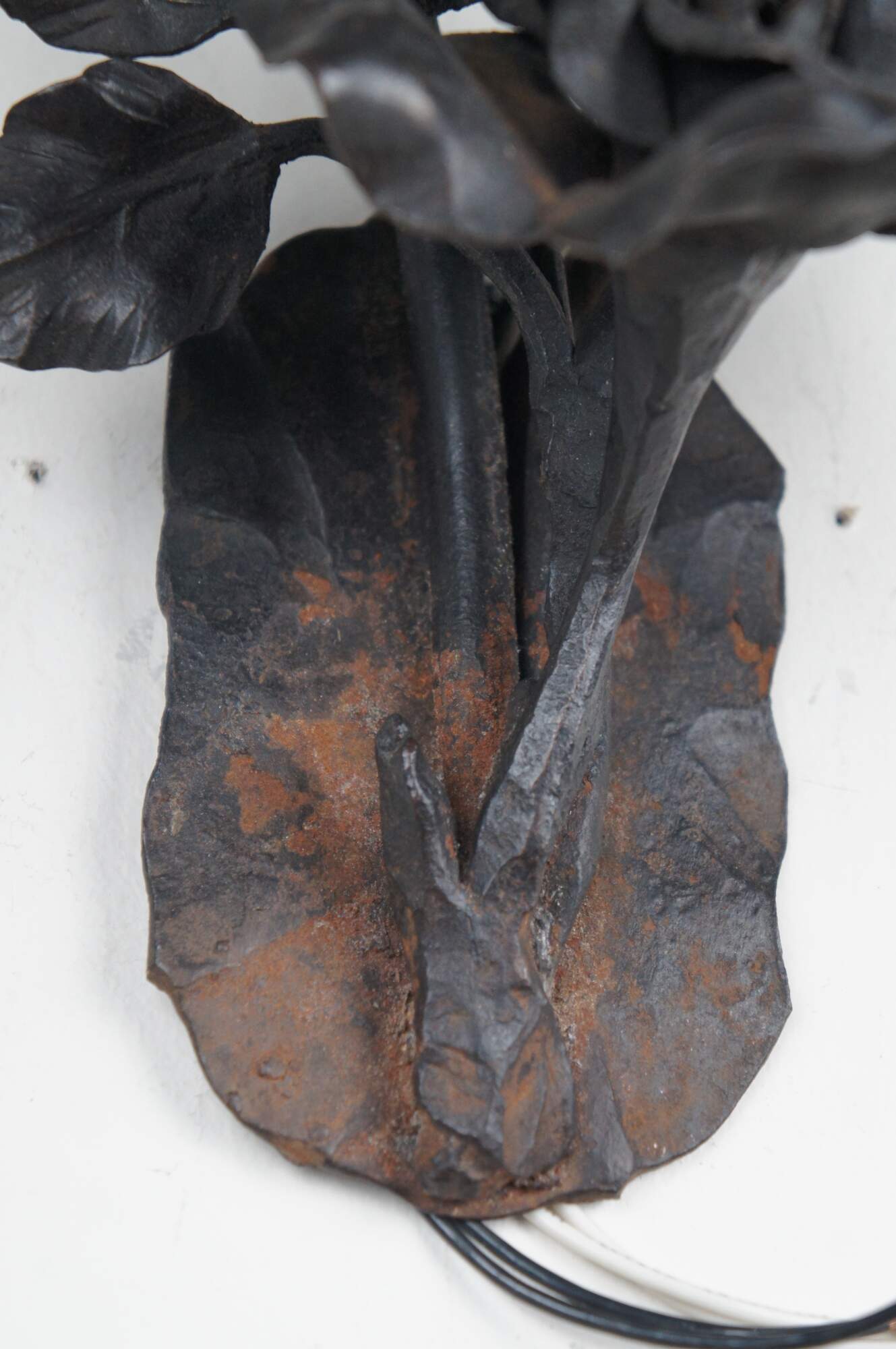 Pair of vintage iron two light electric wall sconces in the shape of cut roses with a subtle dark bronze finish.