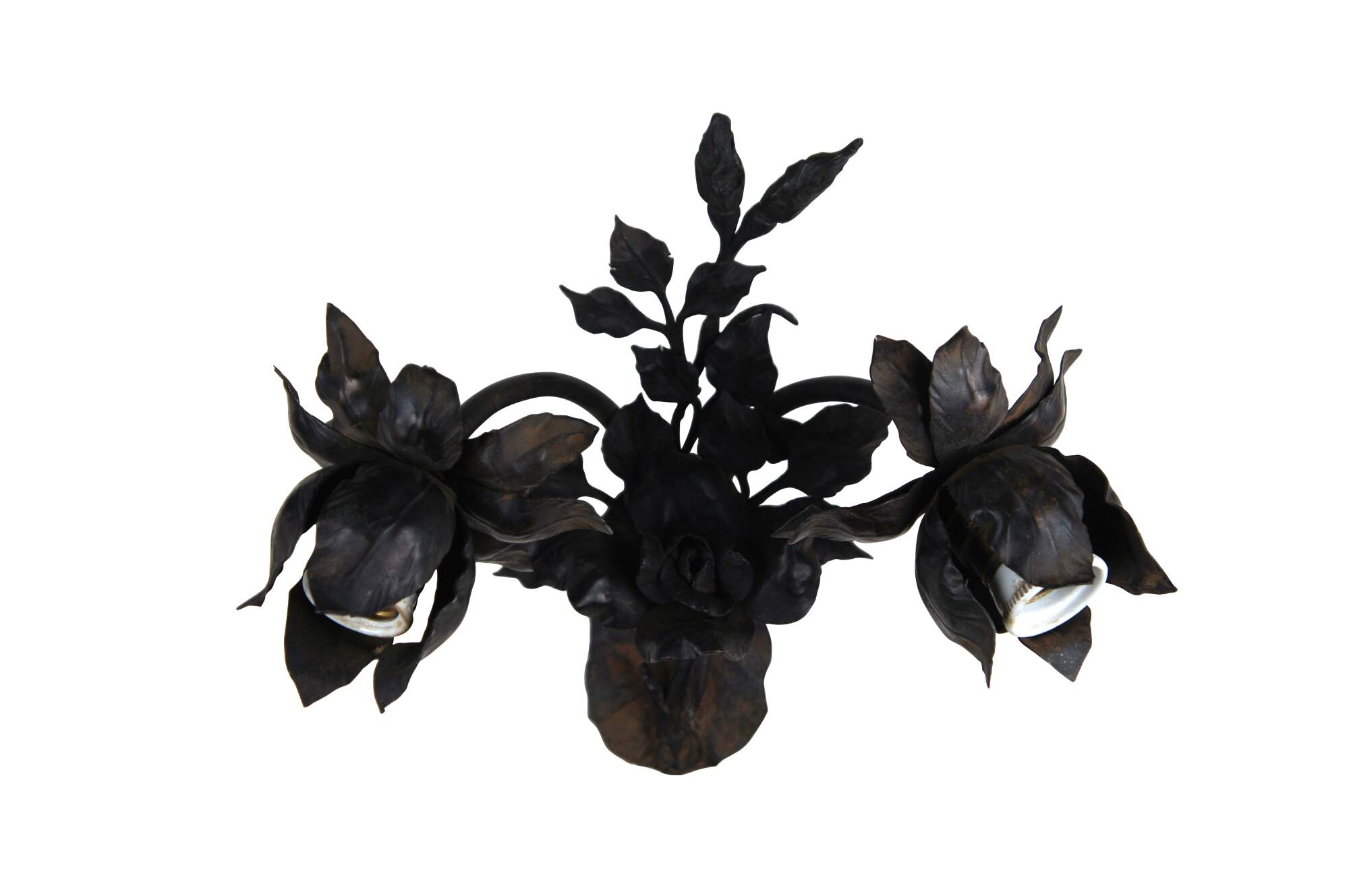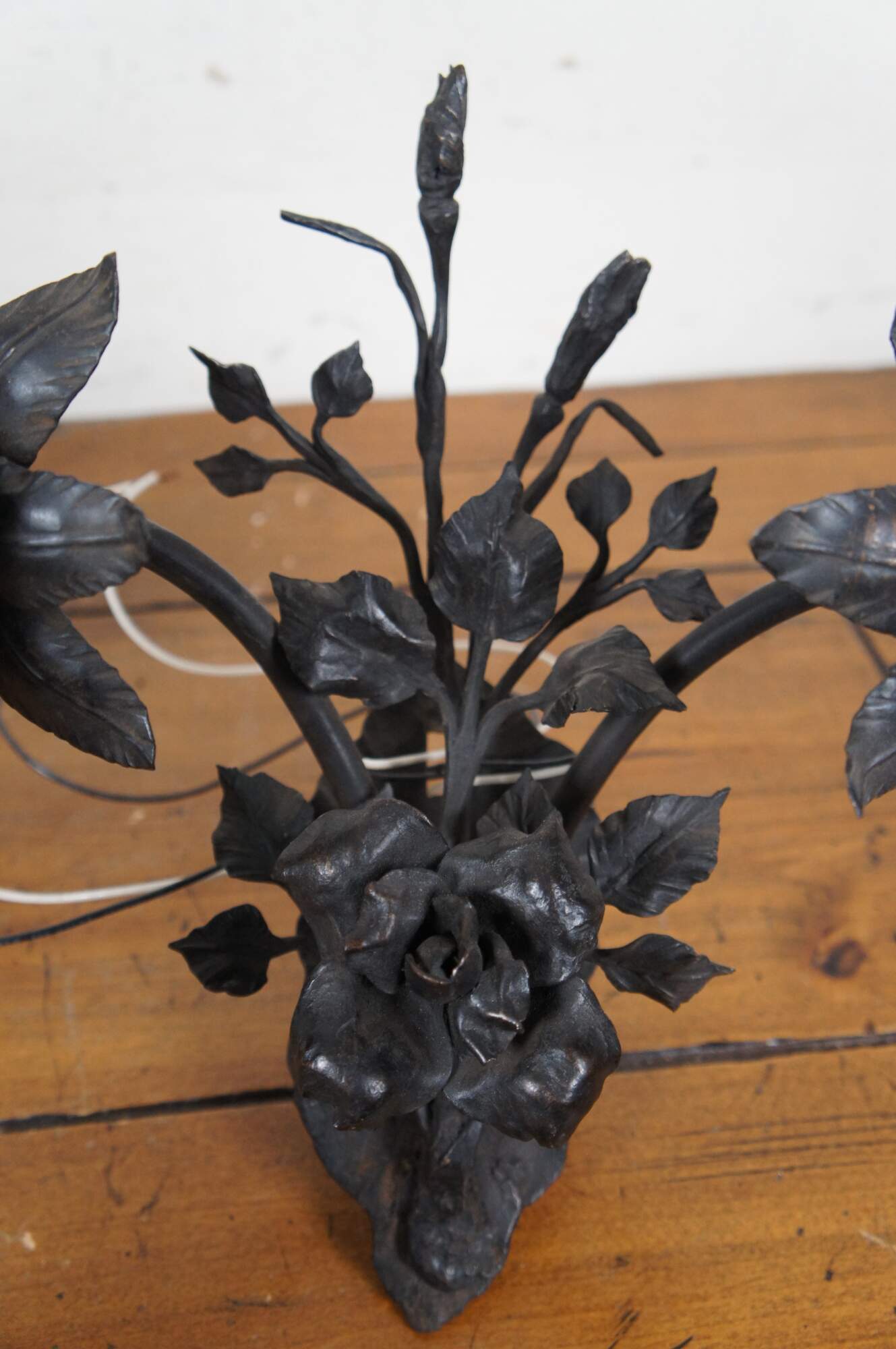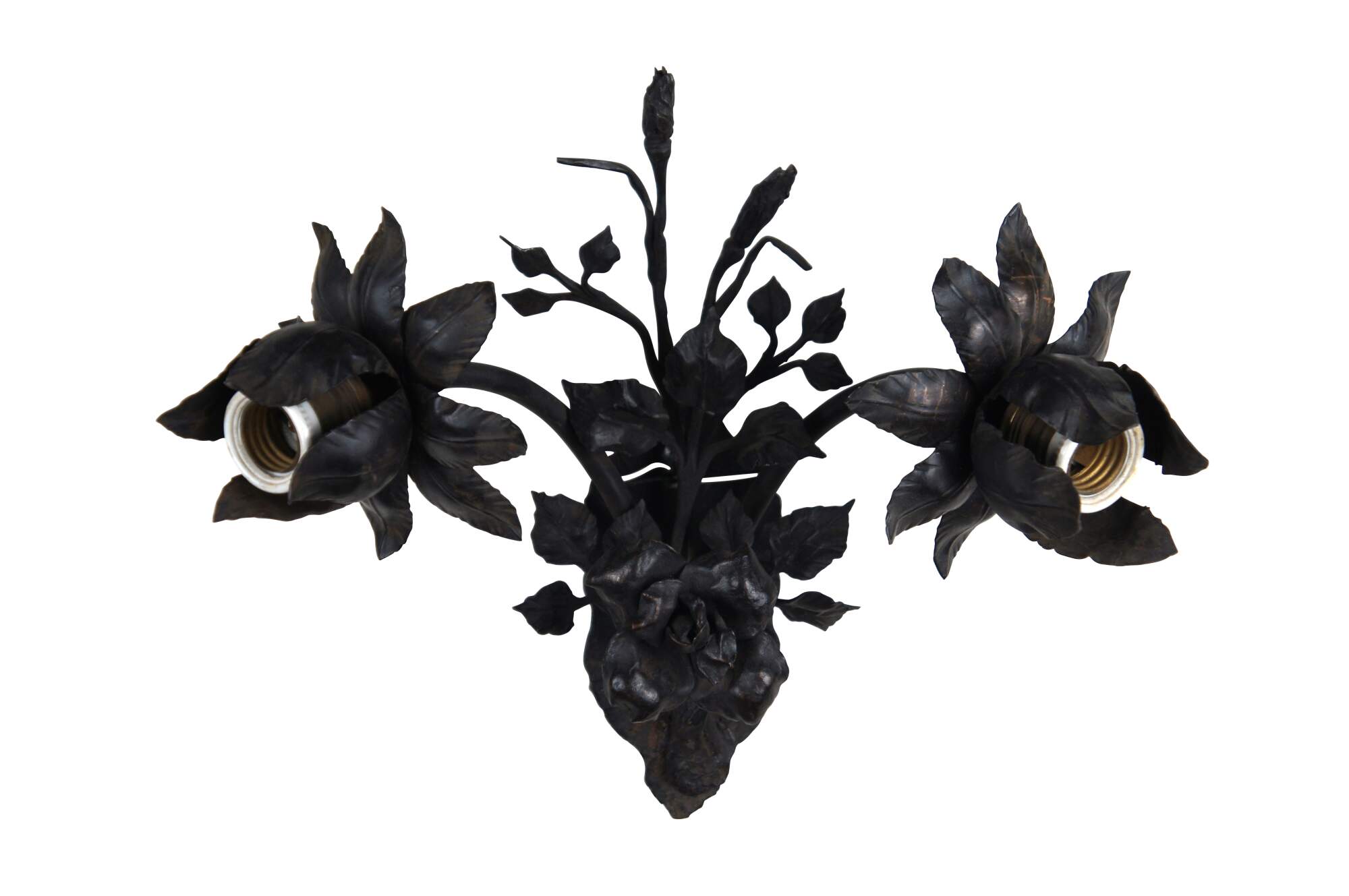 Pair of vintage iron two light electric wall sconces in the shape of cut roses with a subtle dark bronze finish.