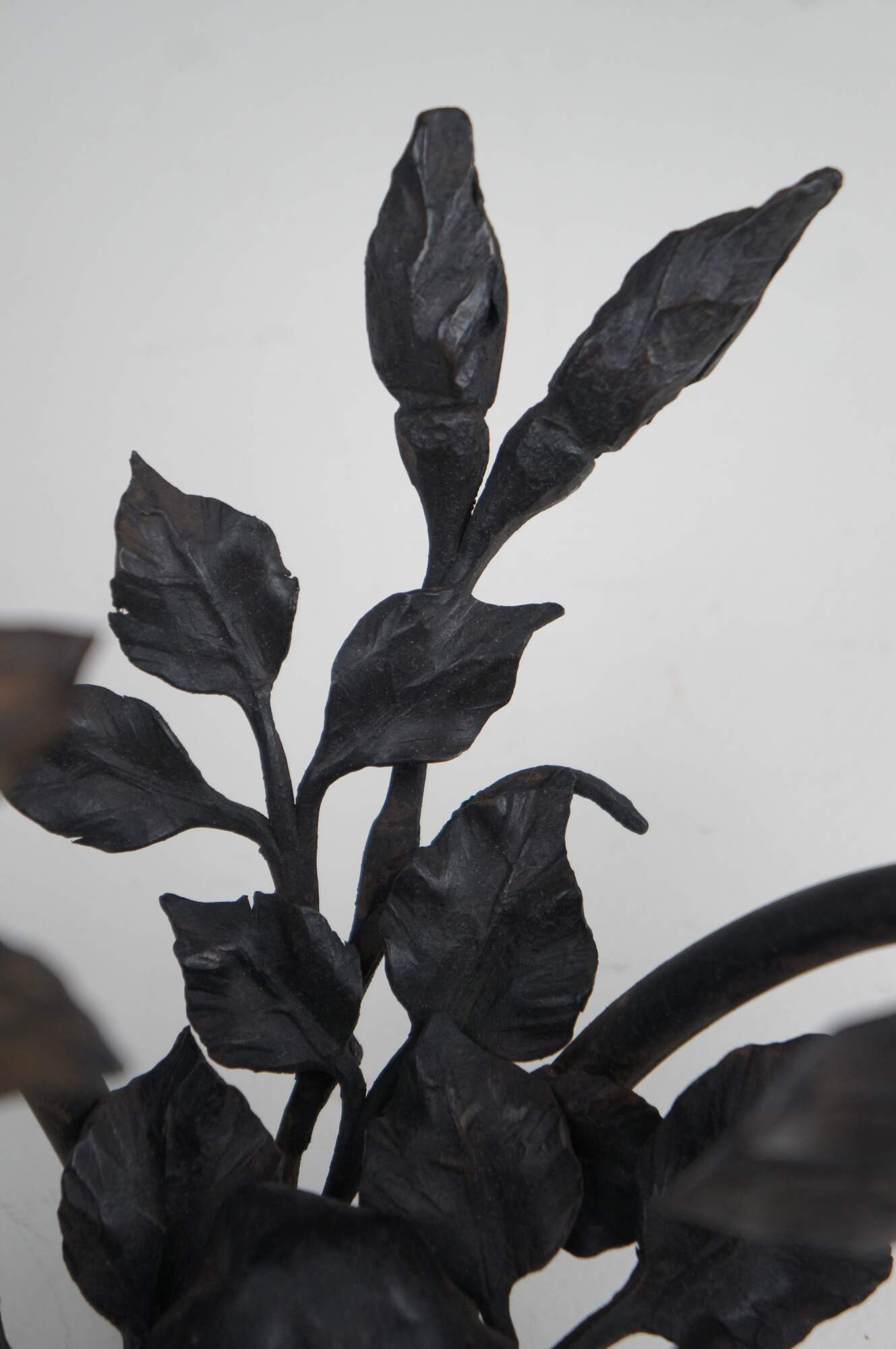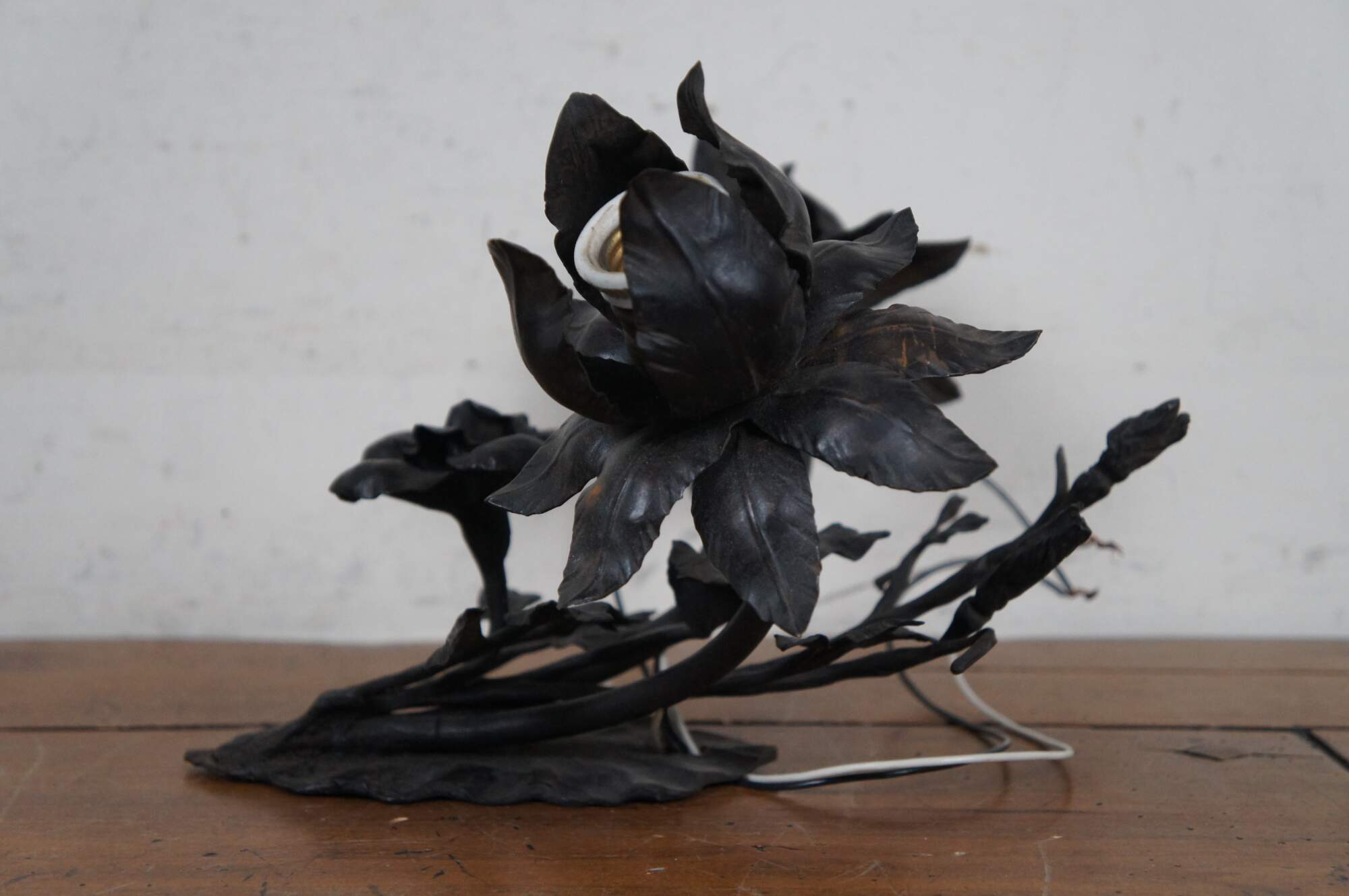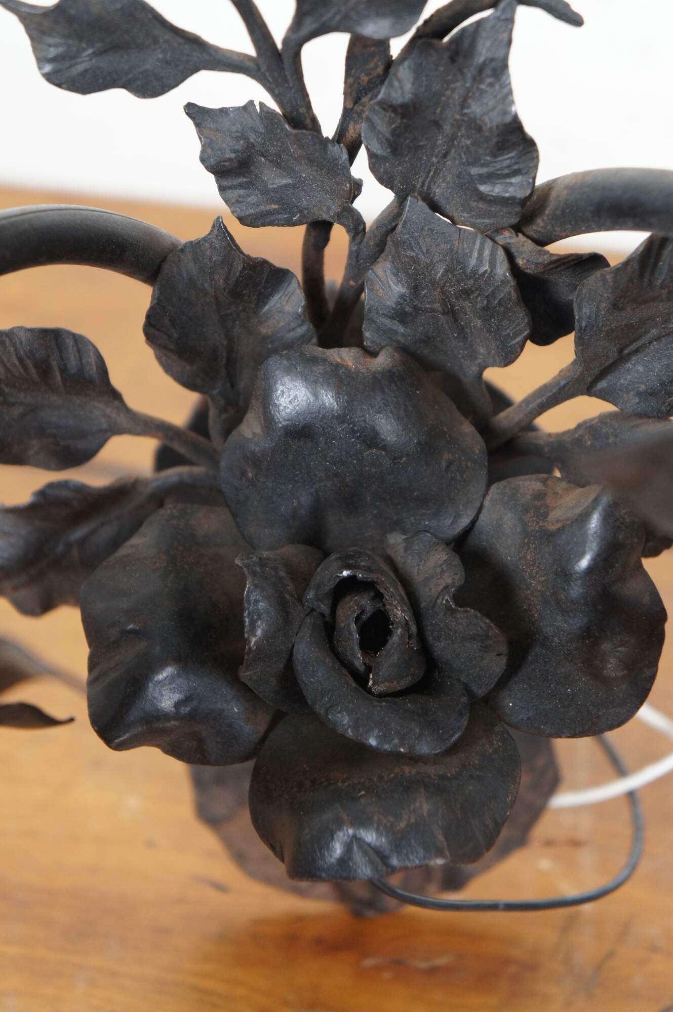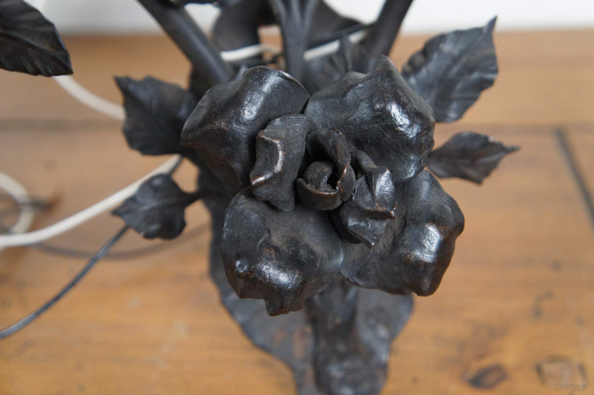 Pair of vintage iron two light electric wall sconces in the shape of cut roses with a subtle dark bronze finish.