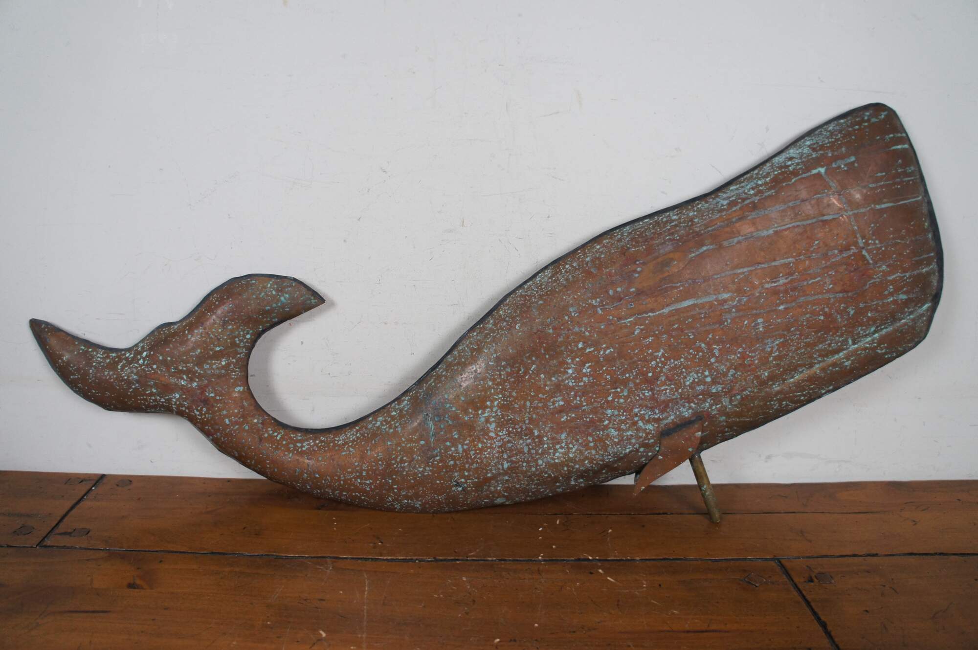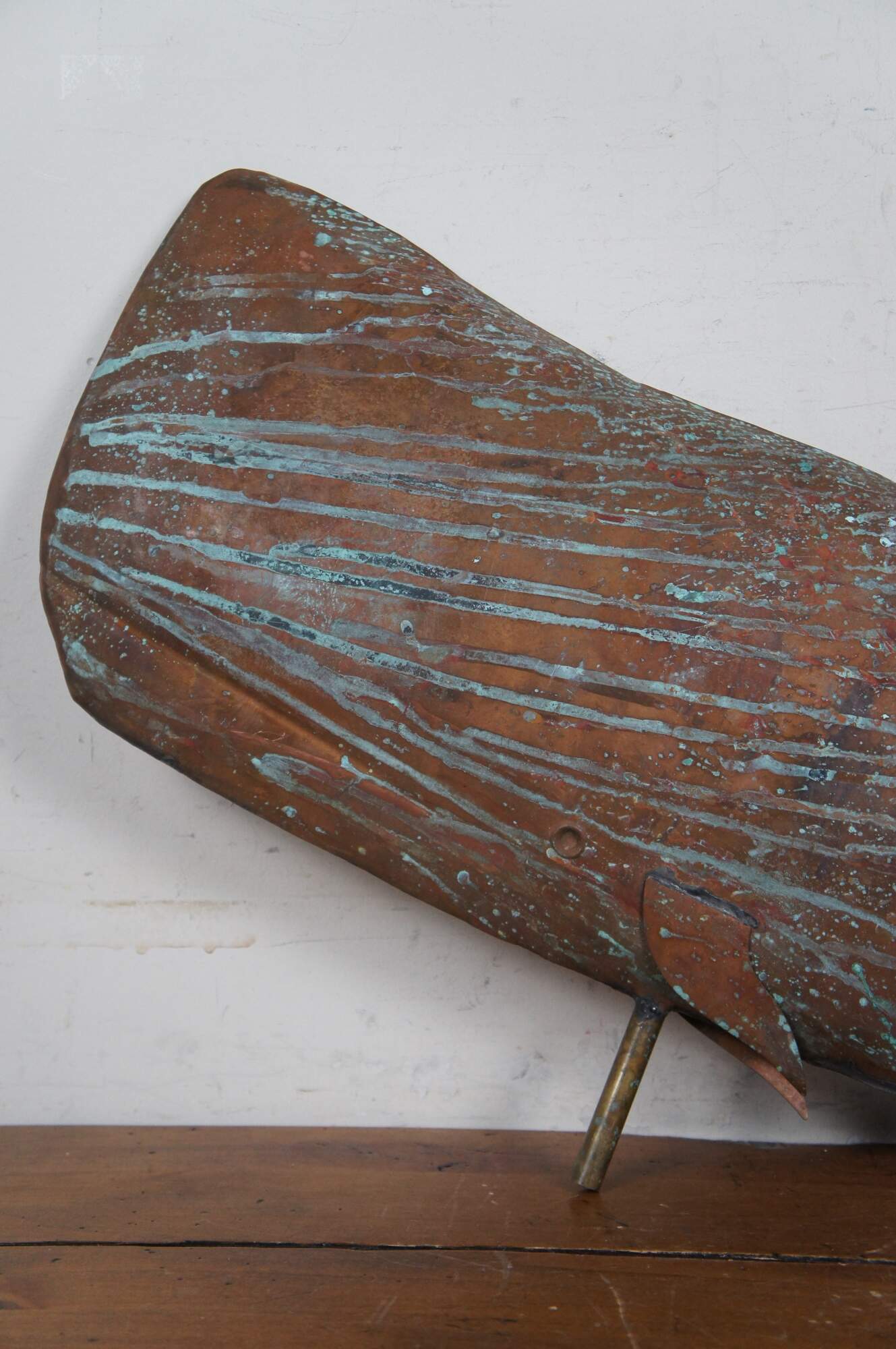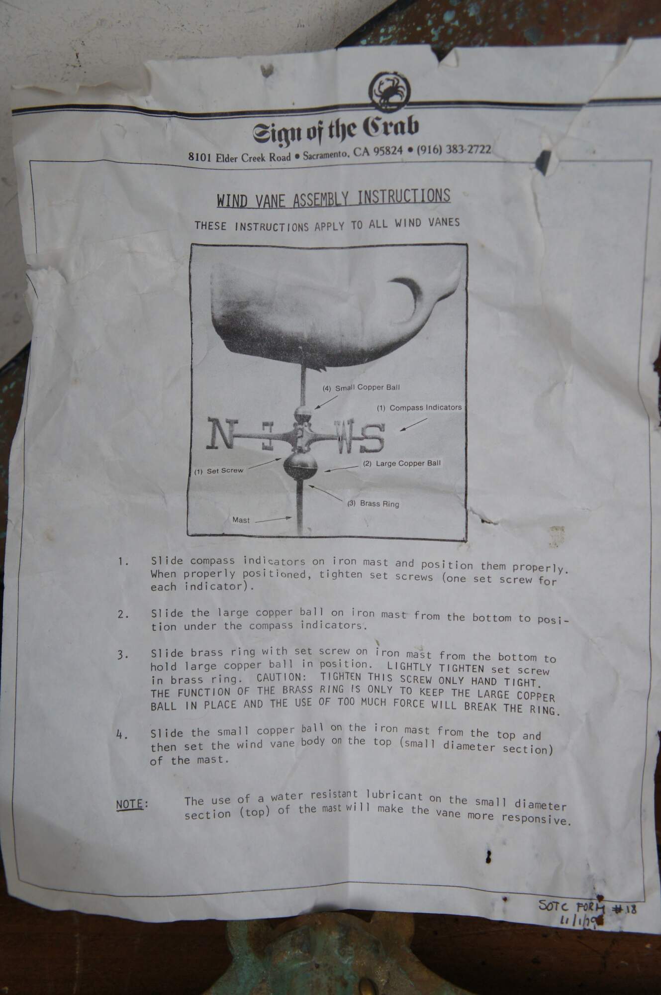 Vintage 1979 iron and copper wind / weather vane by Sign of the Crab. Features traditional cardinal directions in gilded iron, framed by a pair of graduated copper balls and topped with a hollow copper sperm whale. Includes instructions and brass mounting ring for base. Does not include central iron rod.