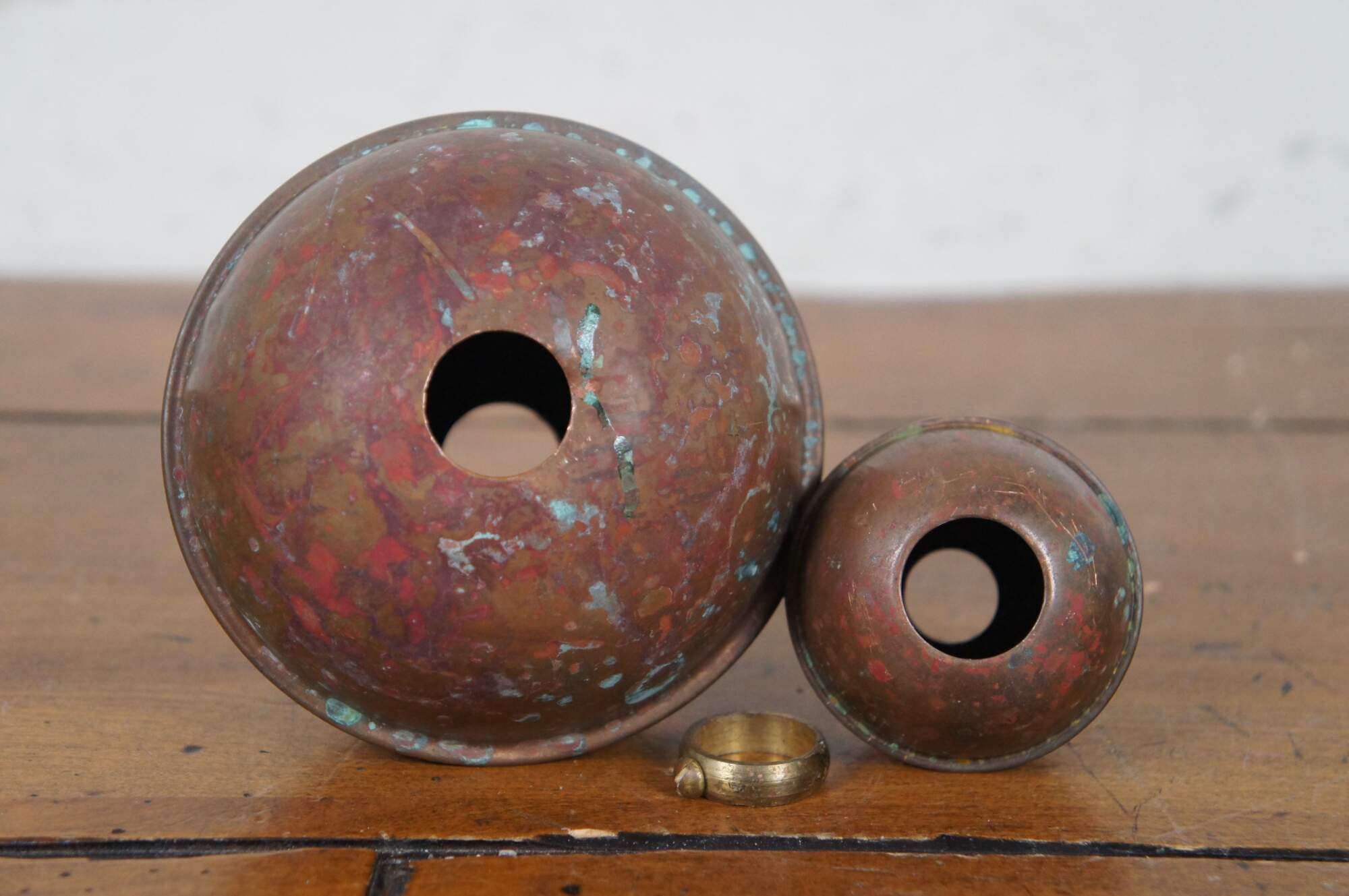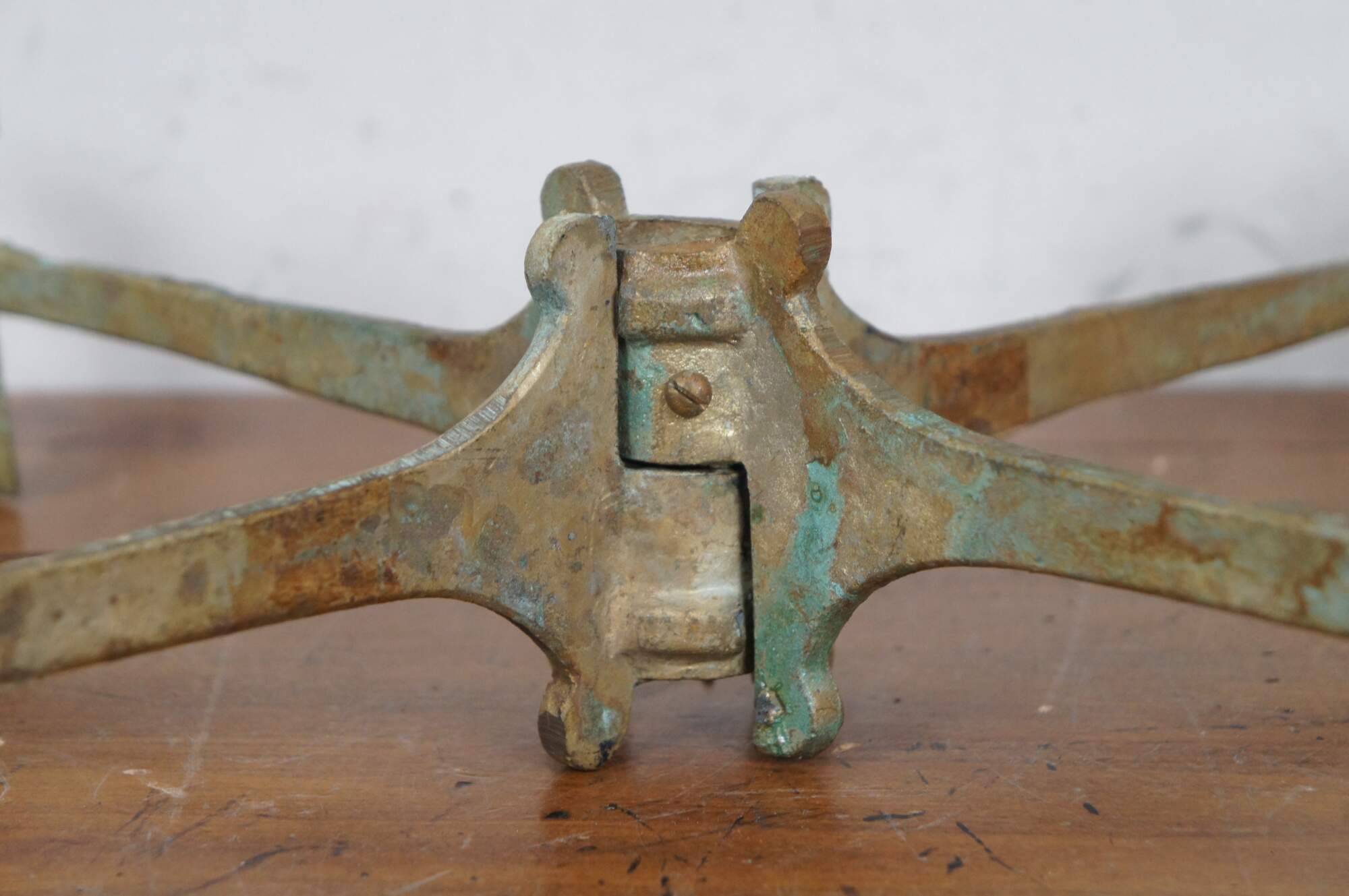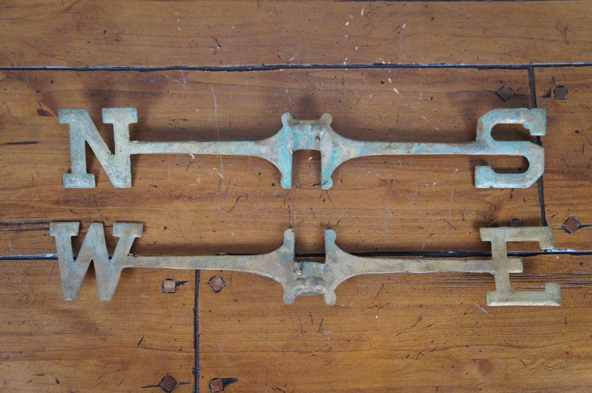 Vintage 1979 iron and copper wind / weather vane by Sign of the Crab. Features traditional cardinal directions in gilded iron, framed by a pair of graduated copper balls and topped with a hollow copper sperm whale. Includes instructions and brass mounting ring for base. Does not include central iron rod.