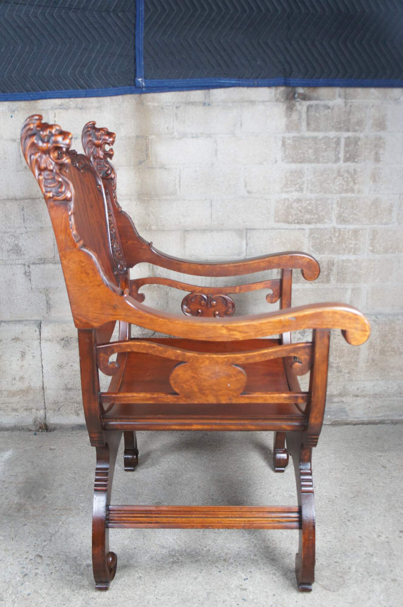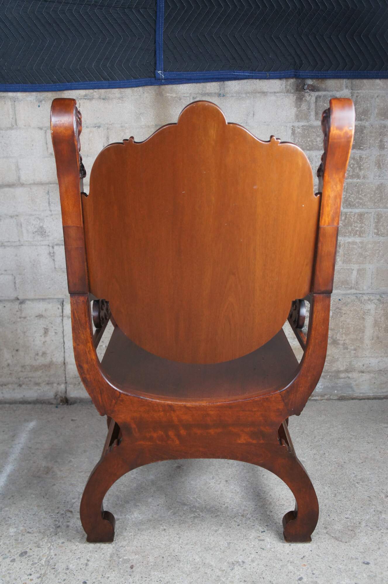 Antique Renaissance Revival throne armchair. Made of mahogany featuring curule / savonarola styling with carved lion head finials flanking a shield shaped back with shell crest and floral / acanthus accents, supported by curved seat over serpentine legs. Includes cushions.