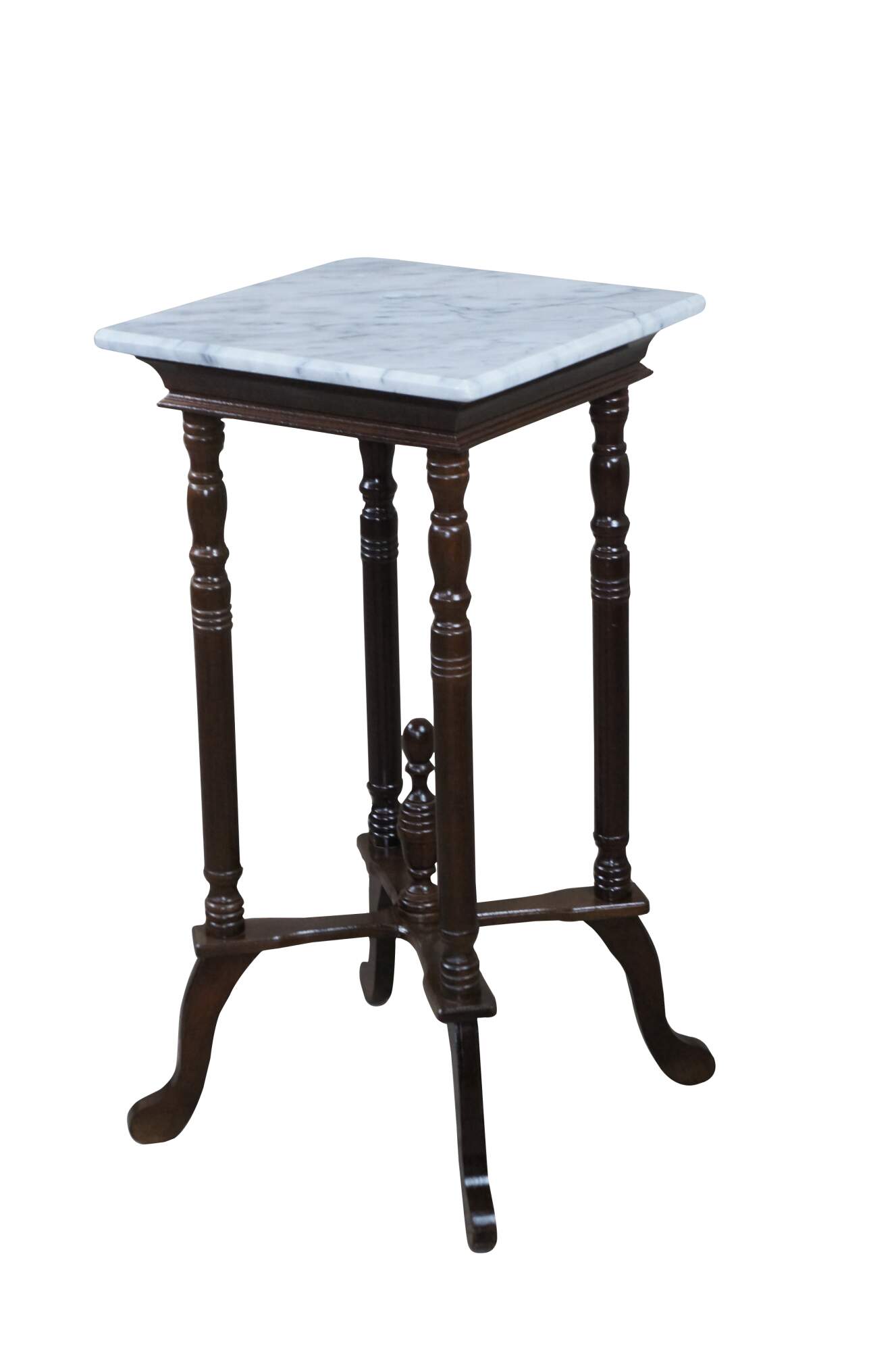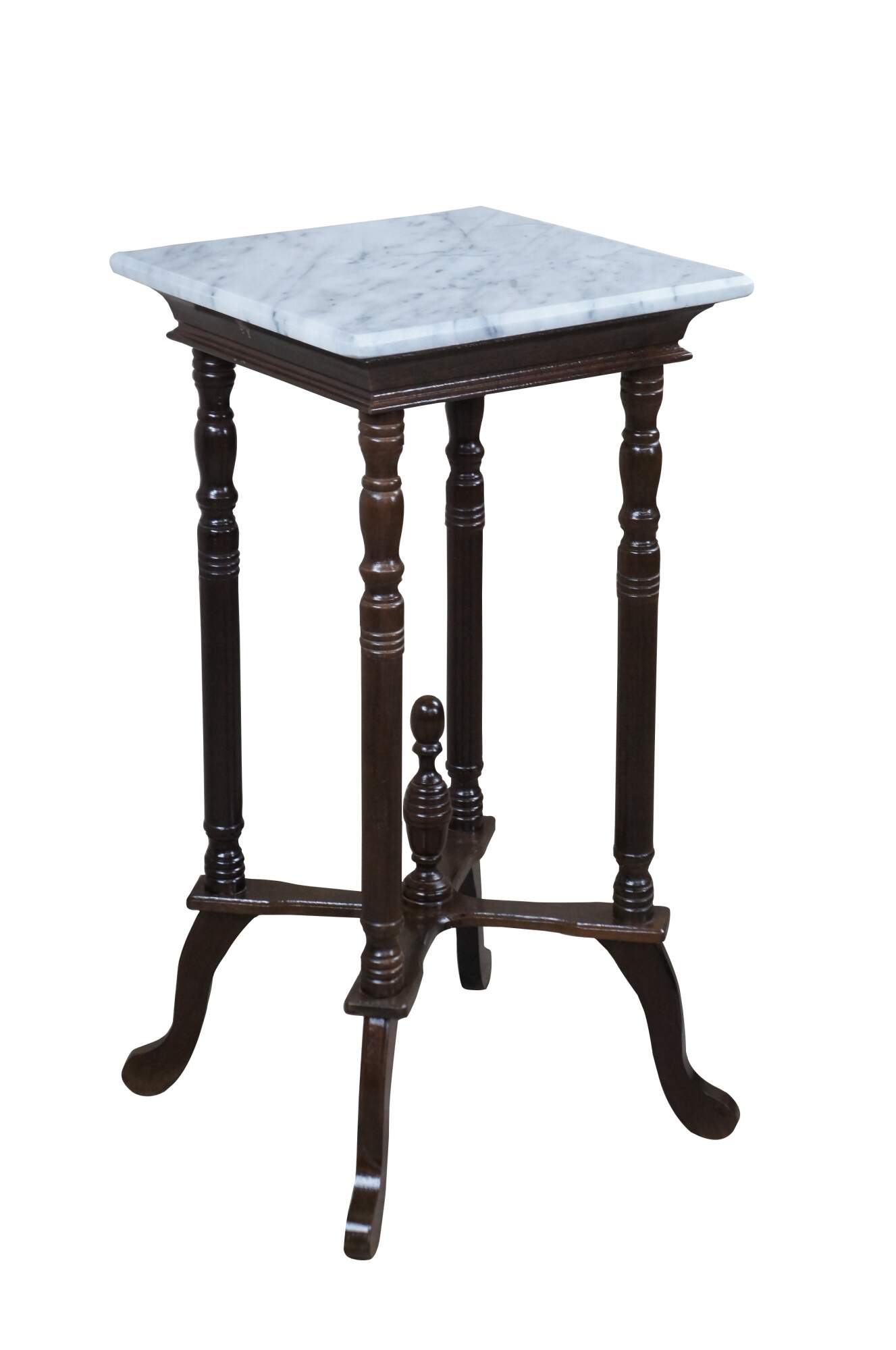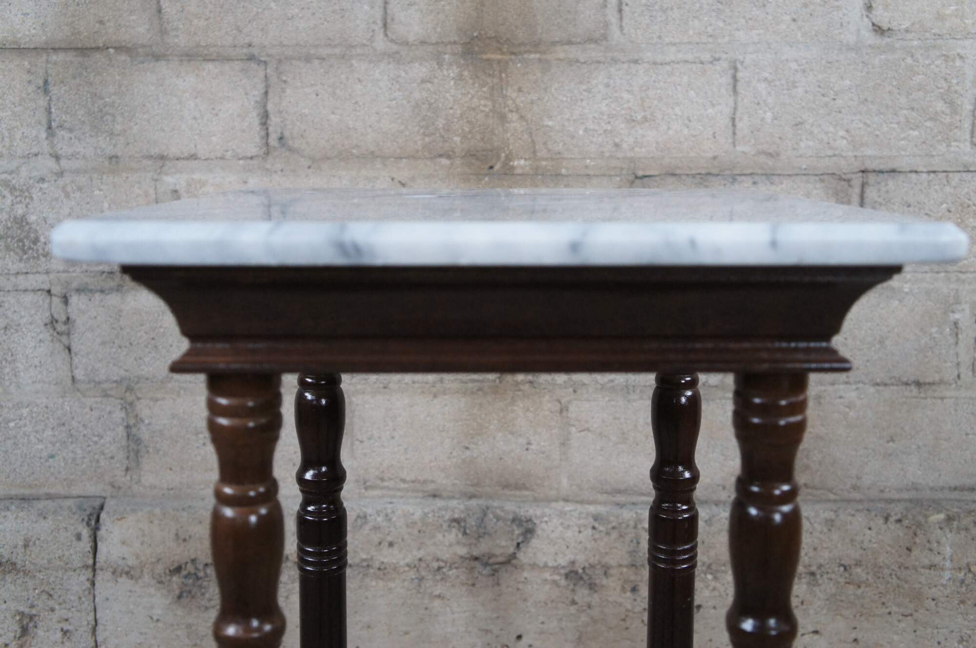 Vintage Victorian Revival pedestal side table or plant stand finished in mahogany with square white marble top, turned posts and upward finial.