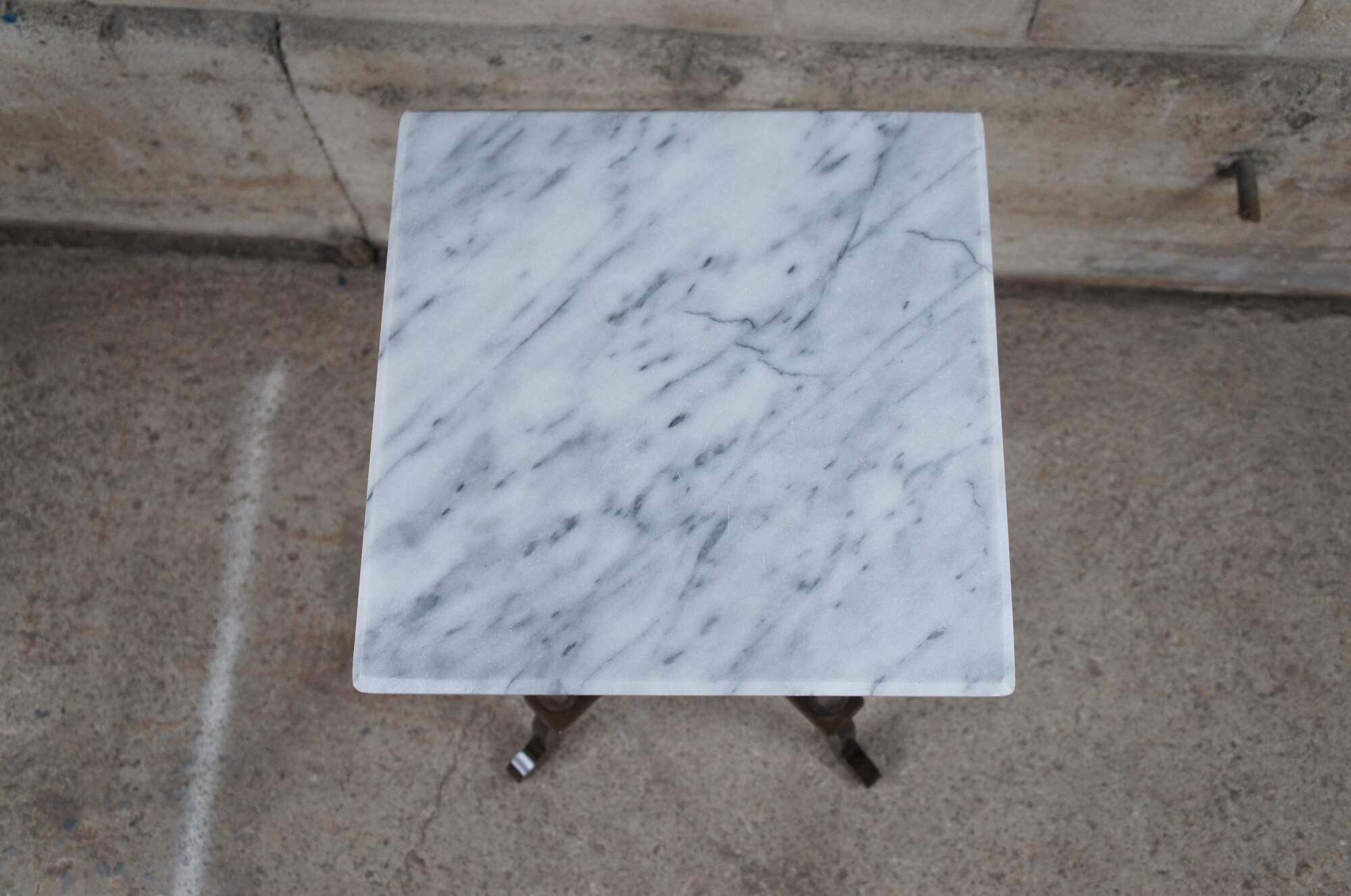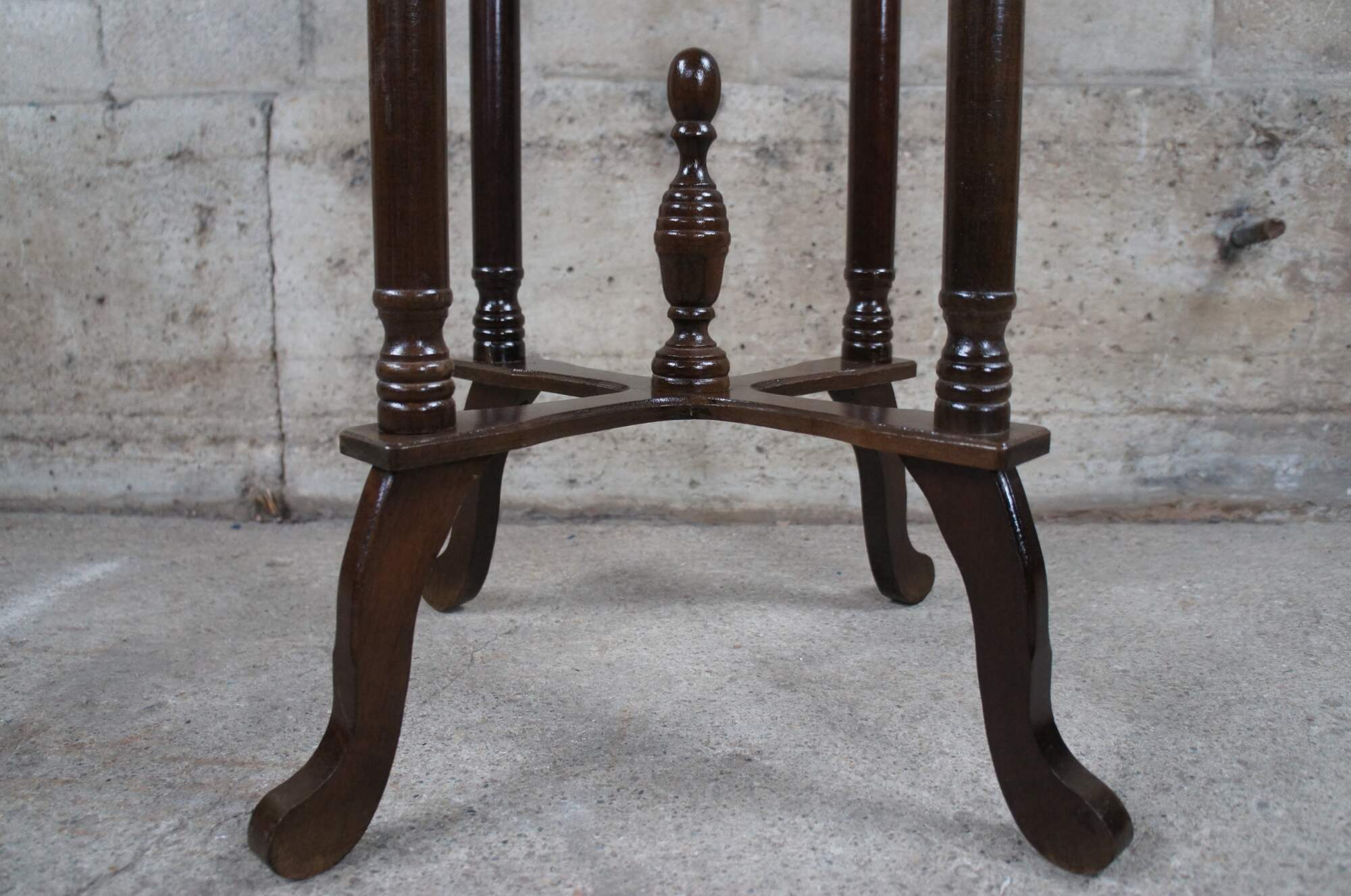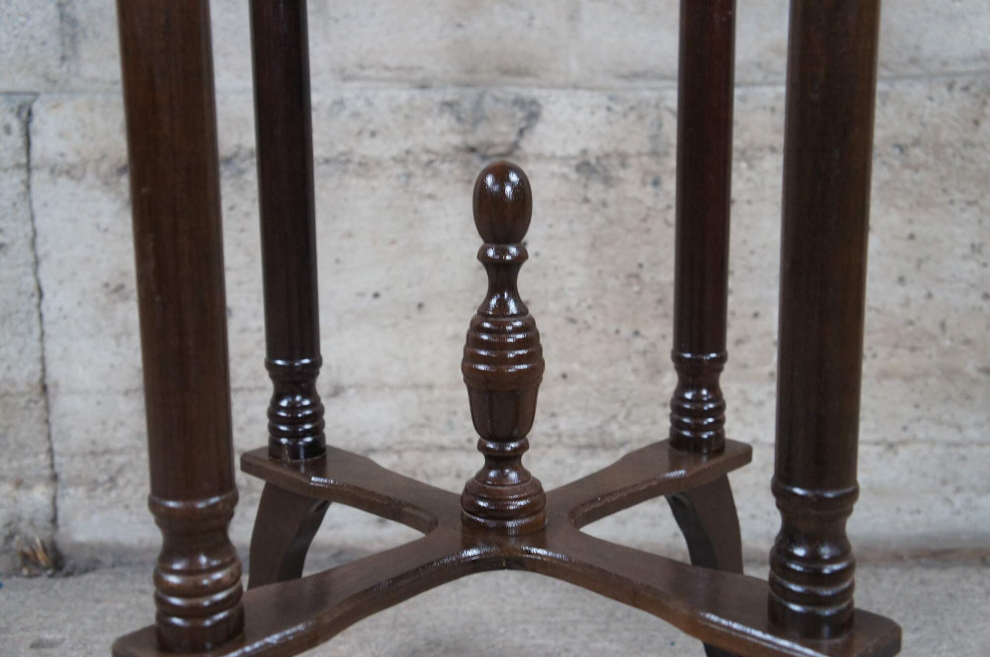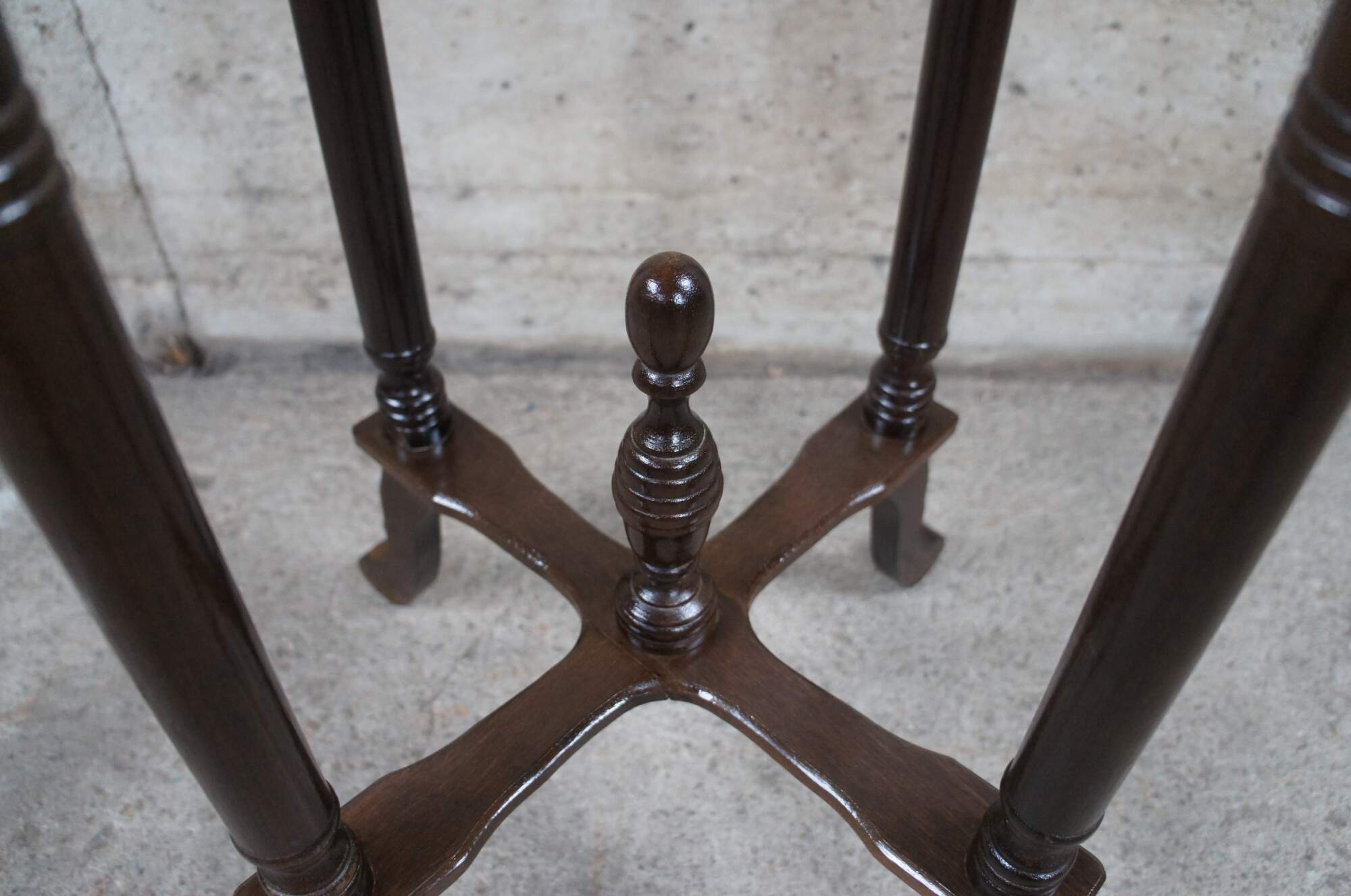 Vintage Victorian Revival pedestal side table or plant stand finished in mahogany with square white marble top, turned posts and upward finial.