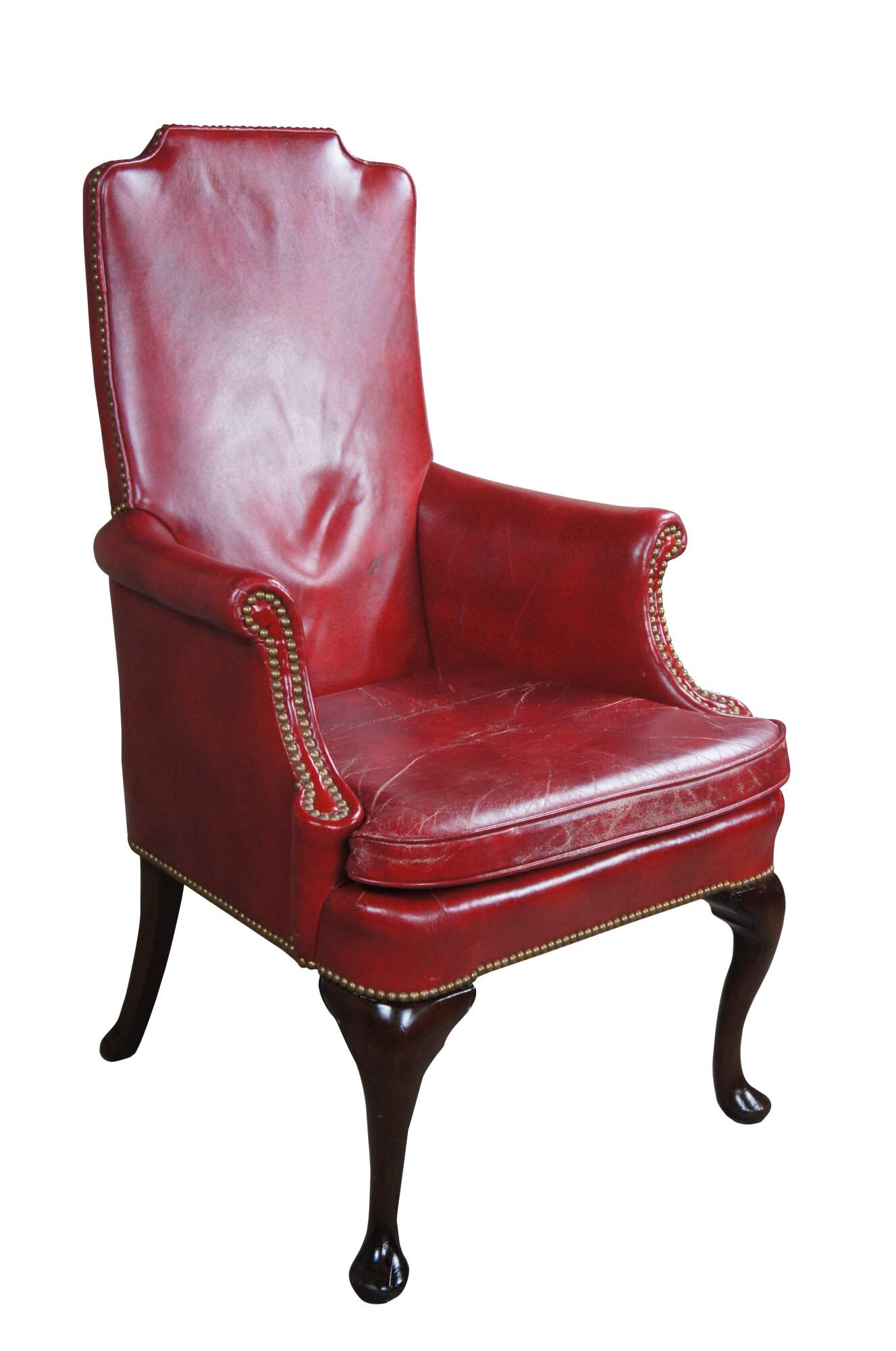 Vintage Hickory Chair red leather library reading or desk armchair featuring Queen Anne styling with high rolled arms, nailhead accents and serpentine slipper feet.