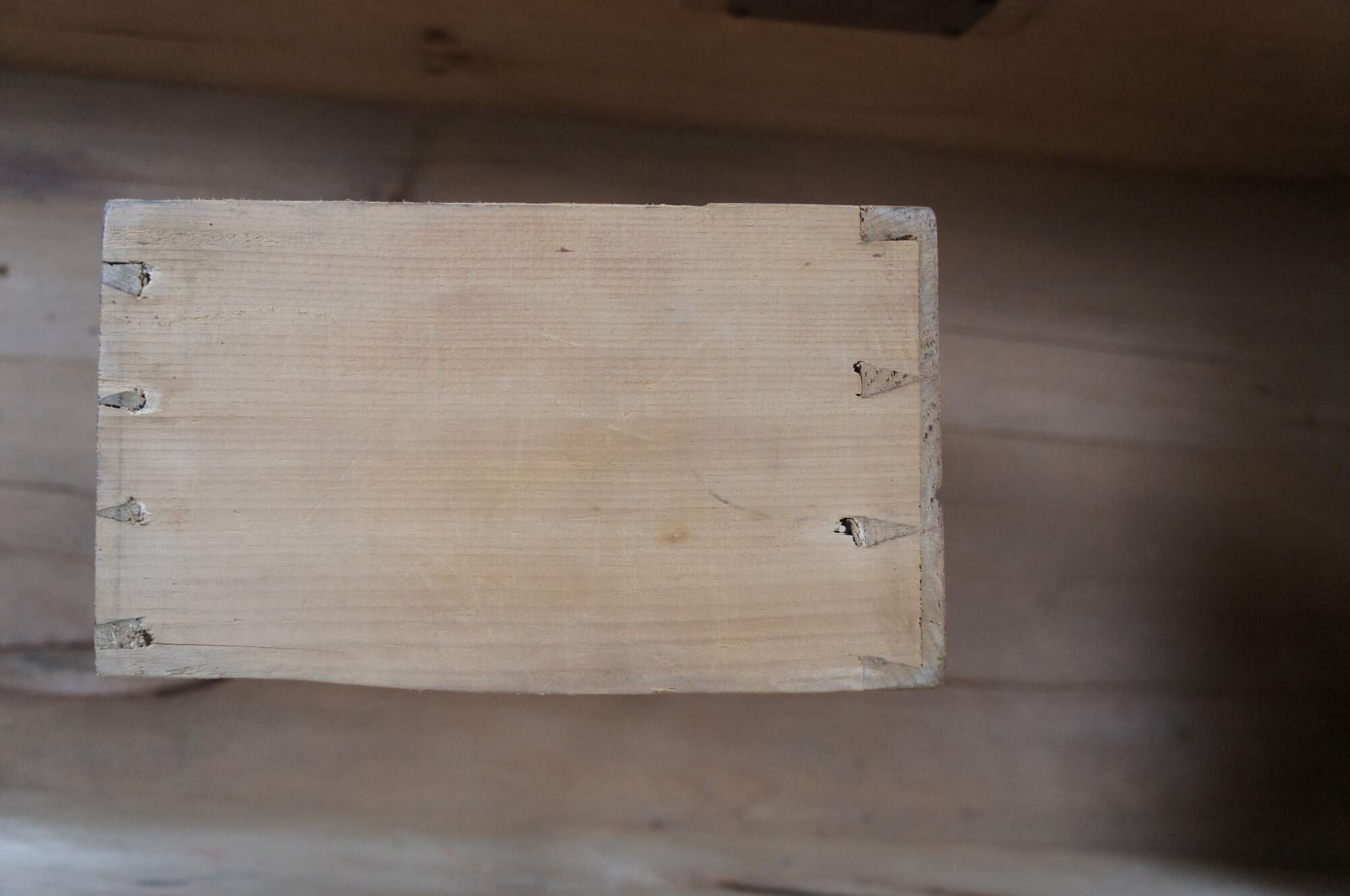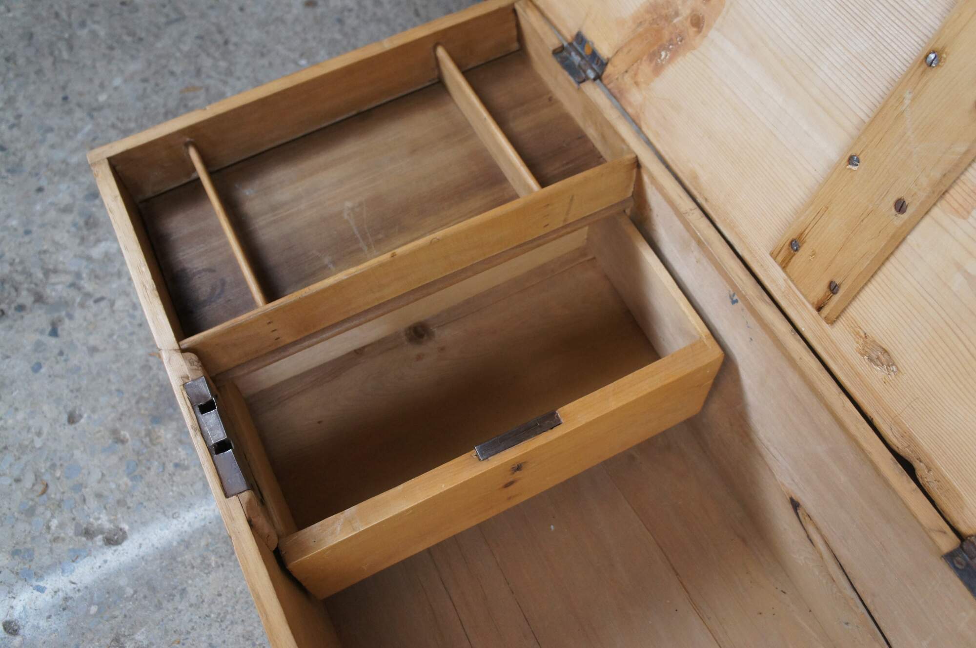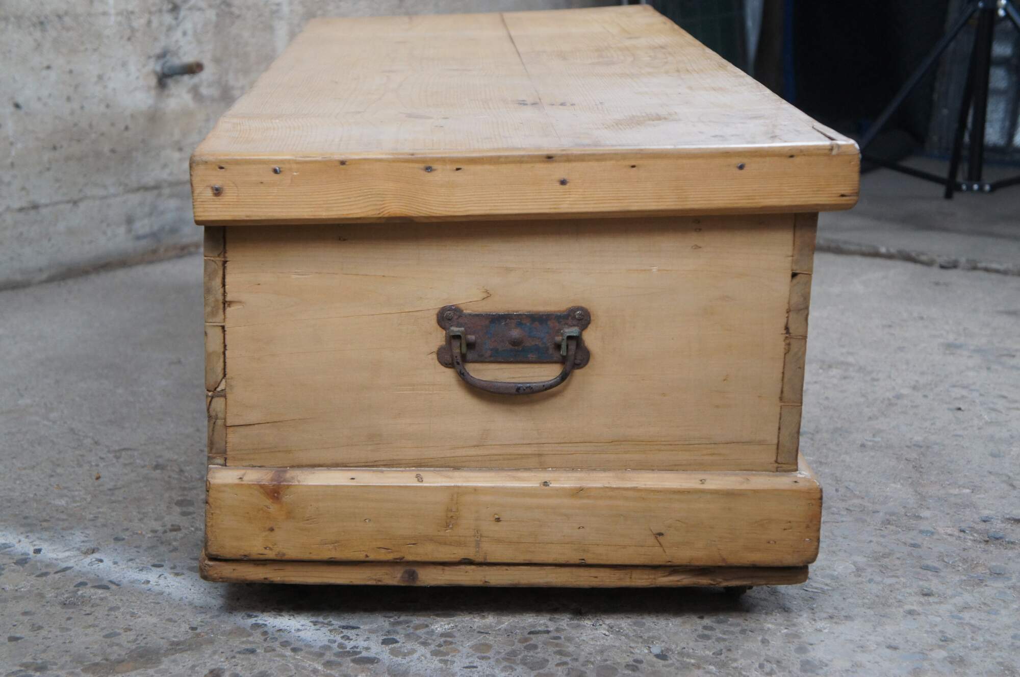 Antique 19th century English storage trunk / chest / coffer. Made of pine featuring rectangular form with hand dovetailed joinery, iron handles, and unique three lock design which opens to a divided storage above a forth locking drawer.
