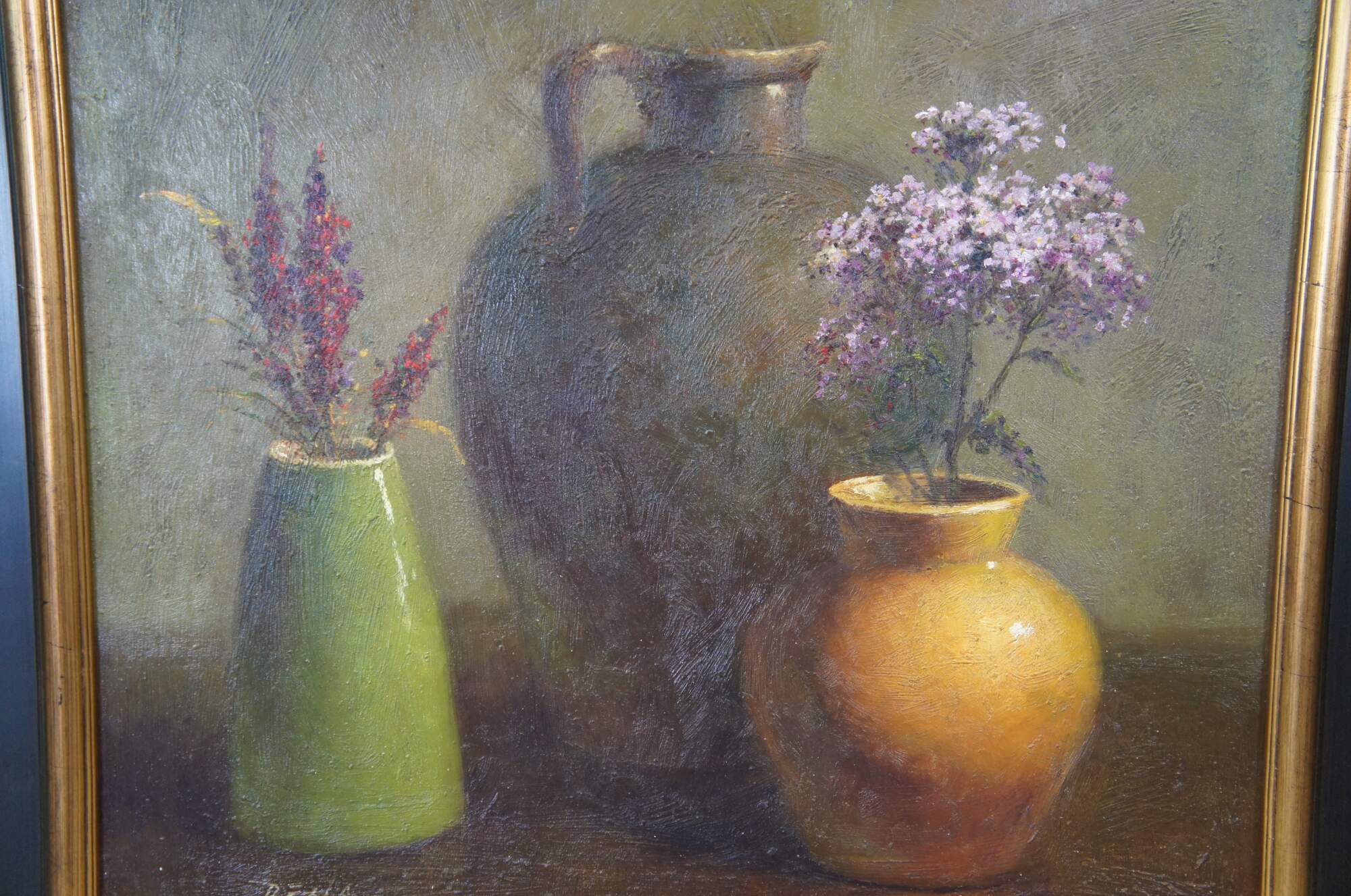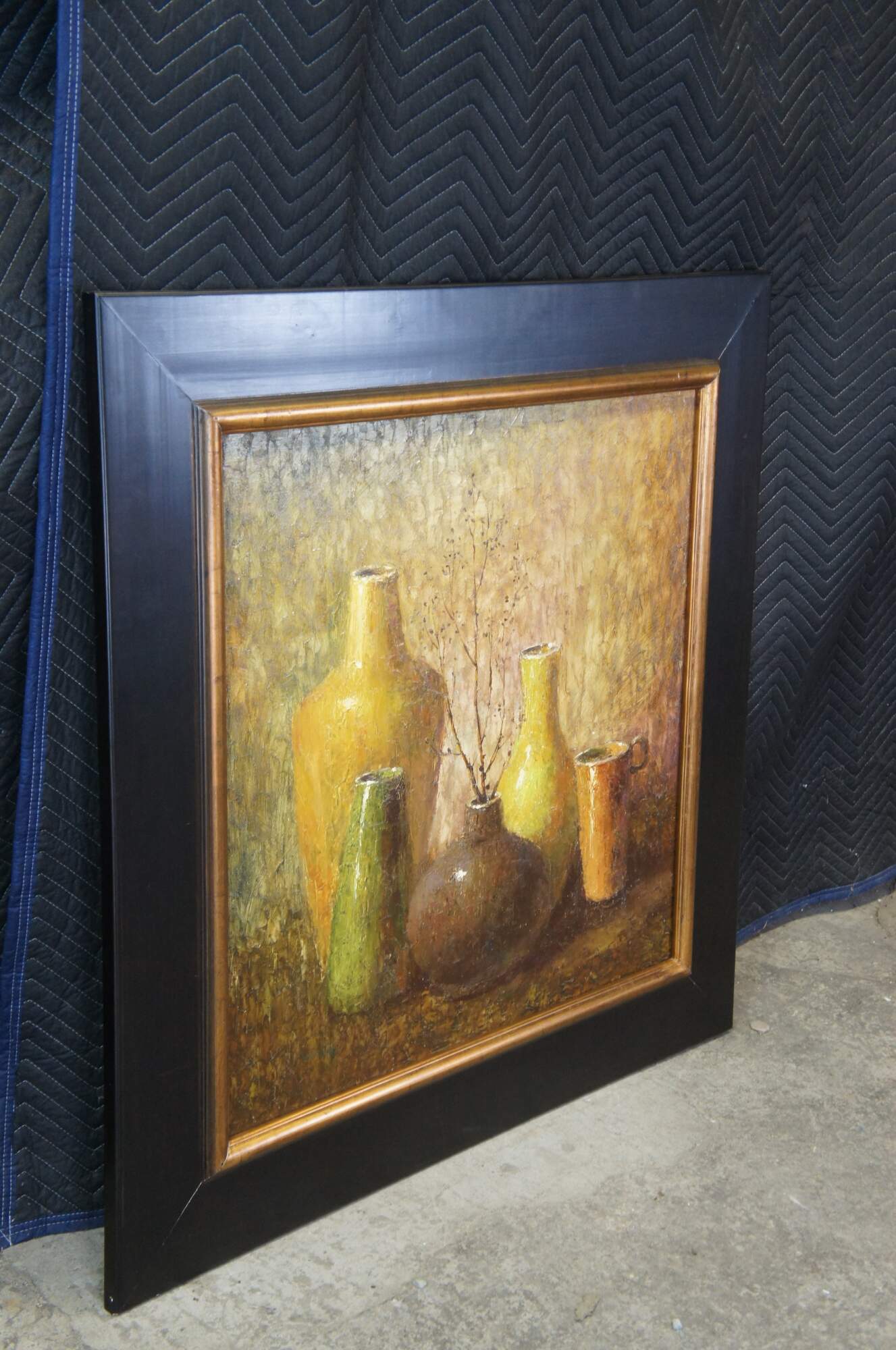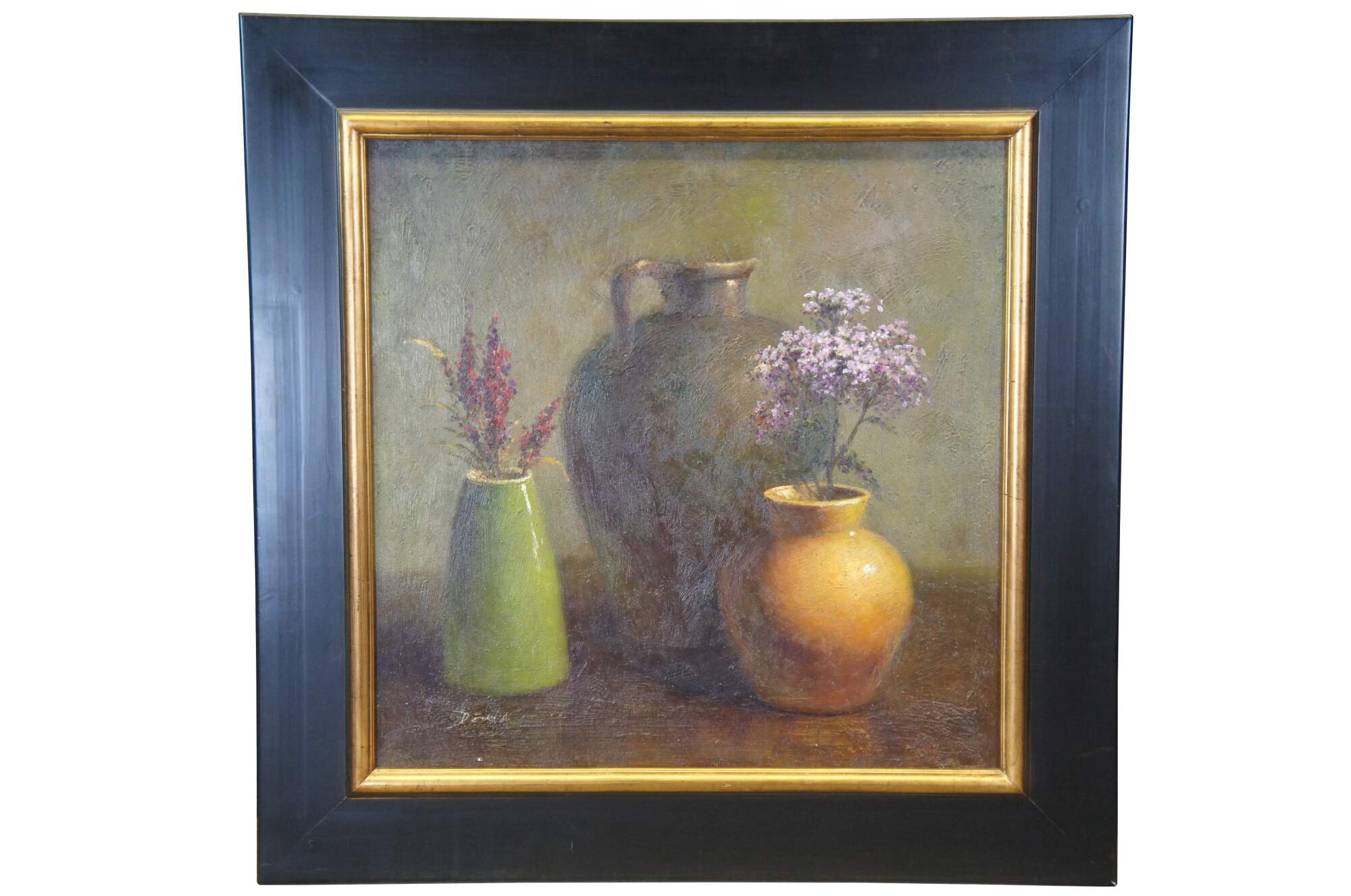 Set of 3 realist oil paintings on canvas, circas 1990s. Each painting features a southwestern pottery scene with vases and jars. signed by Delia lower left. The paintings are framed in pine with a dark wood tone and gold trim. Each painting Includes a COA from Timeless Tresures