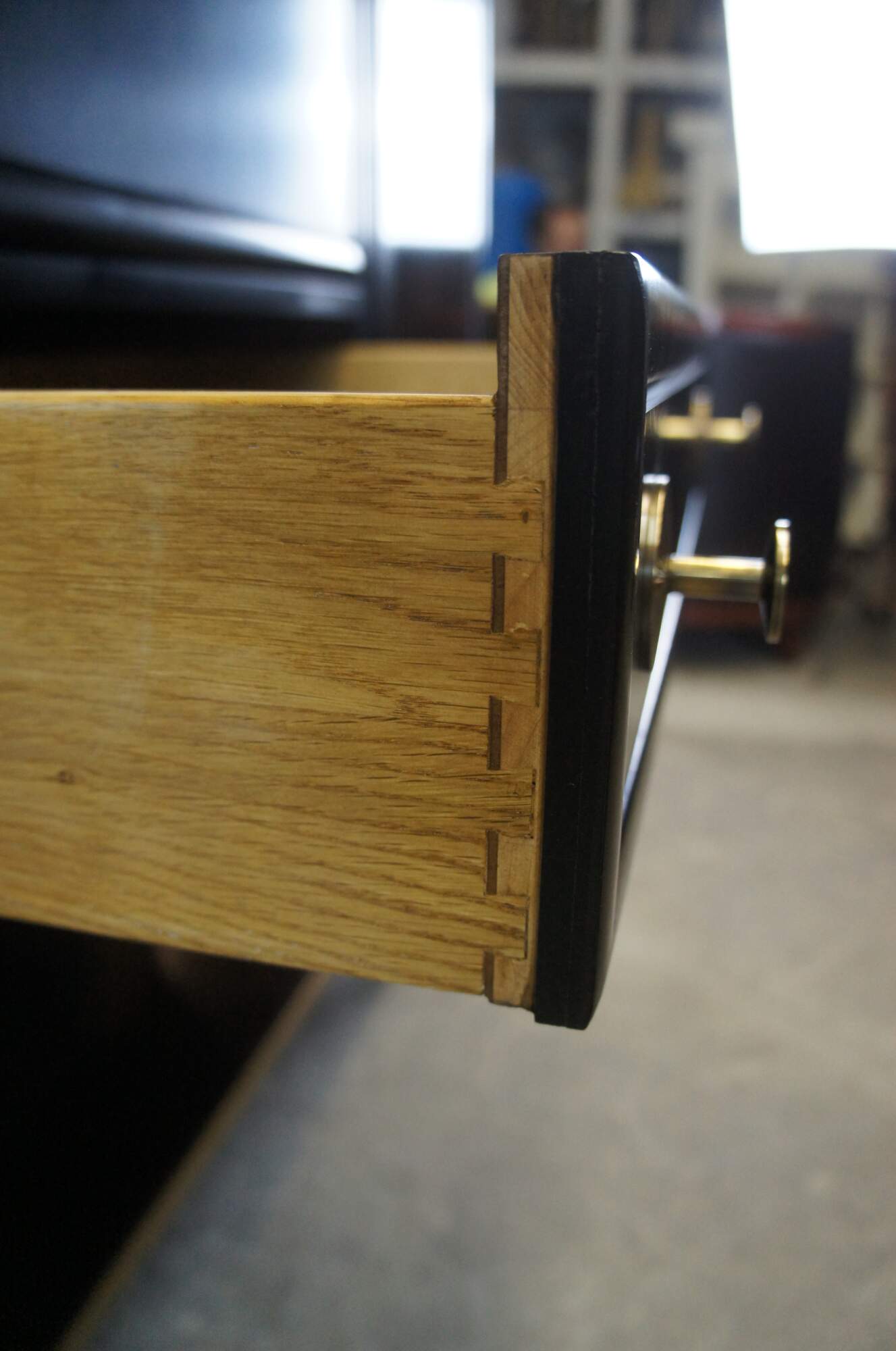 Walnut and ebony veneers and brass hardware dress up this bar, which has a black leather-inset top. In addition to the side door and dovetailed oak drawer with liner, there's a pulldown hatch with a mirrored interior for bottle or glassware storage. The cast brass pulls along the front offer a nice Art Deco touch. Includes removable wheels for ease of movement. Versatile size makes it perfect for use as a drybar or buffet.