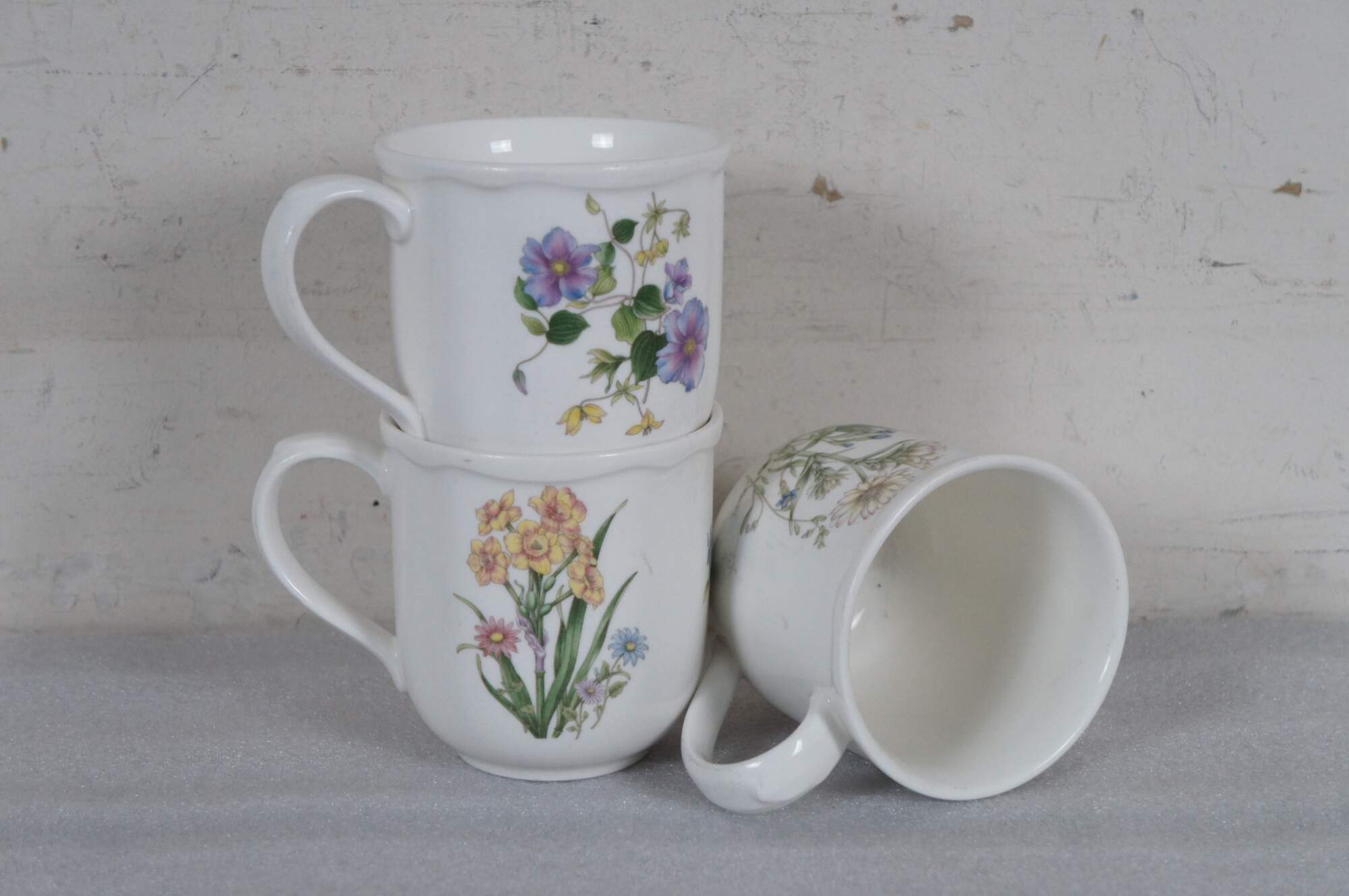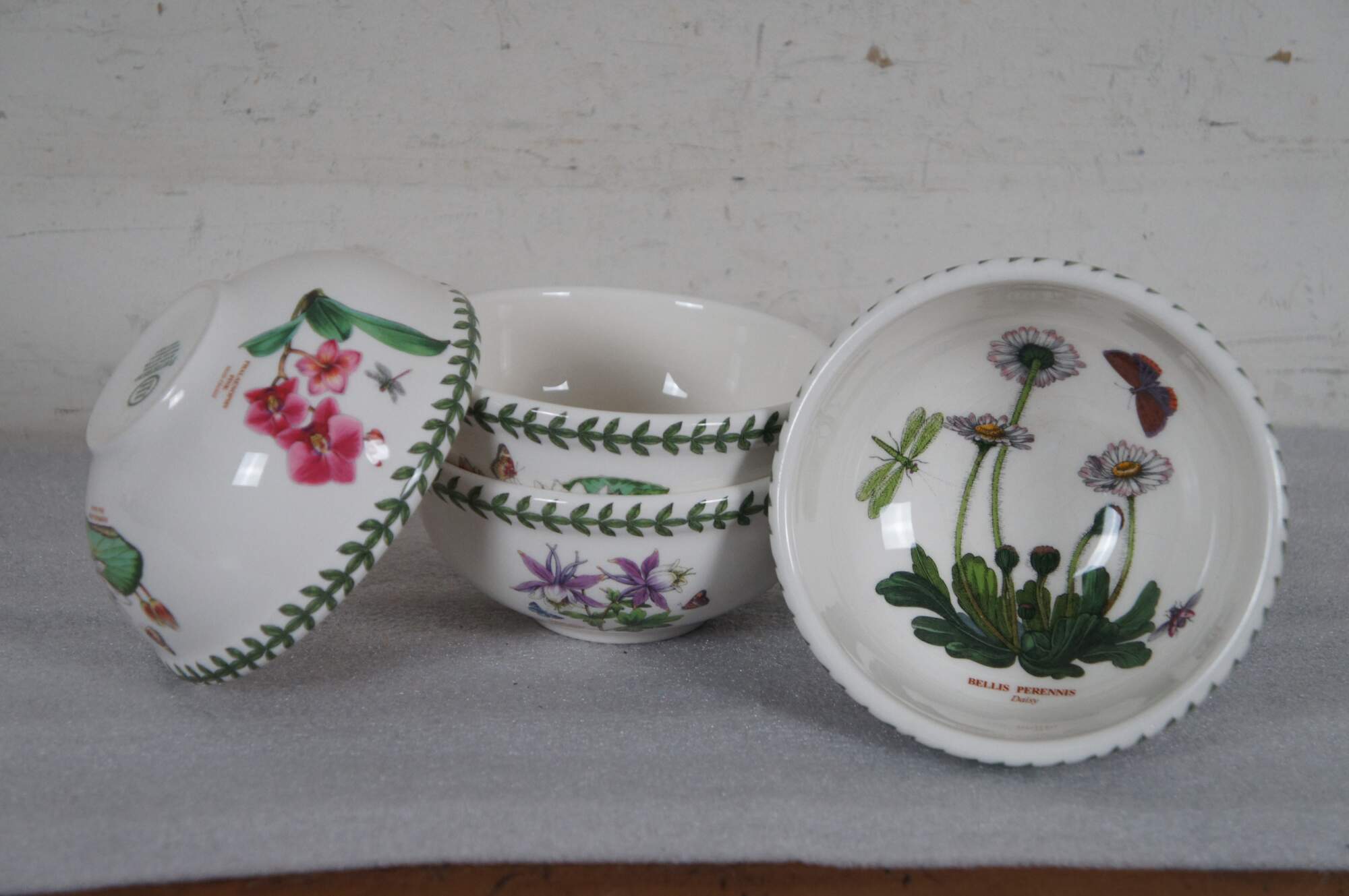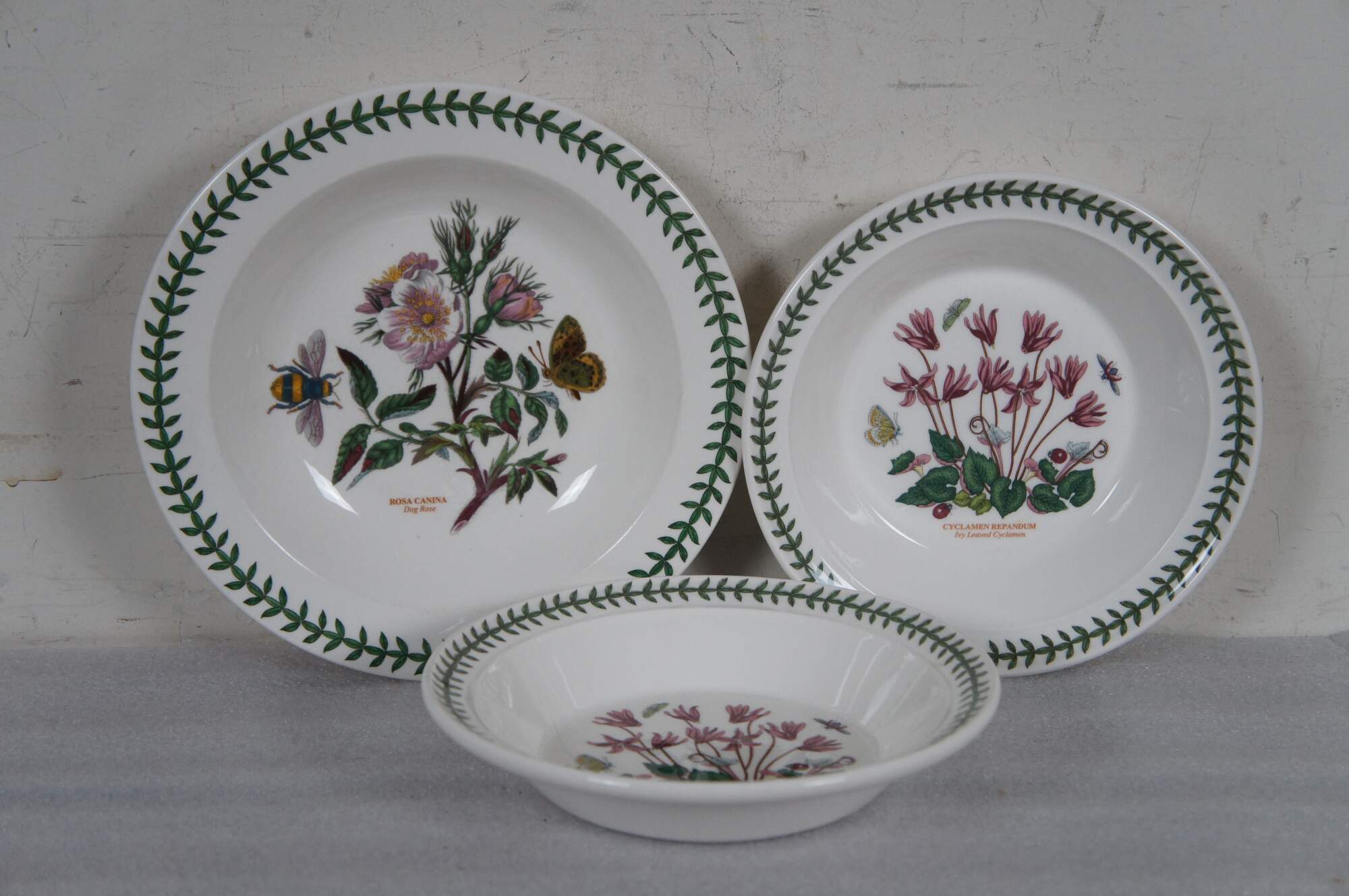 Vintage 42 piece dinnerware / china set by Portmeirion in the Botanic Garden pattern designed by Susan Williams-Ellis, containing pieces purchased at several different times. This pattern is distinguished by a wide variety of botanical illustrations labeled with the common and scientific names of the plant, and borders of leaves around the edges. Married into this set are also a couple plates in Portmeirion's Pomona pattern and mugs from Noritake's Casual Gourmet line, in the Gourmet Garden pattern 7940, both of which strongly resemble the Botanic Garden design.